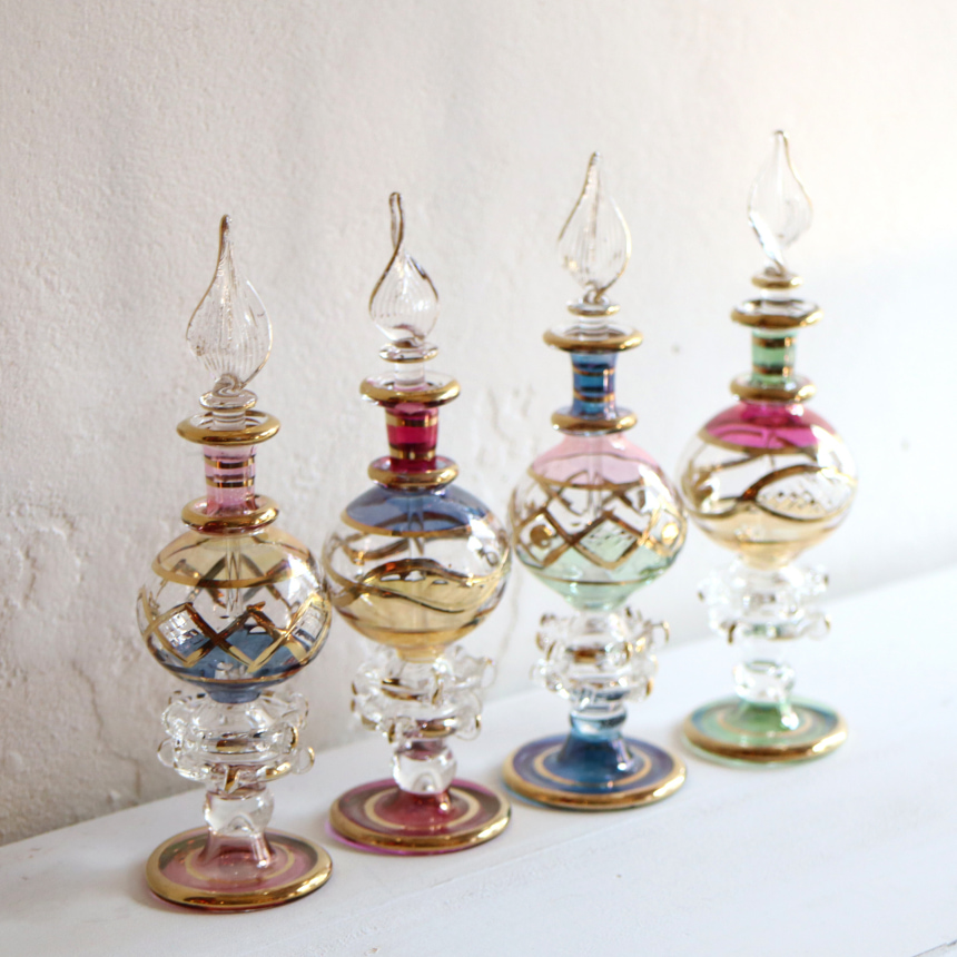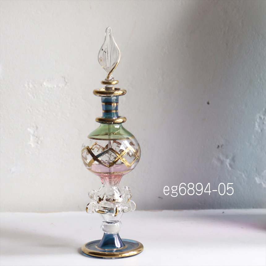 ガラス発祥の地と言われるエジプトは、現在でもシャンデリア用のガラスビーズをはじめ、クオリティの高いインテリアガラスが作られています。古代から作られてきたといわれるガラスボトルは、きらびやかでエキゾチックなムードたっぷり!切子細工で表現された草花モチーフやゴールドの着彩など小さいながらも職人さんの技が光っています。