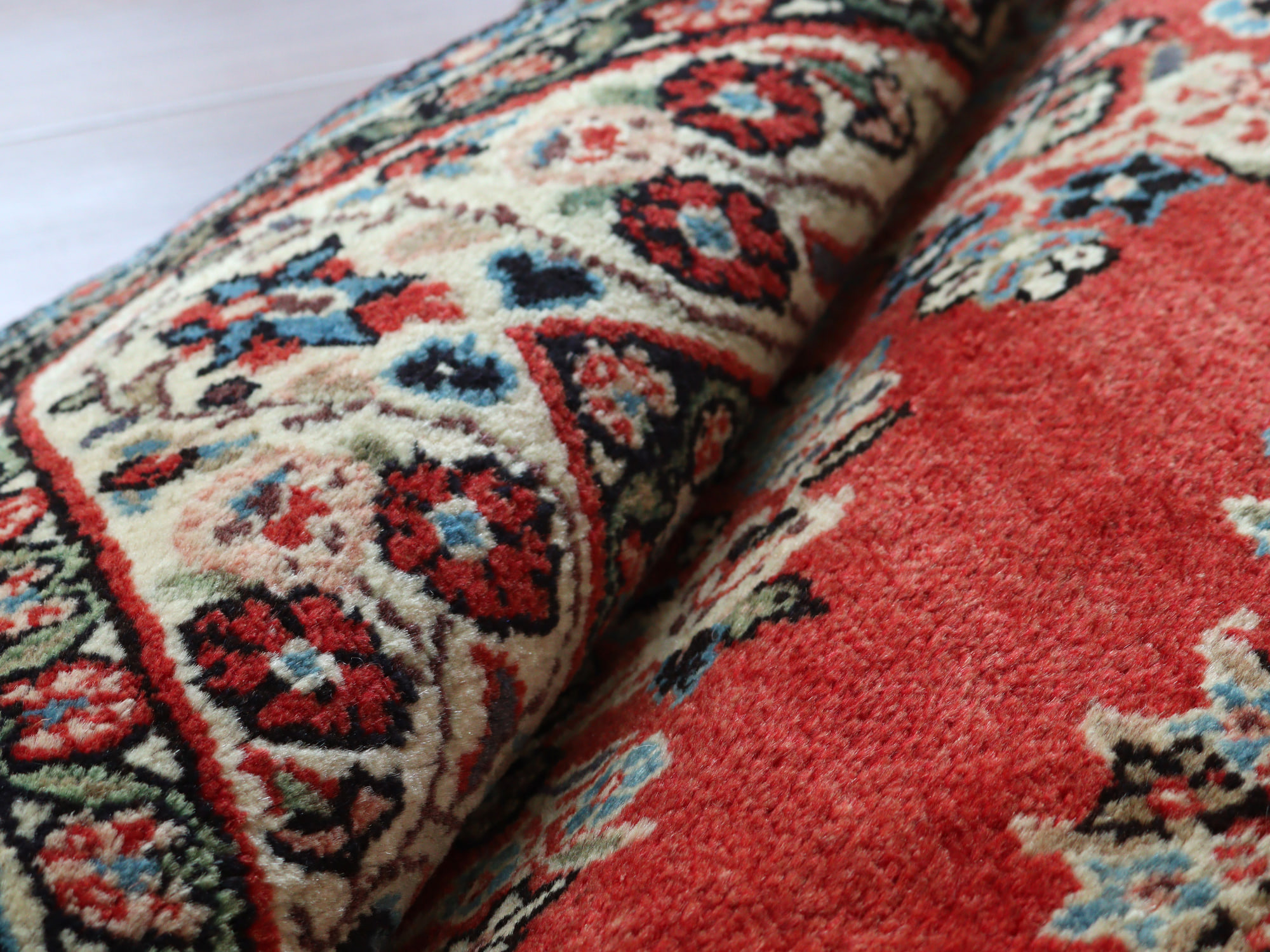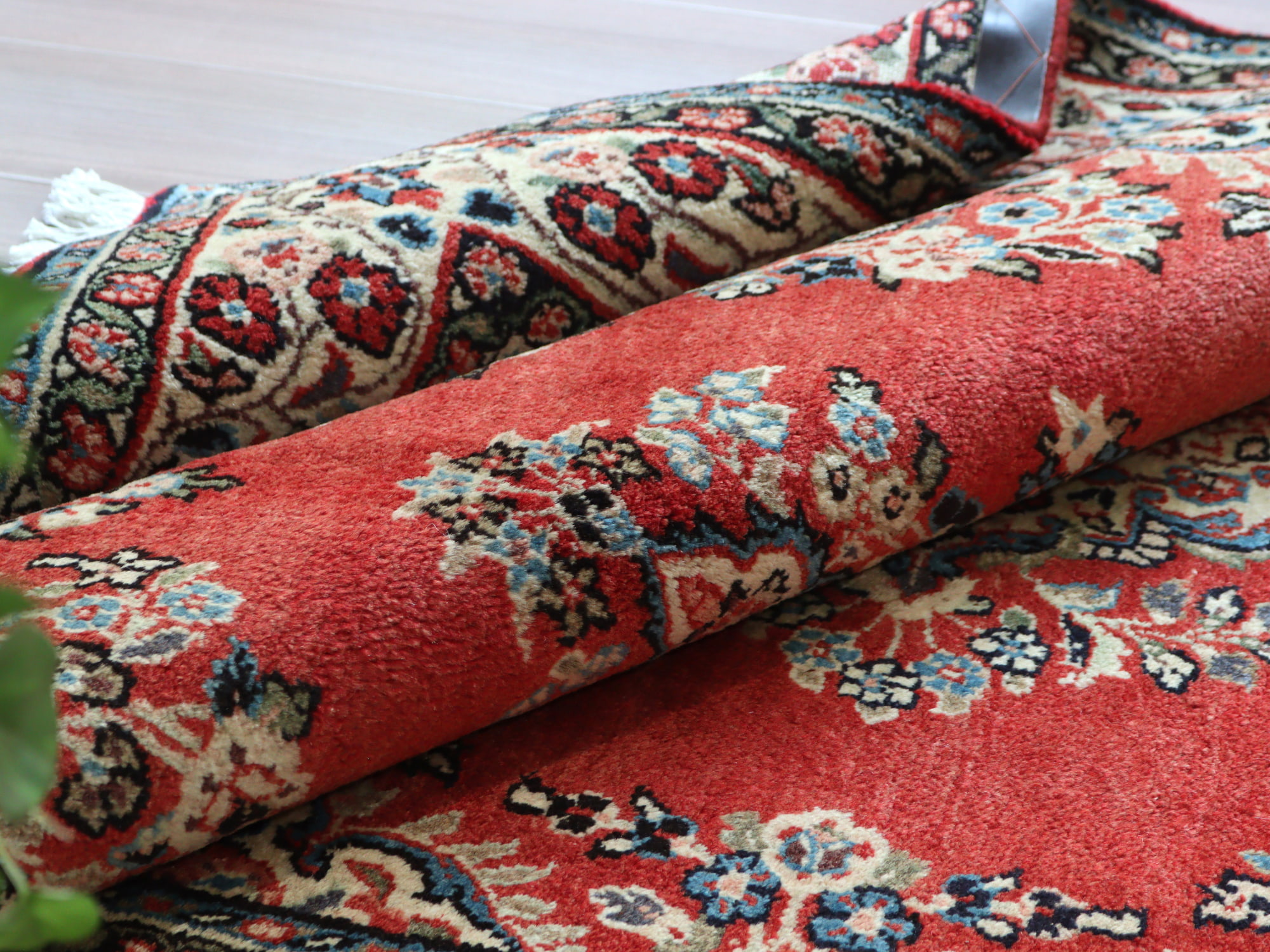縦糸にコットンを使用しています。パイルを含めた絨毯の厚みは1.5cm程で、ふっくらとした踏み心地です。