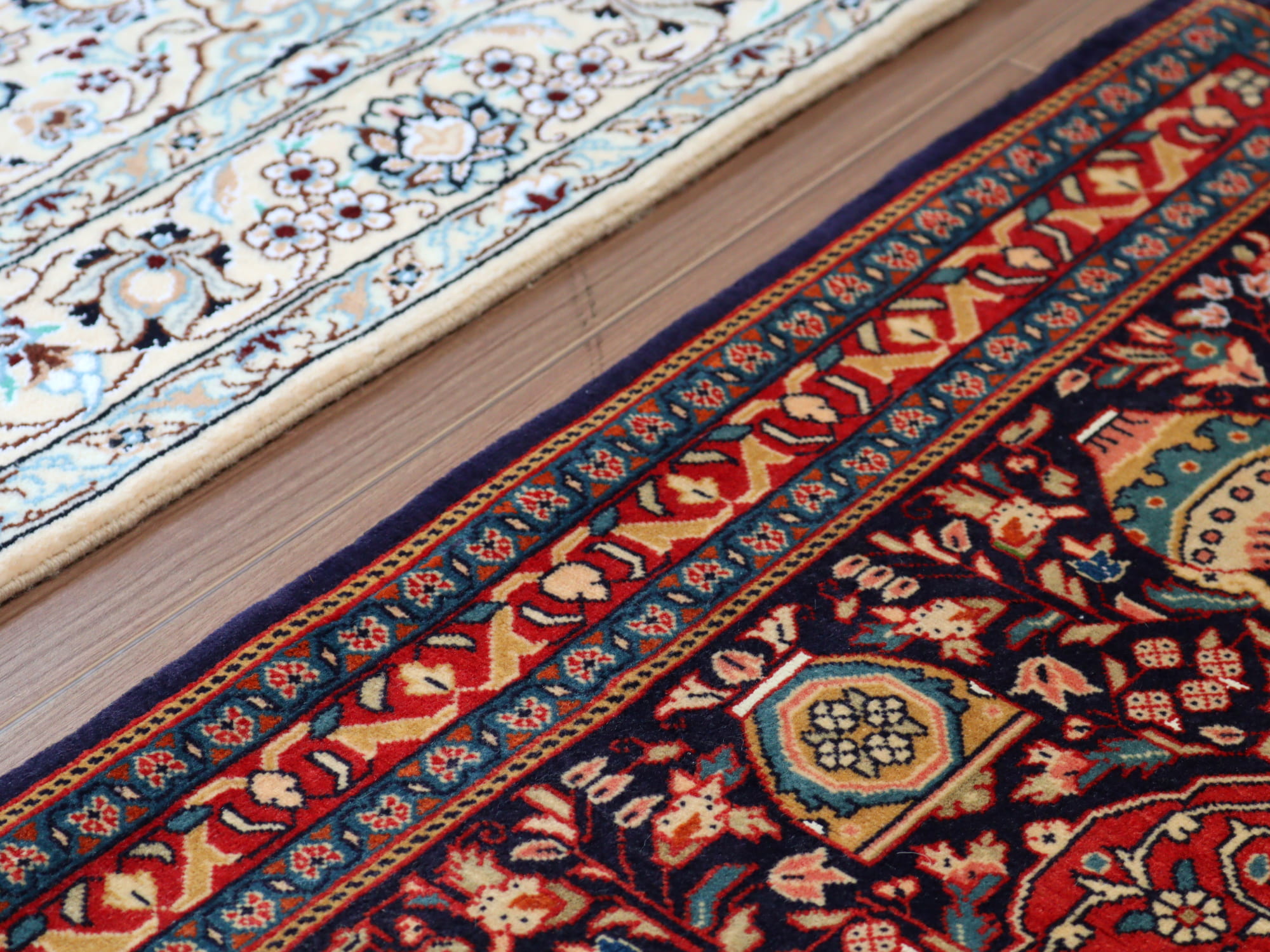 縦糸にコットンを使用しています。ベースを含めた絨毯の厚みは0.7cm程で、パイルはすっきりと刈られています。