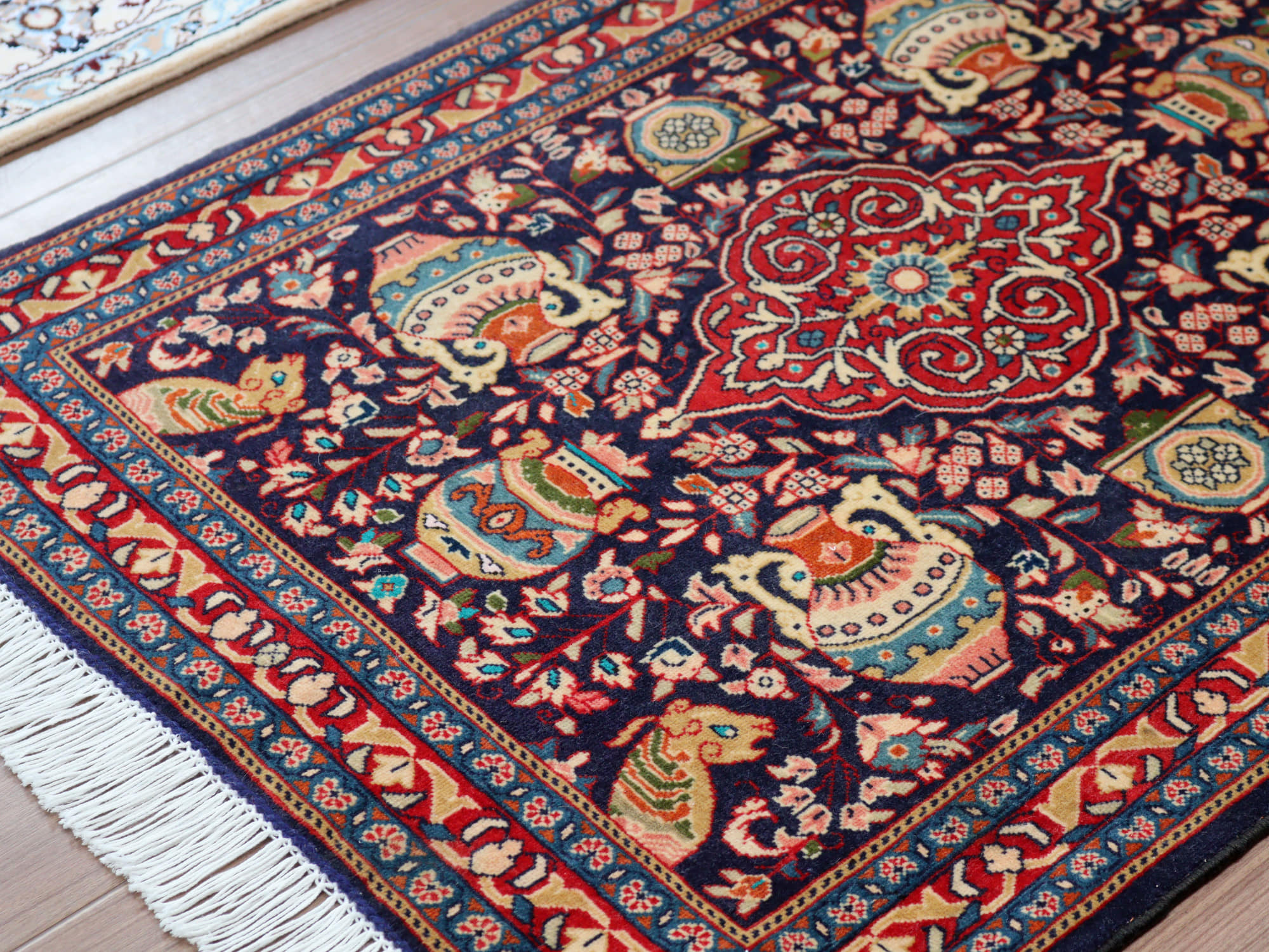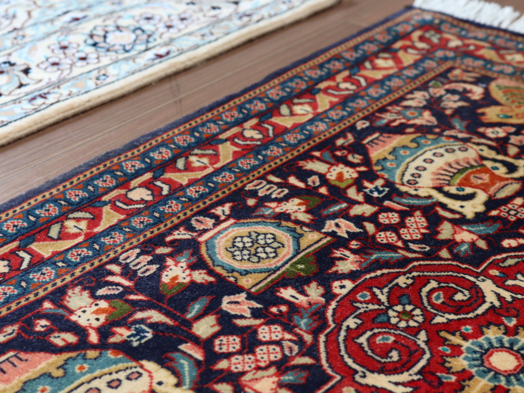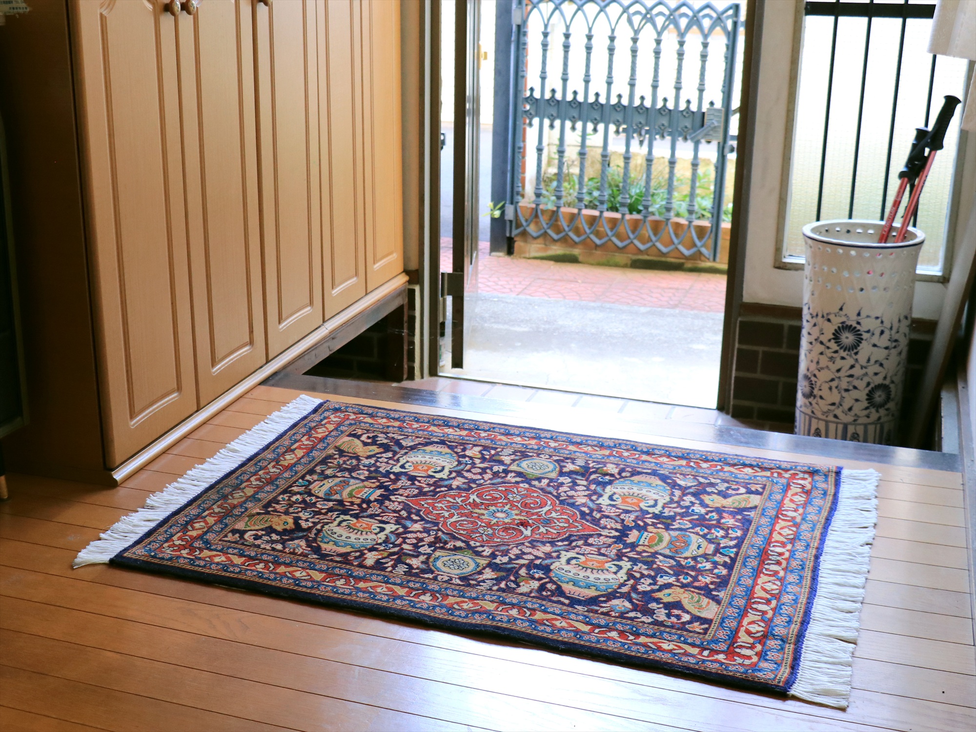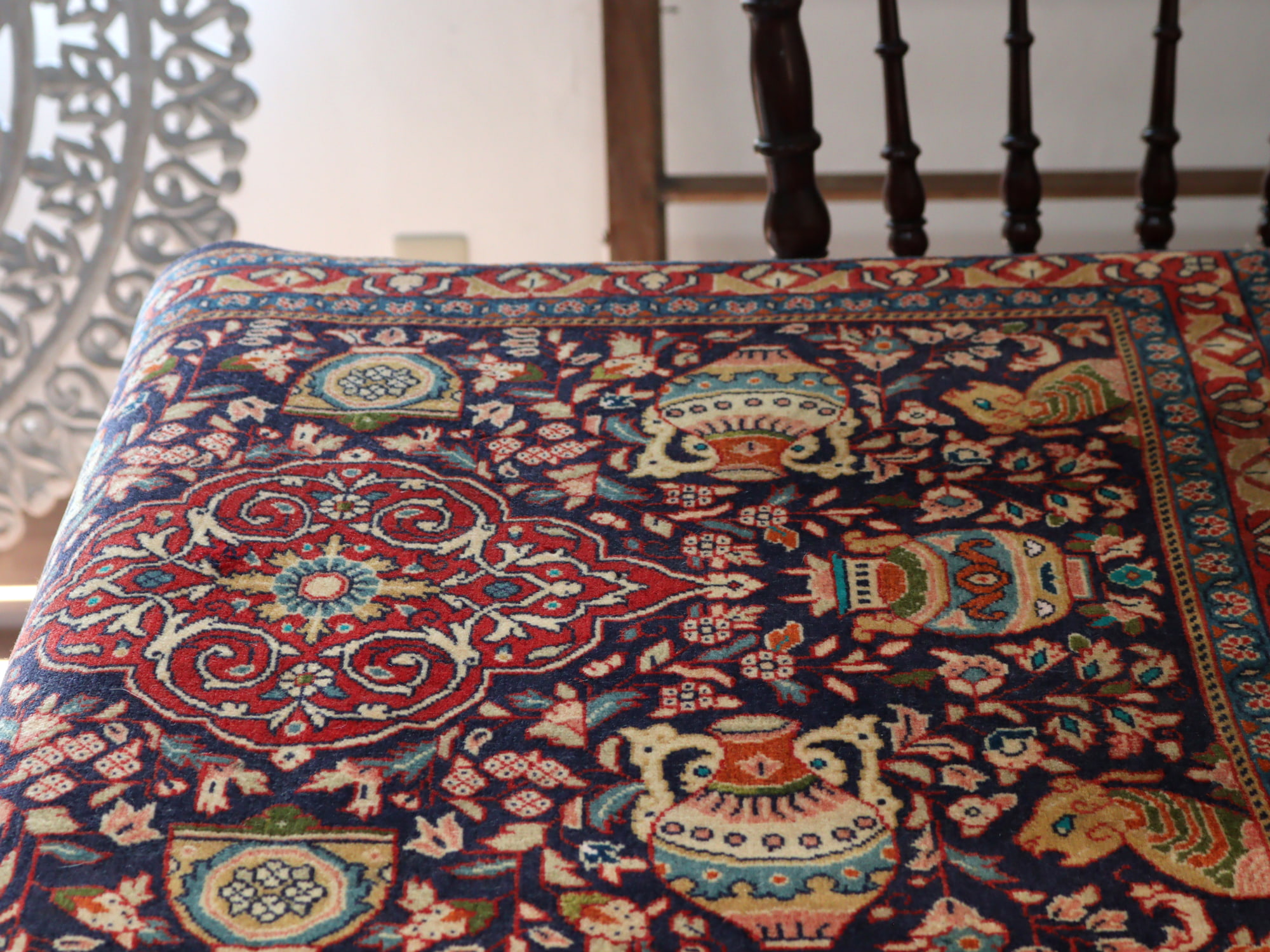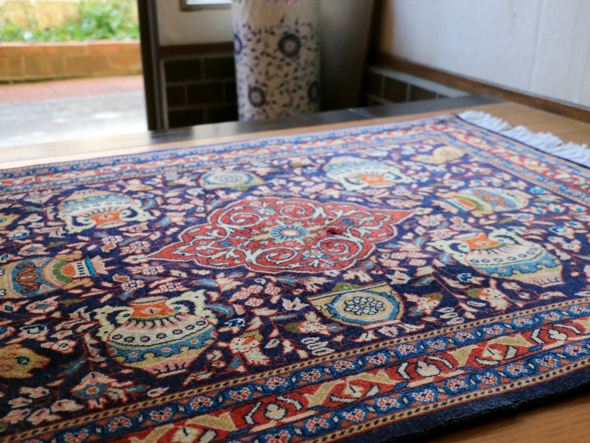 縦糸にコットンを使用しています。ベースを含めた絨毯の厚みは0.7cm程で、パイルはすっきりと刈られています。