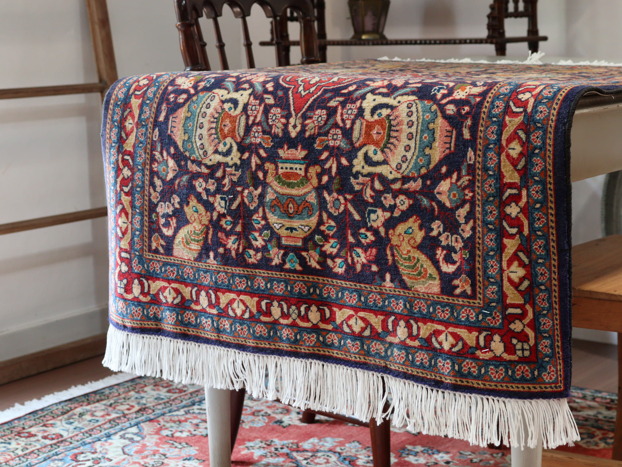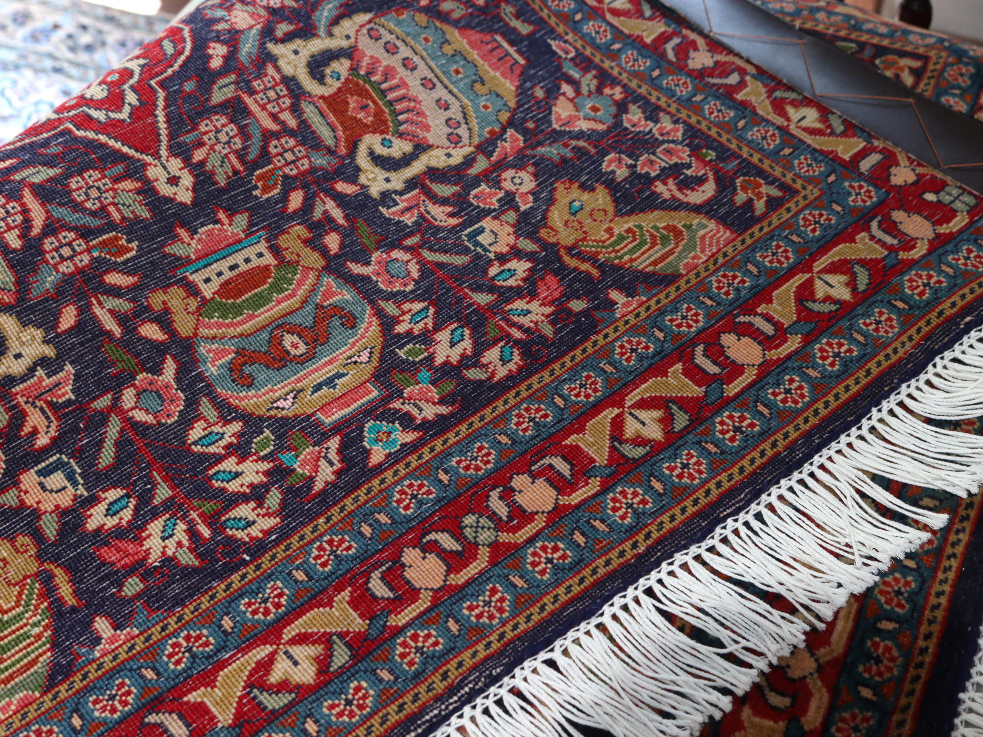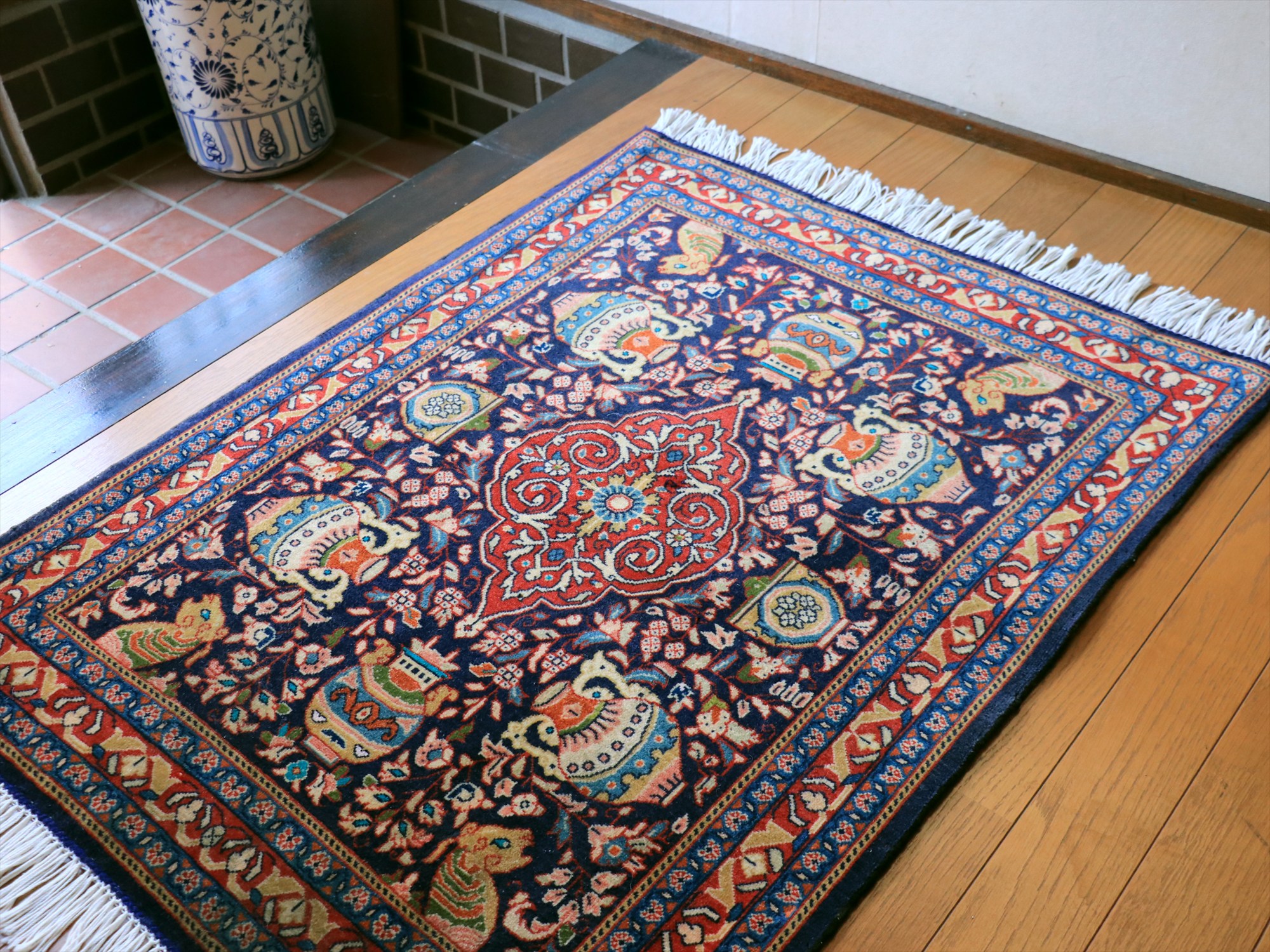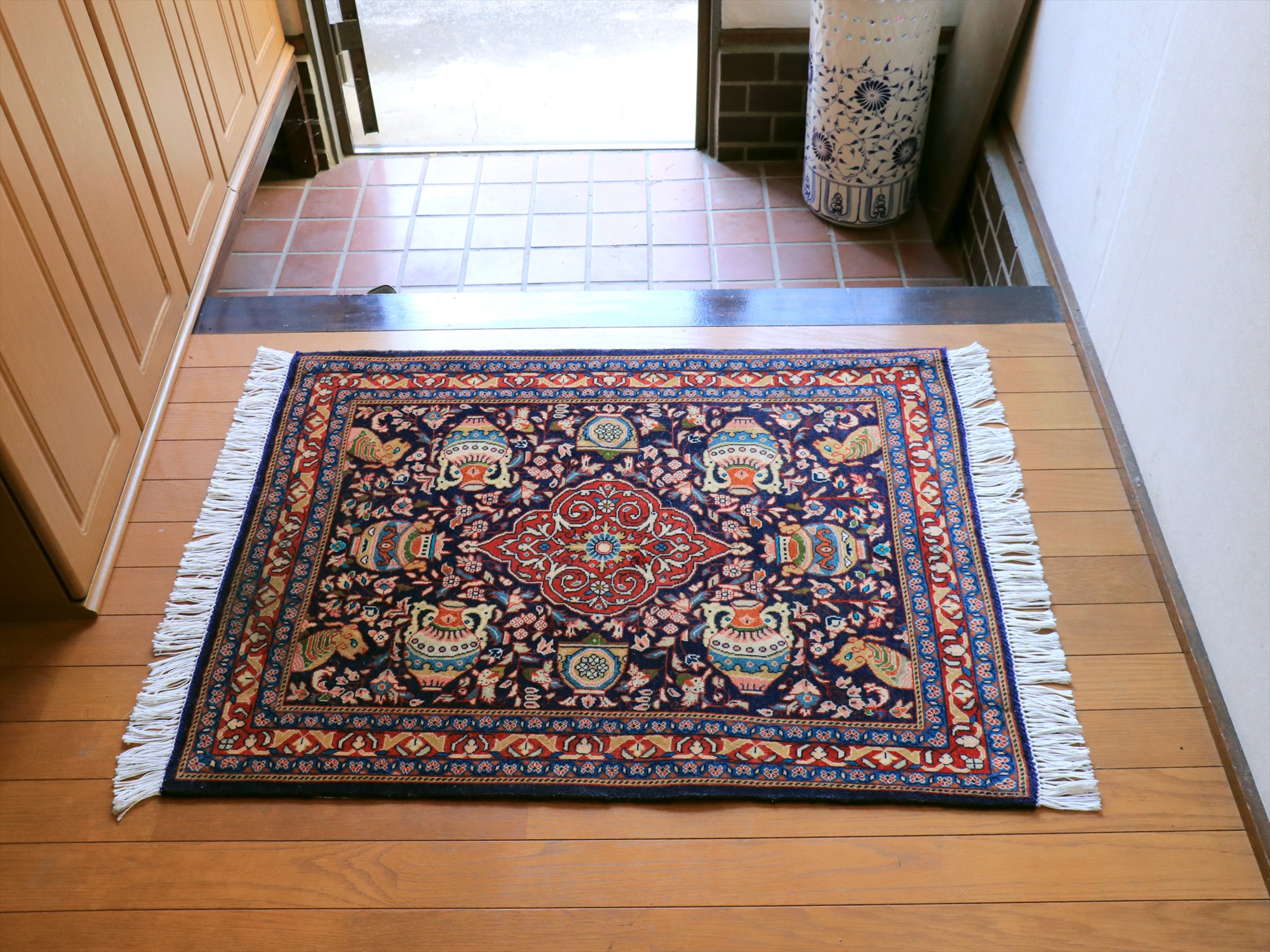 縦糸にコットンを使用しています。ベースを含めた絨毯の厚みは0.7cm程で、パイルはすっきりと刈られています。