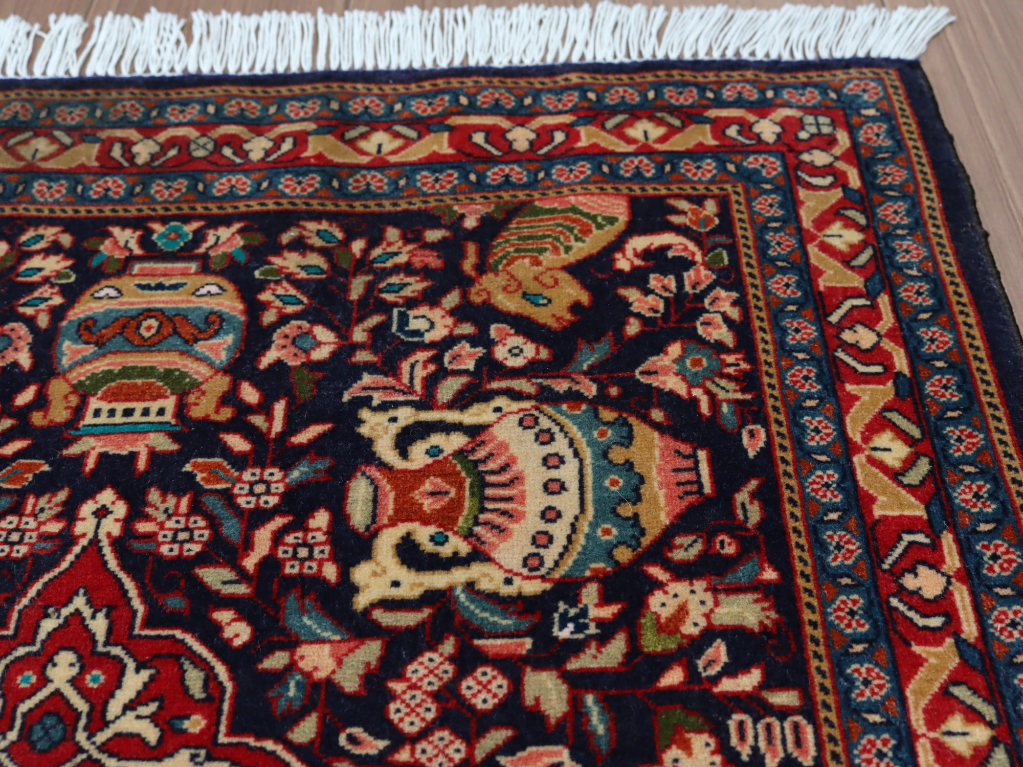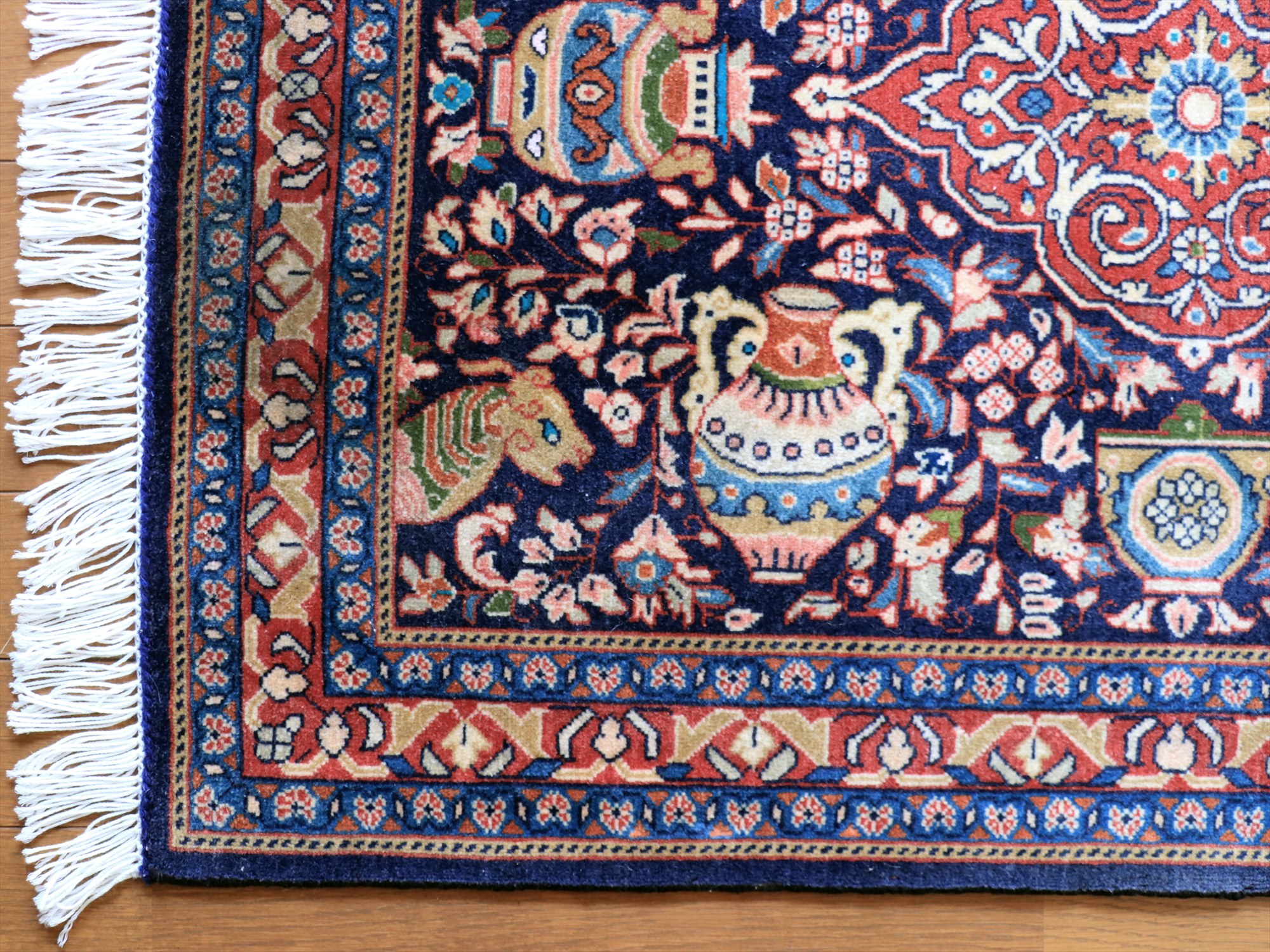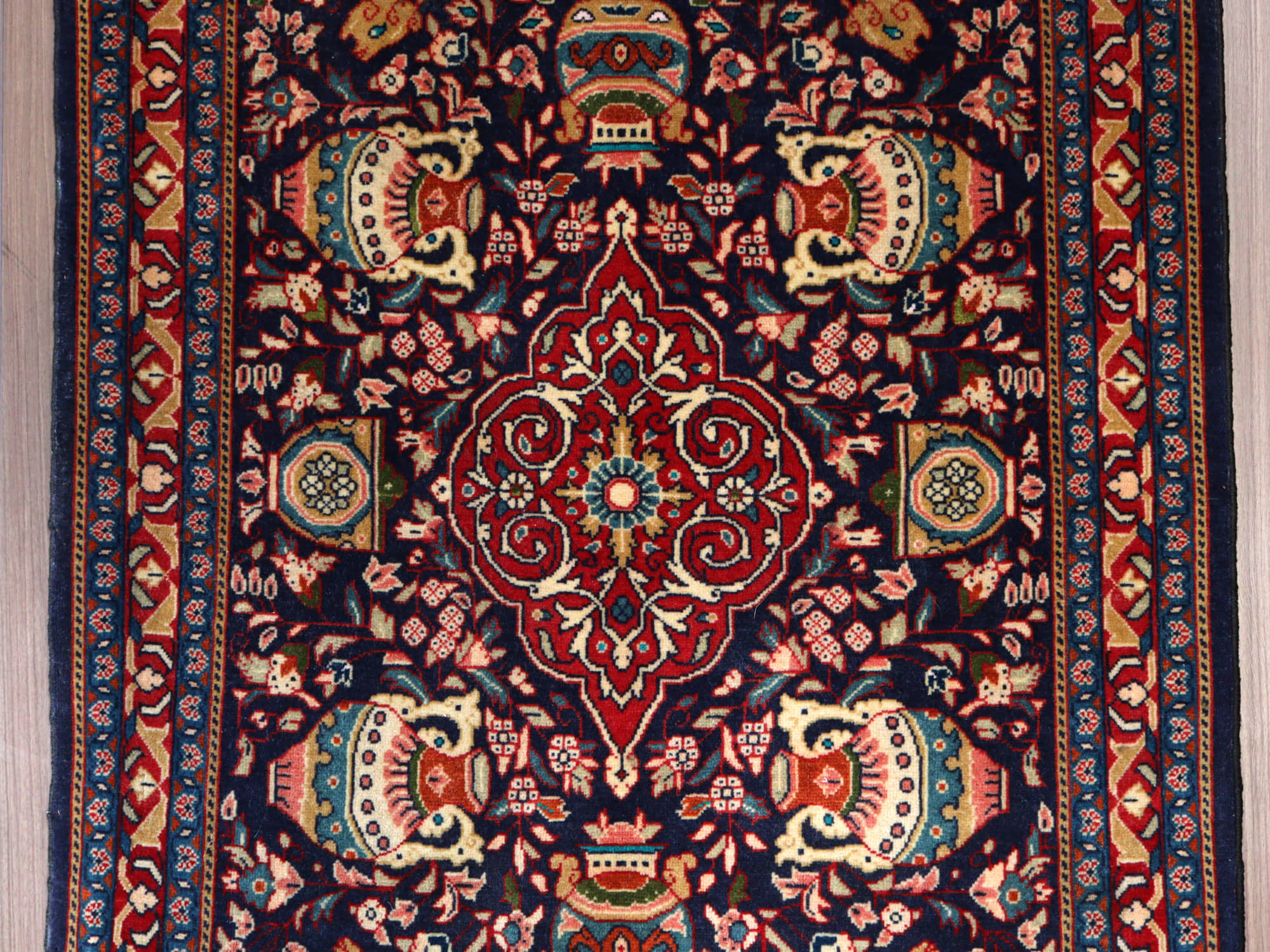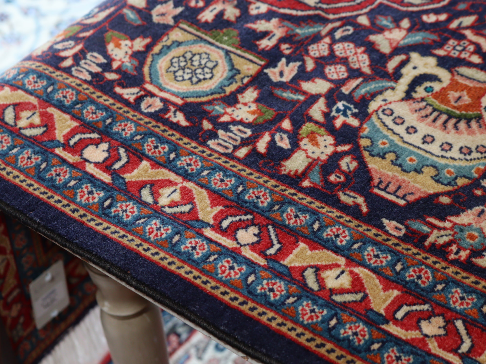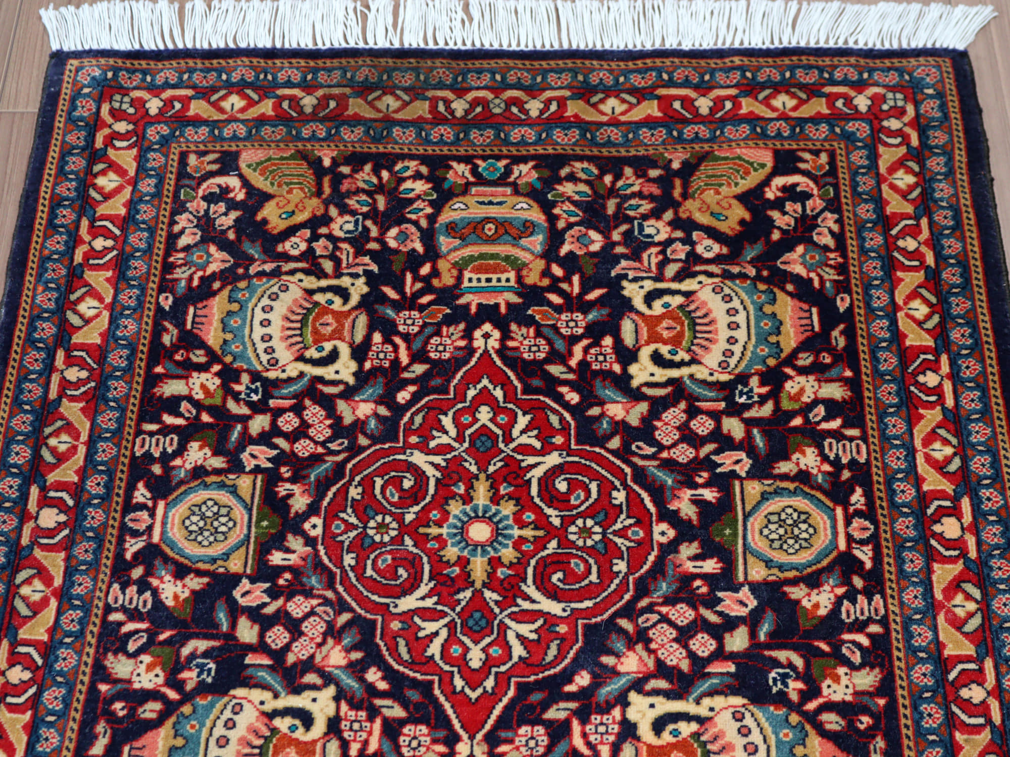 縦糸にコットンを使用しています。ベースを含めた絨毯の厚みは0.7cm程で、パイルはすっきりと刈られています。