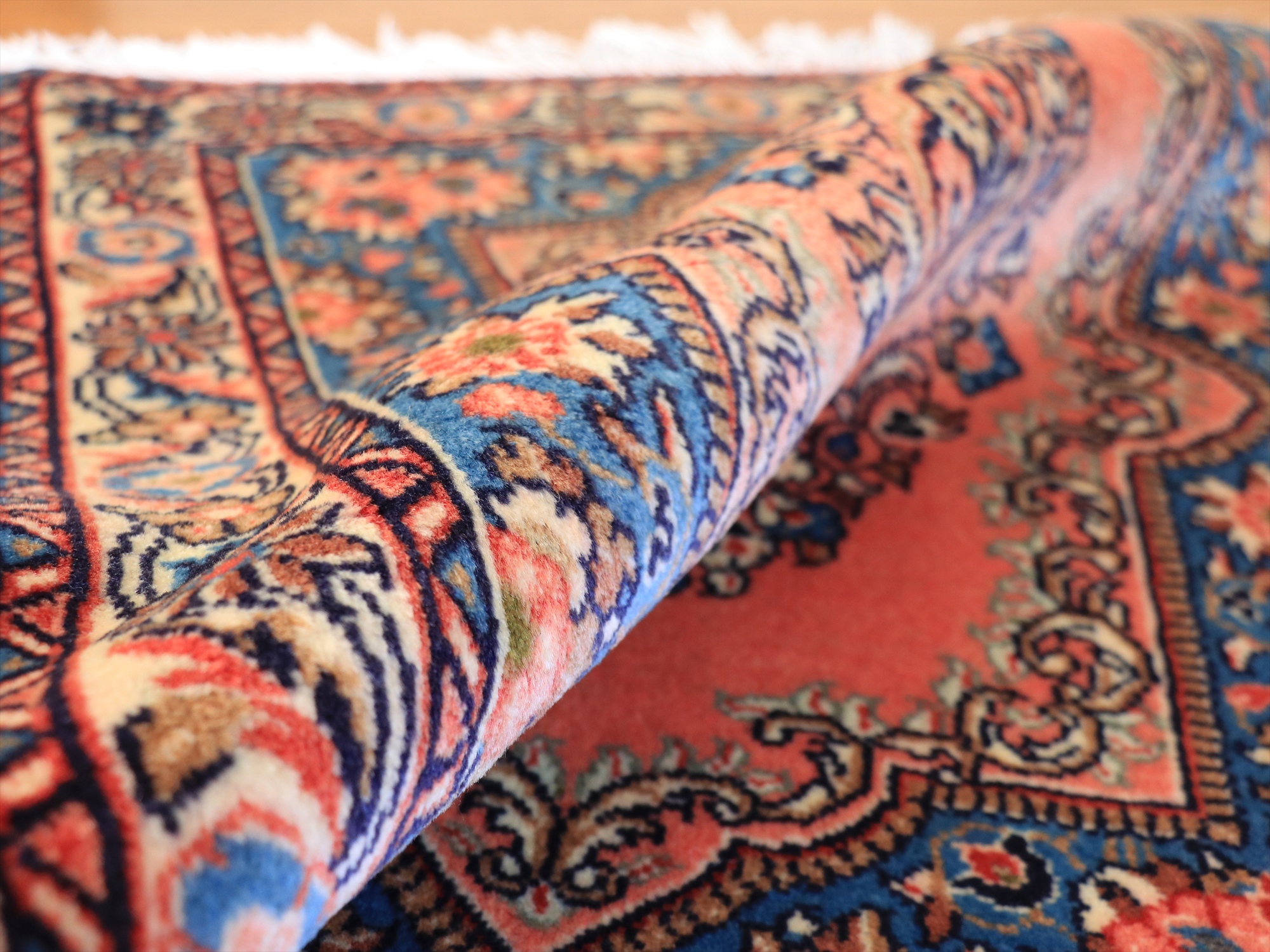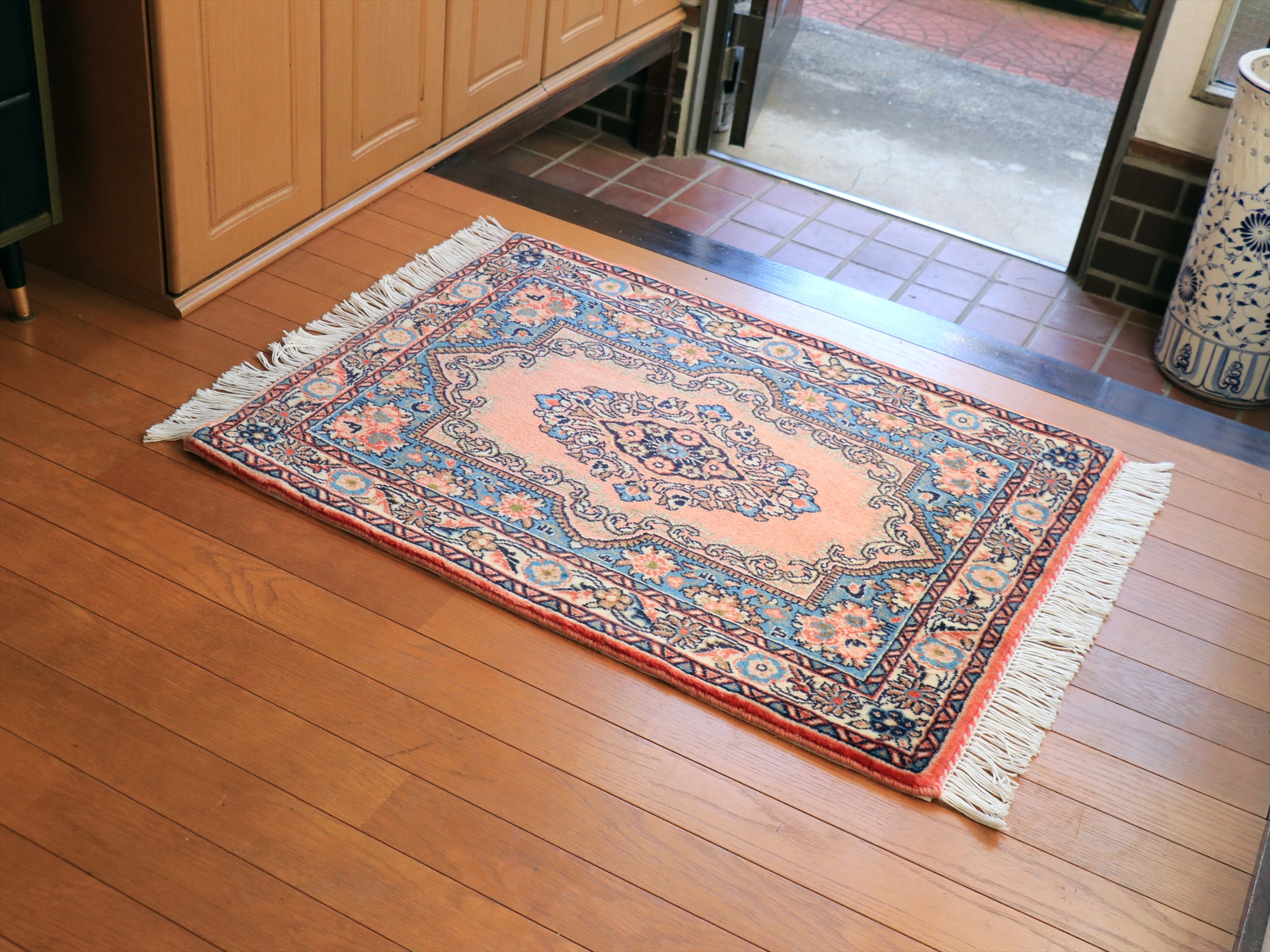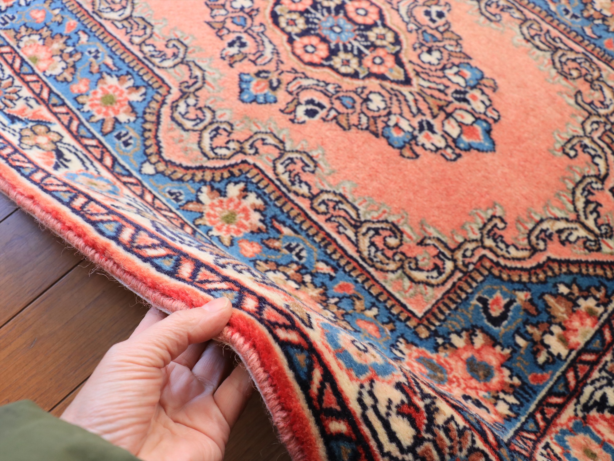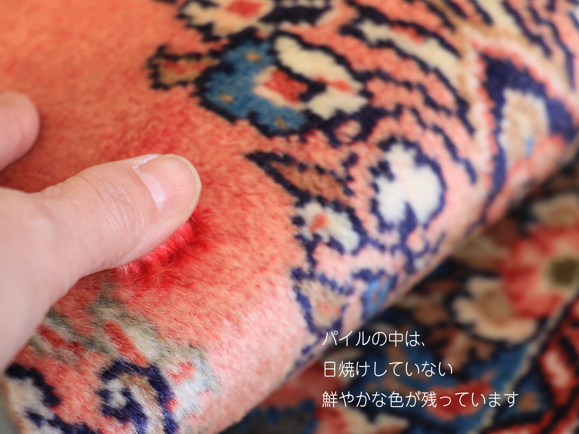 縦糸にコットンを使用しています。ベースを含めた絨毯の厚みは0.8cm程で、パイルはすっきりと刈られています。こちらは横幅があり、正方形や幅のある絨毯をお探しの方にはおすすめです。