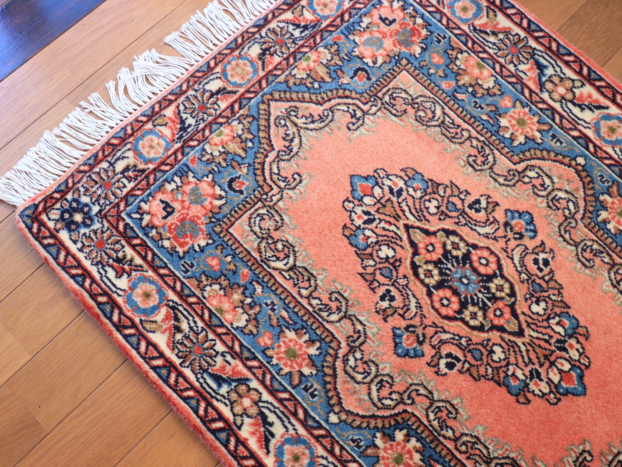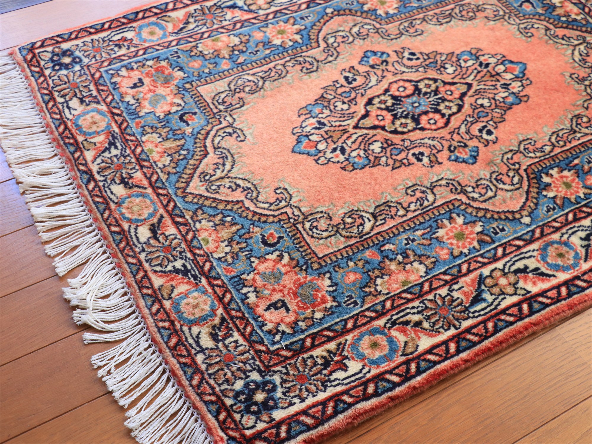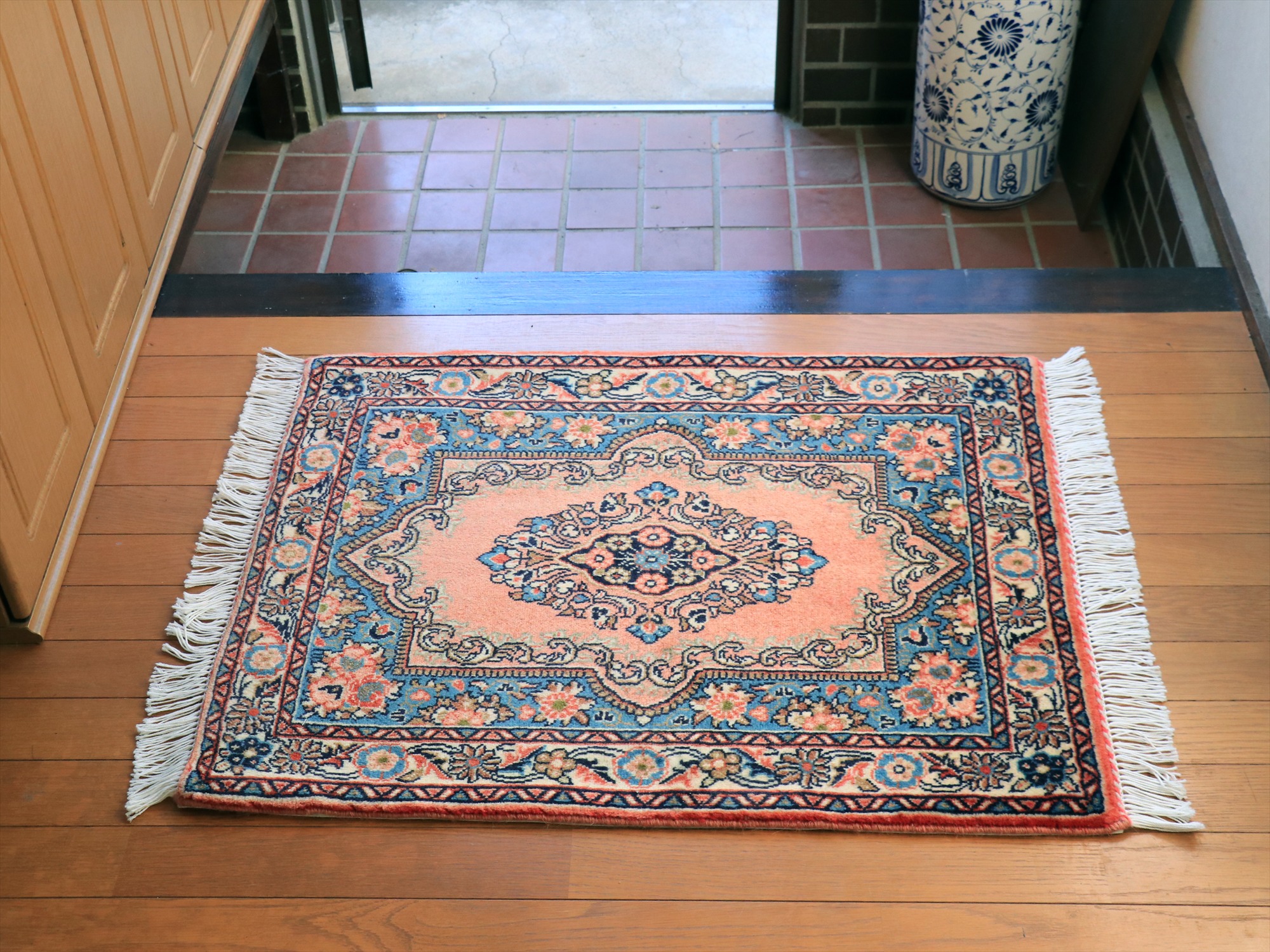 縦糸にコットンを使用しています。ベースを含めた絨毯の厚みは0.8cm程で、パイルはすっきりと刈られています。こちらは横幅があり、正方形や幅のある絨毯をお探しの方にはおすすめです。