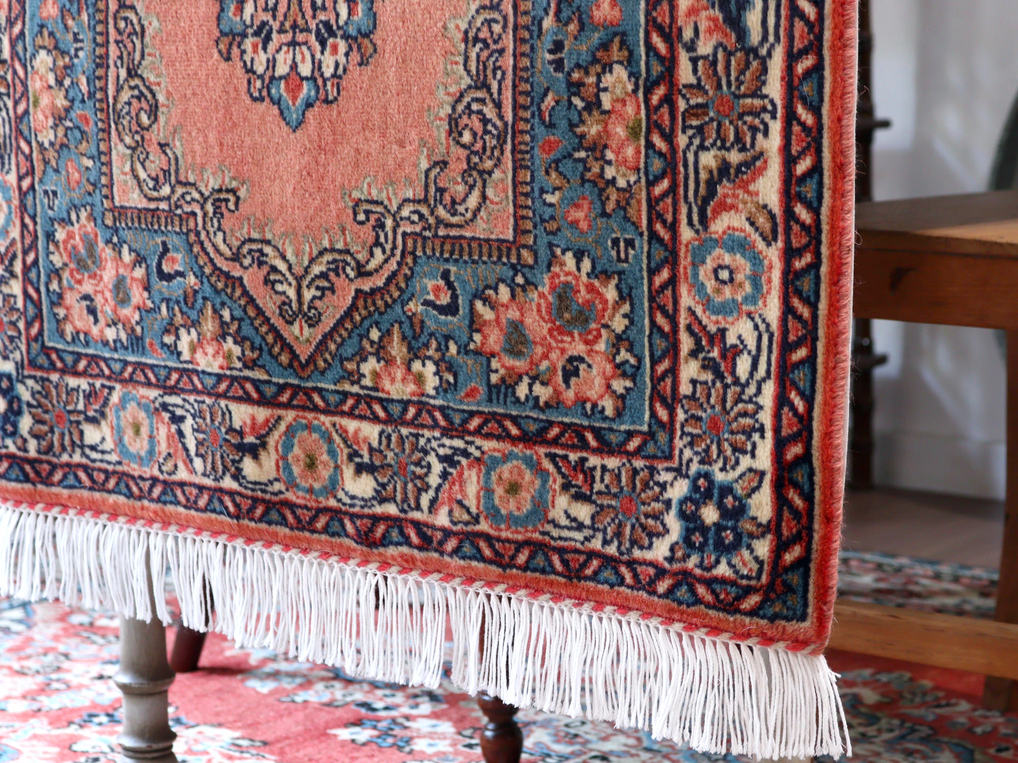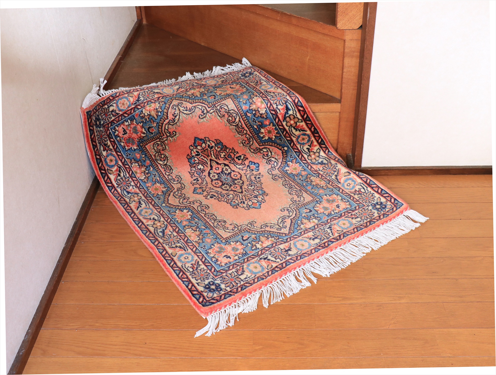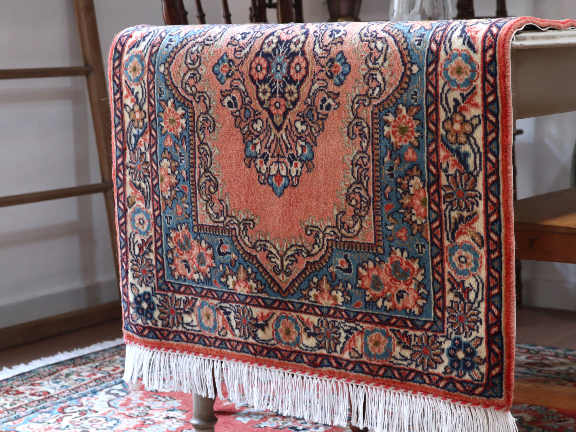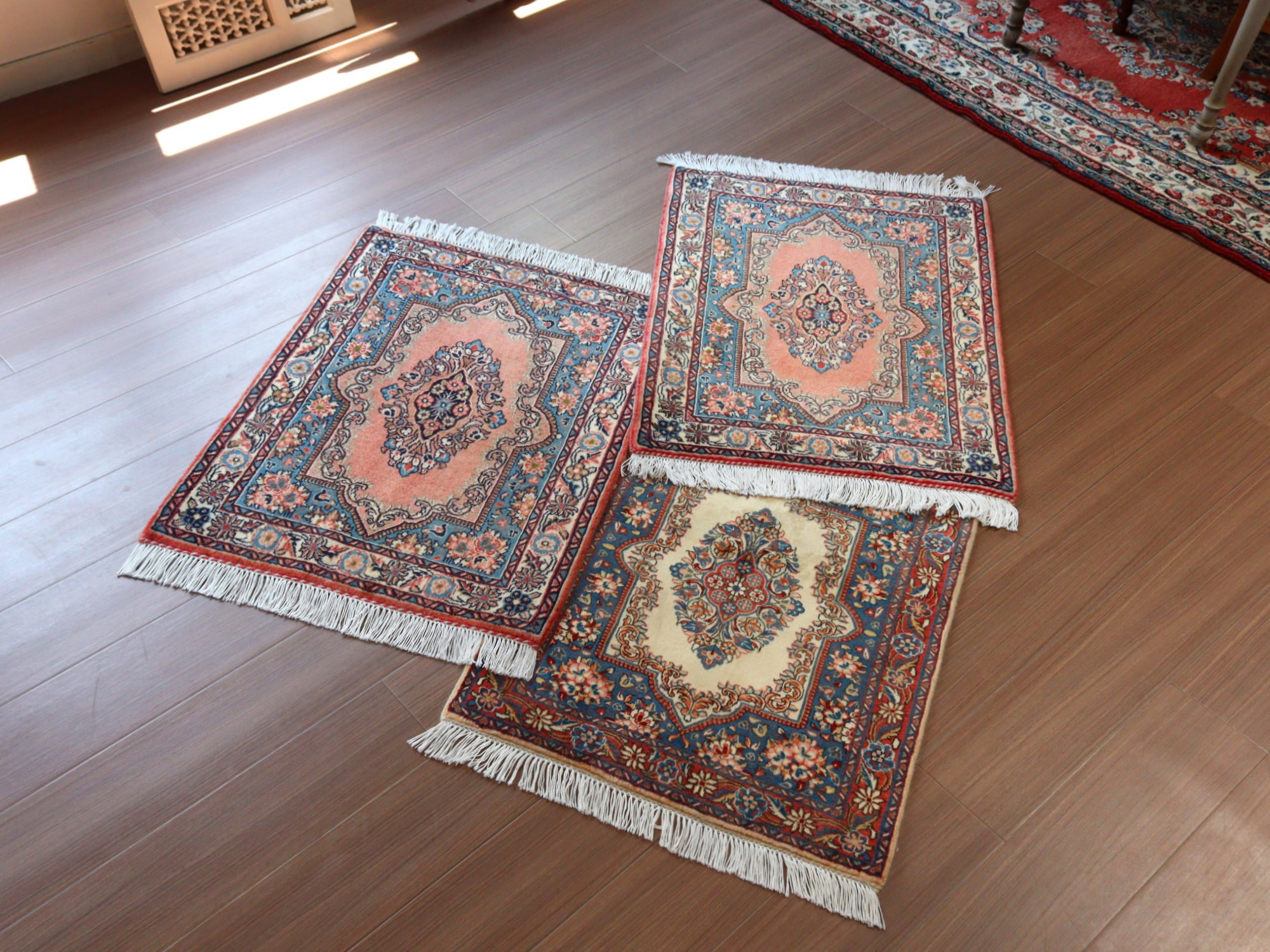 縦糸にコットンを使用しています。ベースを含めた絨毯の厚みは0.8cm程で、パイルはすっきりと刈られています。こちらは横幅があり、正方形や幅のある絨毯をお探しの方にはおすすめです。