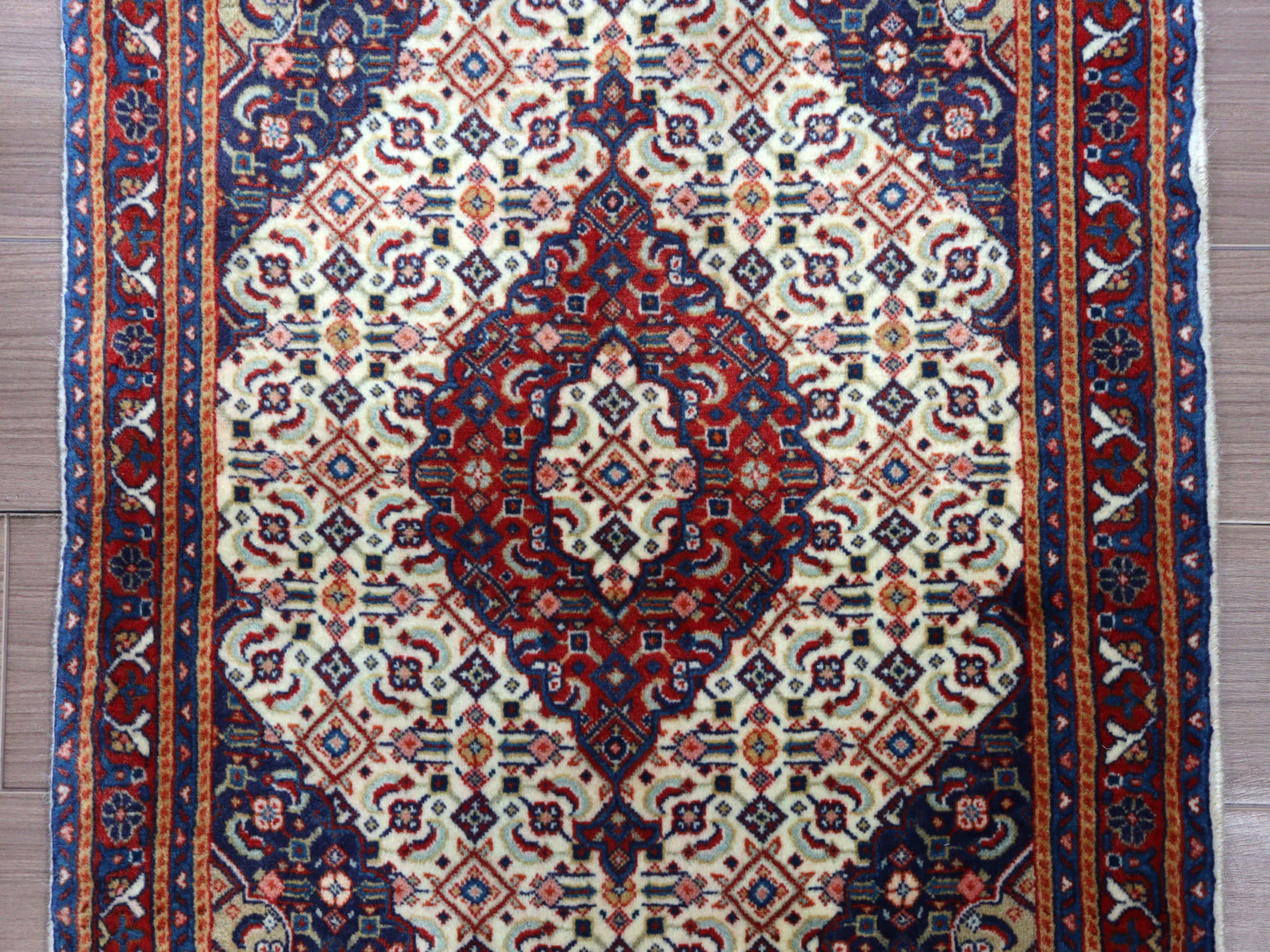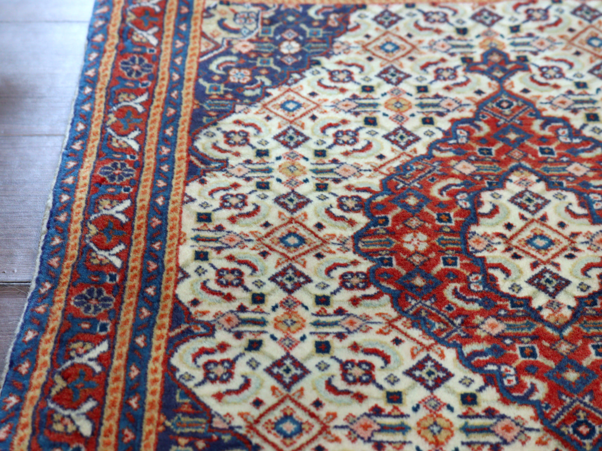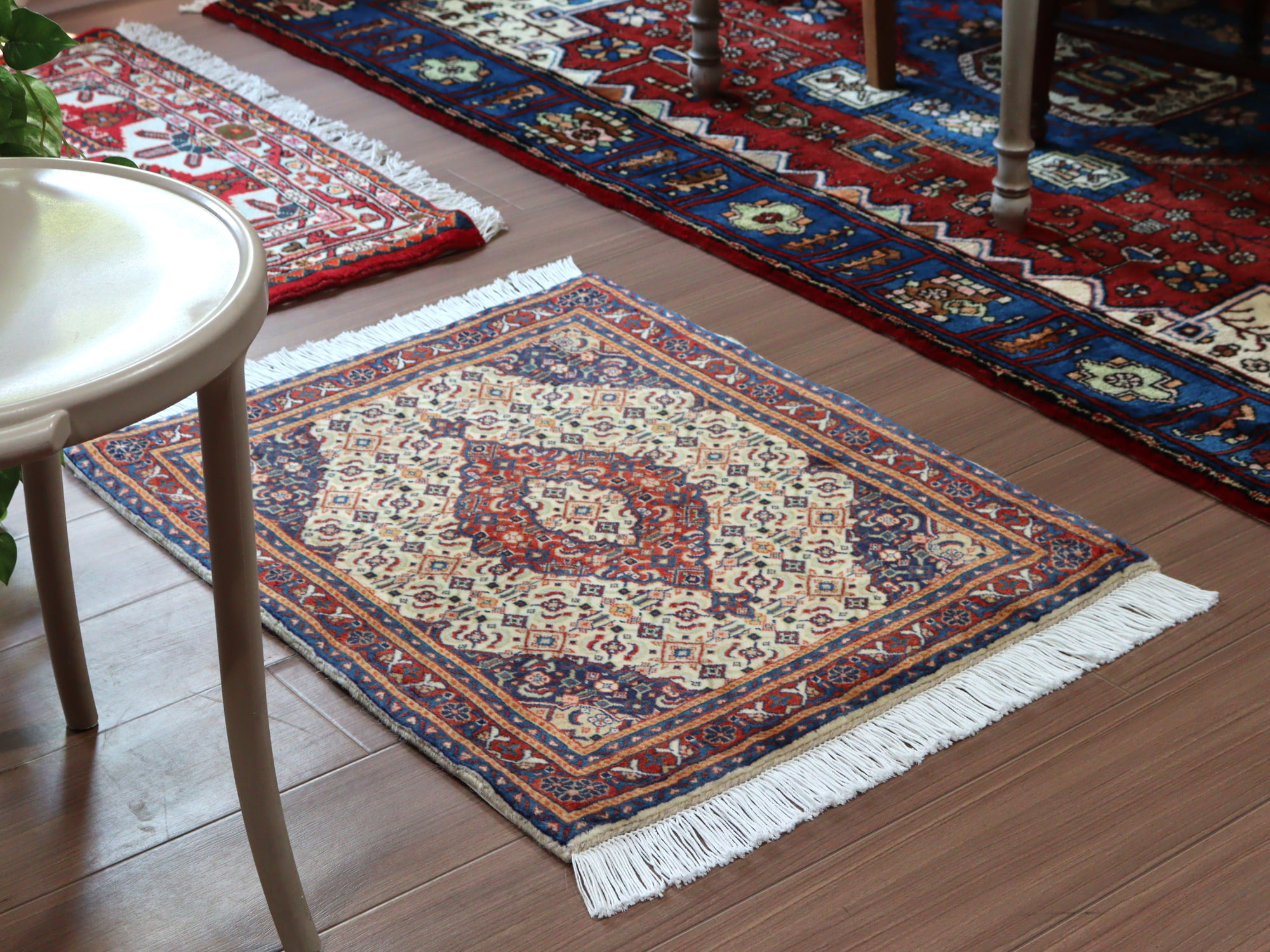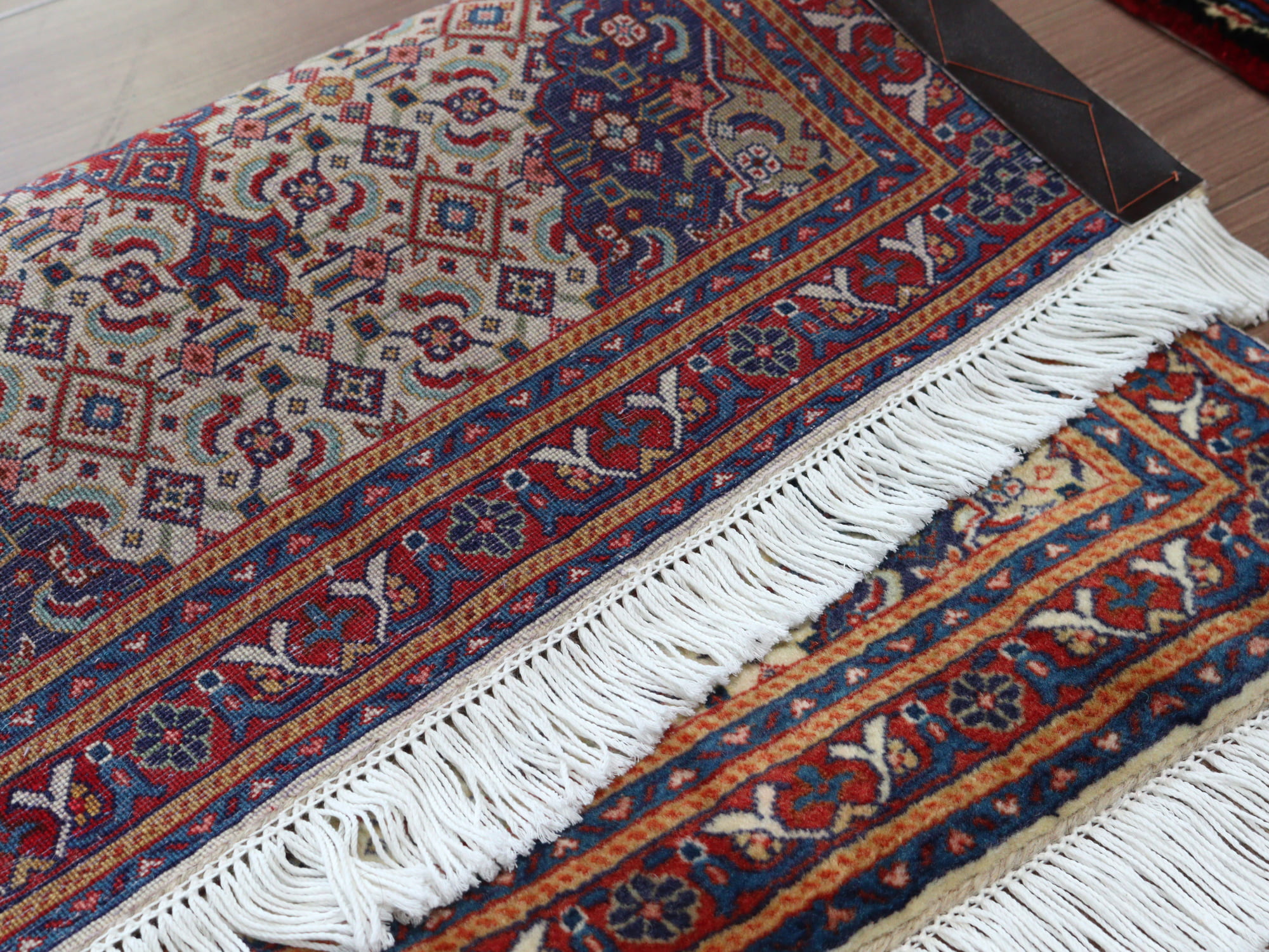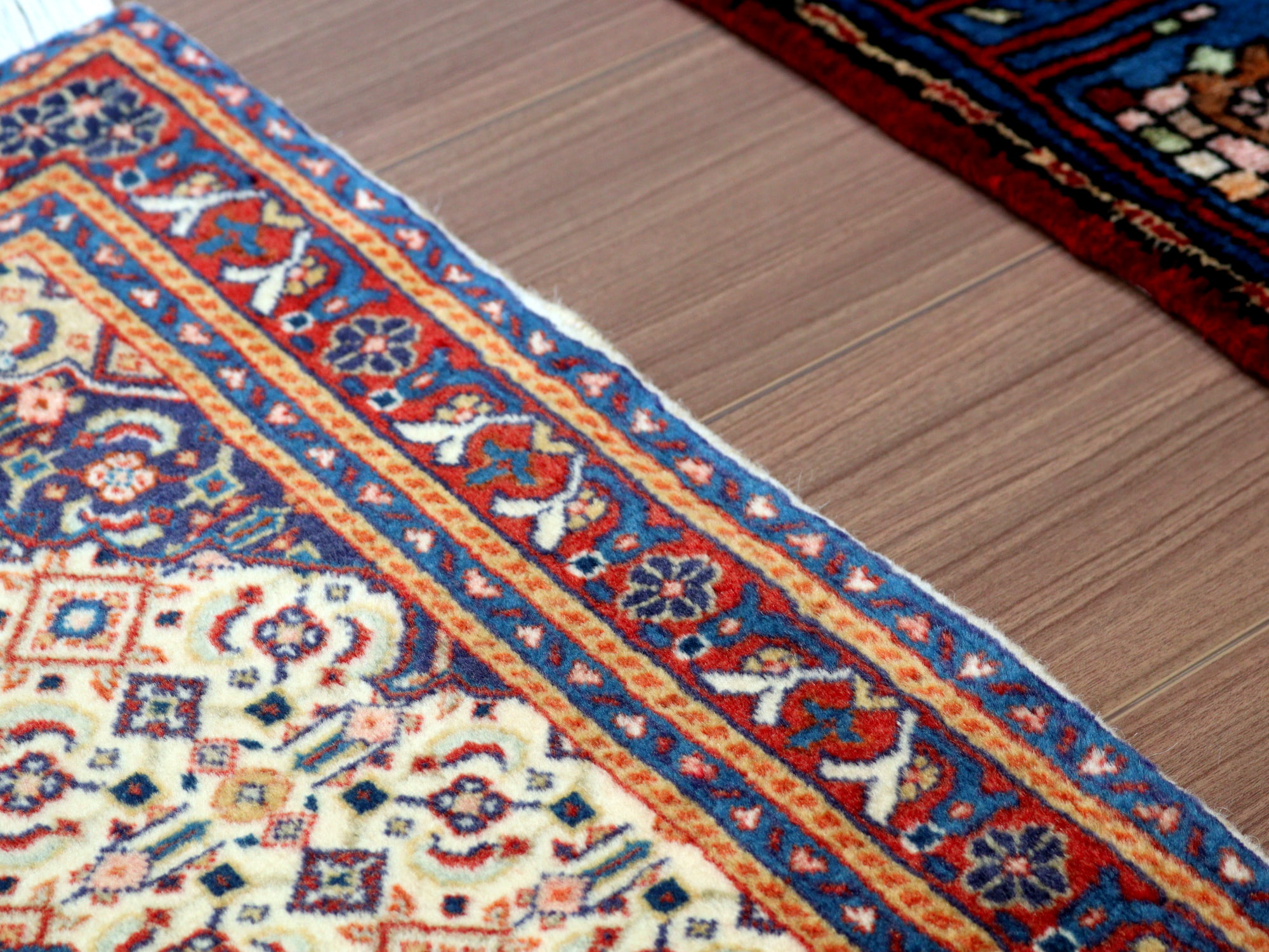 縦糸にコットンを使用しています。パイルを含めたラグの厚みは1cm程で、ふっくらとしています。こちらは横幅があり、正方形や幅のある絨毯をお探しの方にはおすすめです。