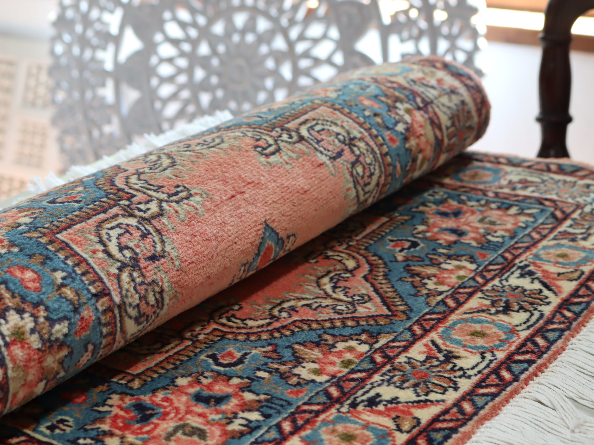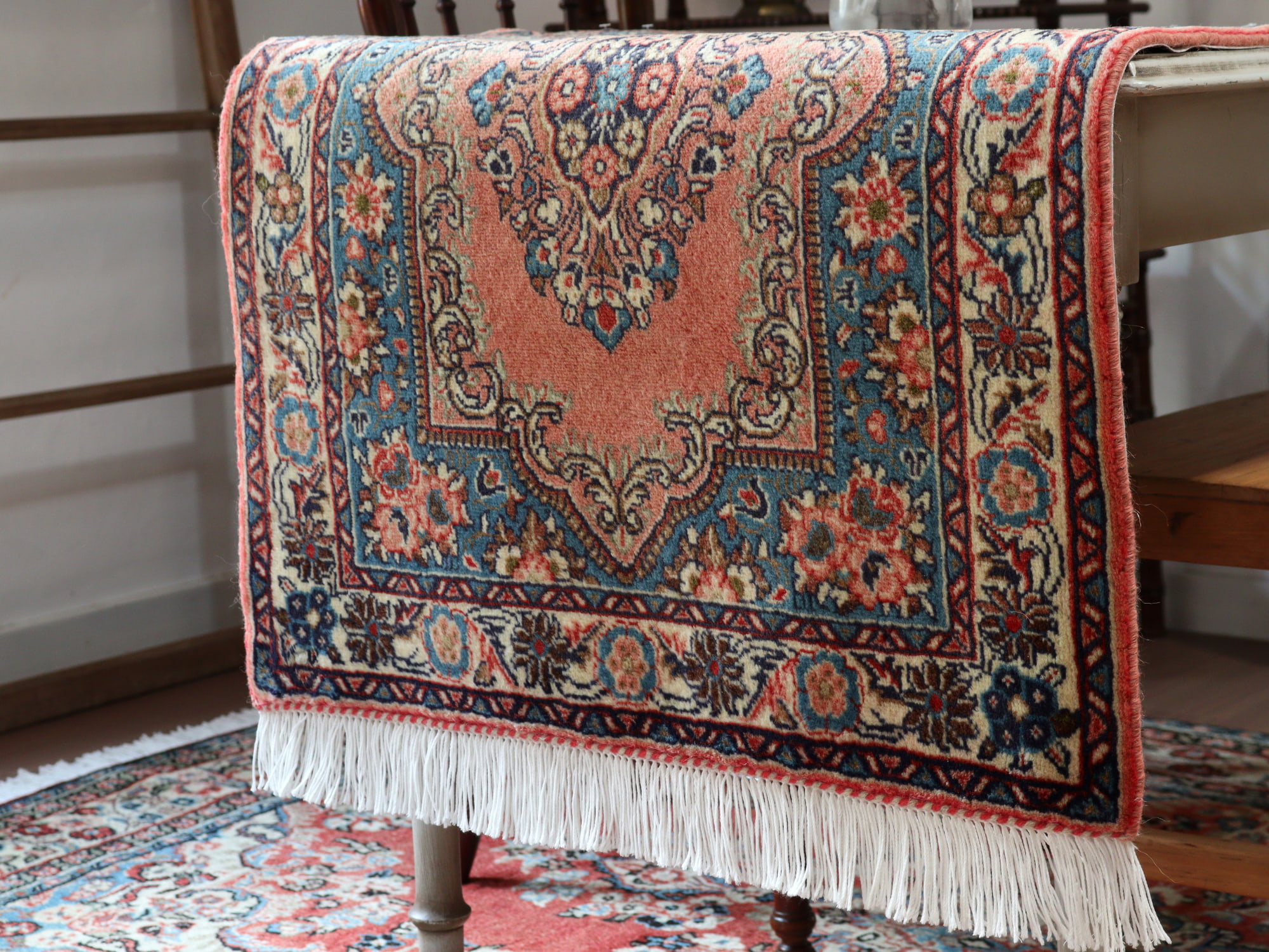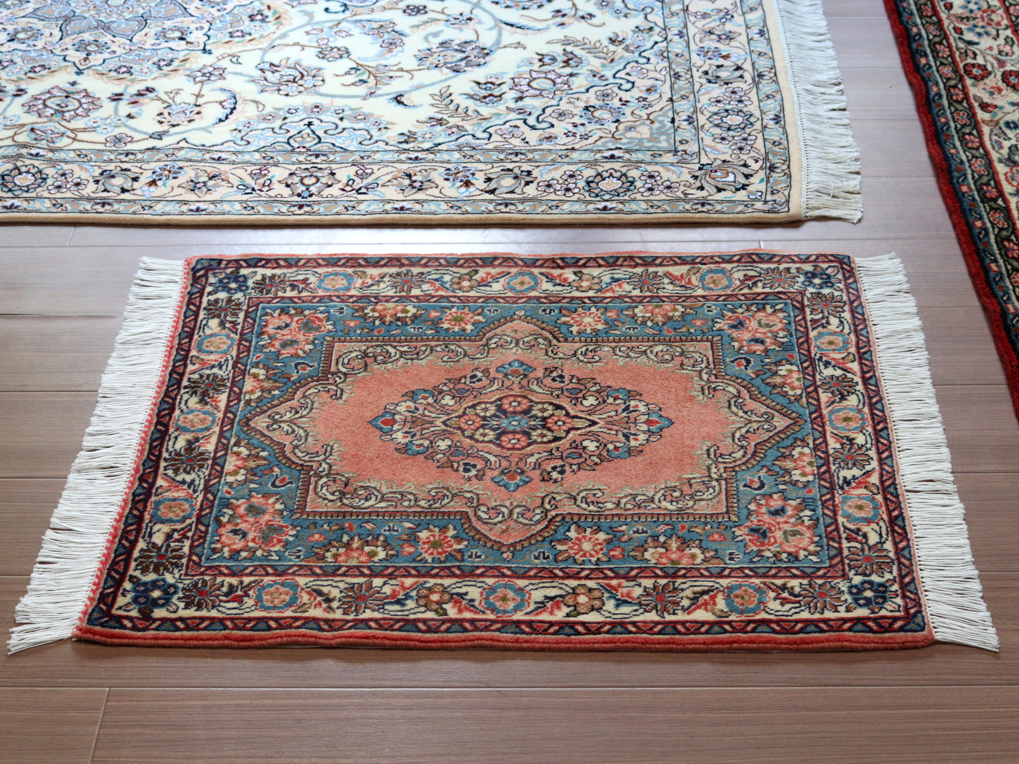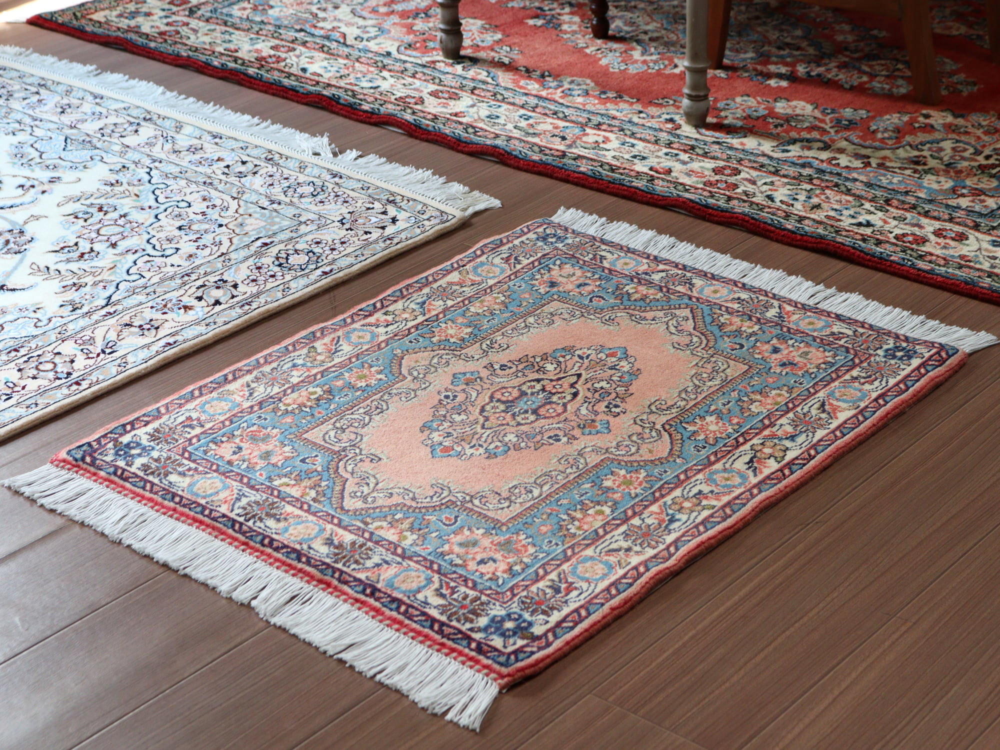 縦糸にコットンを使用しています。ベースを含めた絨毯の厚みは0.9cm程で、パイルはすっきりと刈られています。こちらは横幅があり、正方形や幅のある絨毯をお探しの方にはおすすめです。