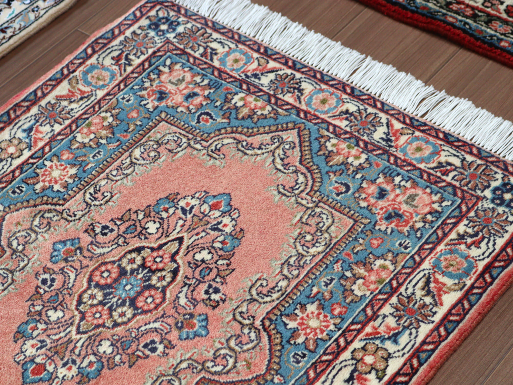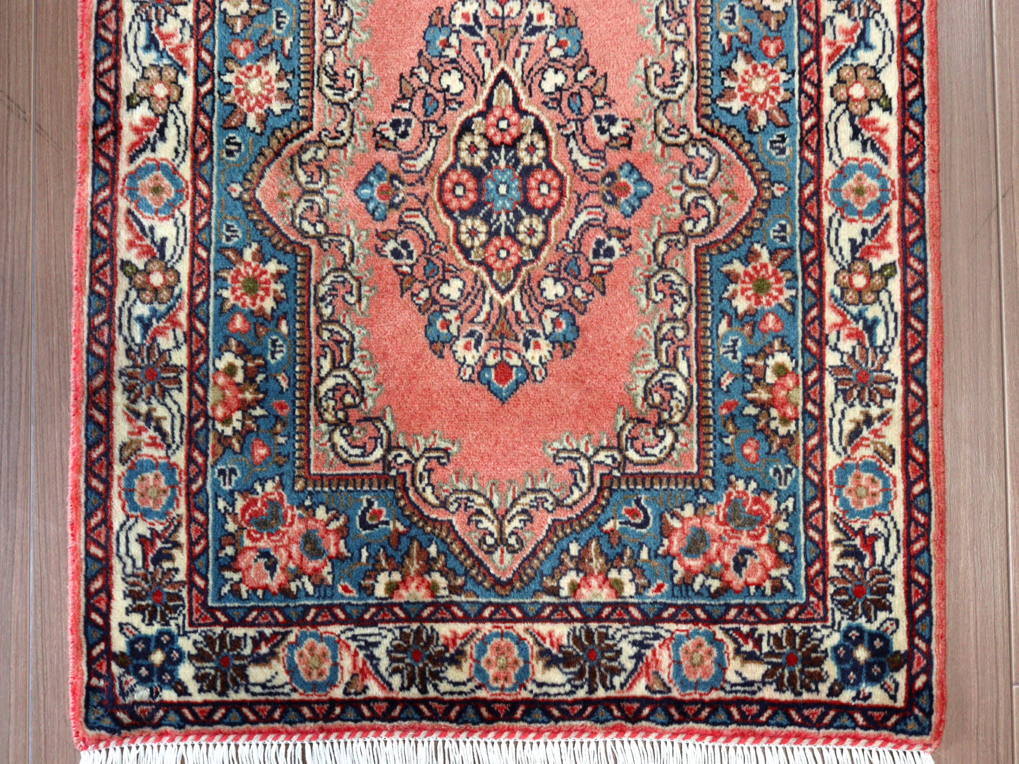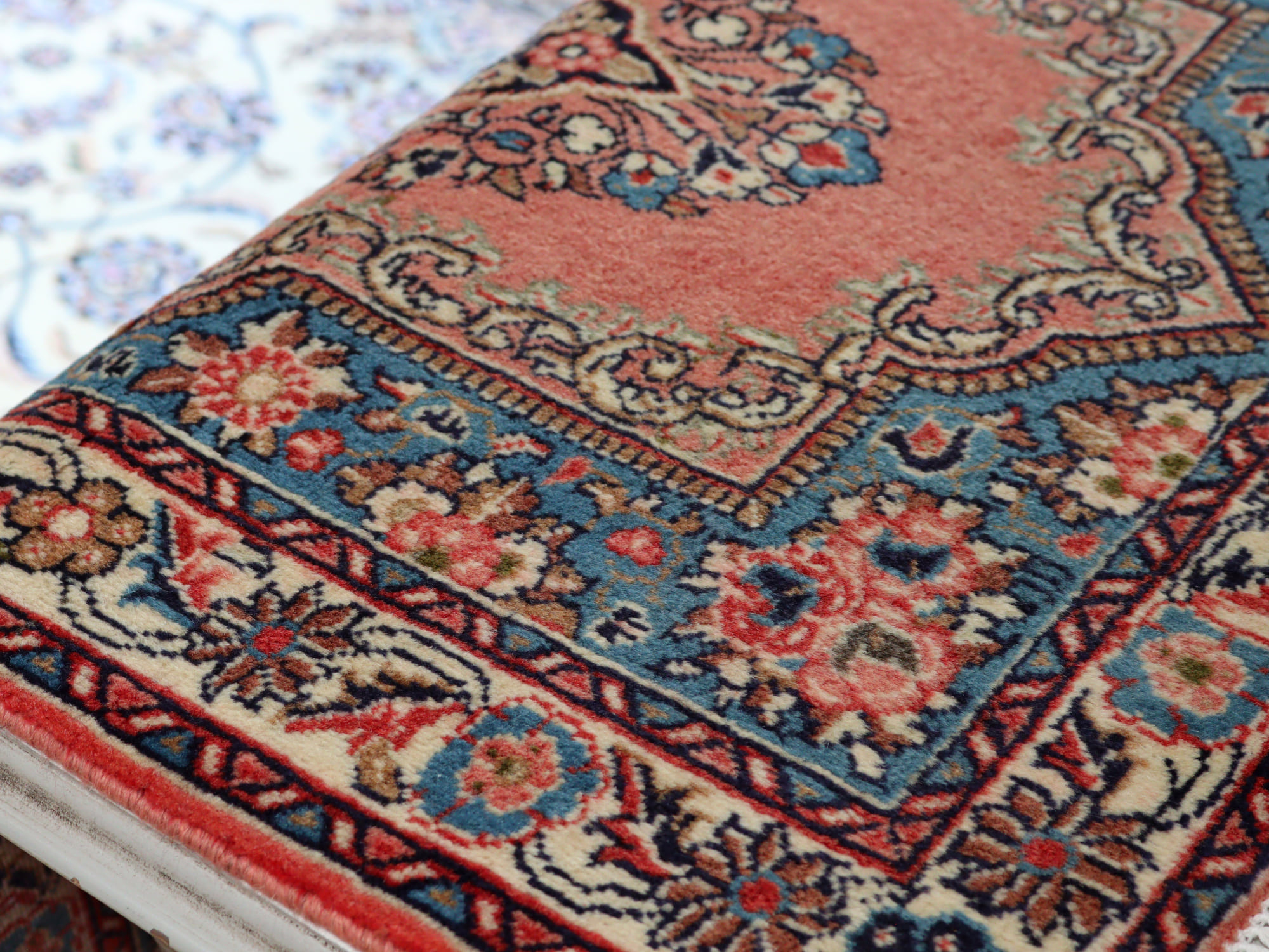 縦糸にコットンを使用しています。ベースを含めた絨毯の厚みは0.9cm程で、パイルはすっきりと刈られています。こちらは横幅があり、正方形や幅のある絨毯をお探しの方にはおすすめです。