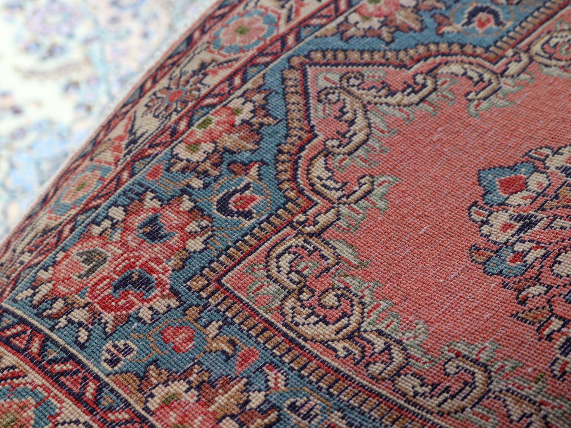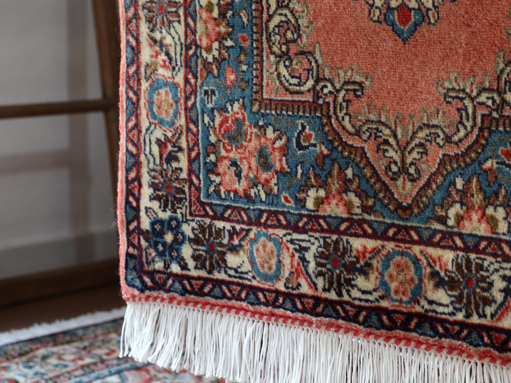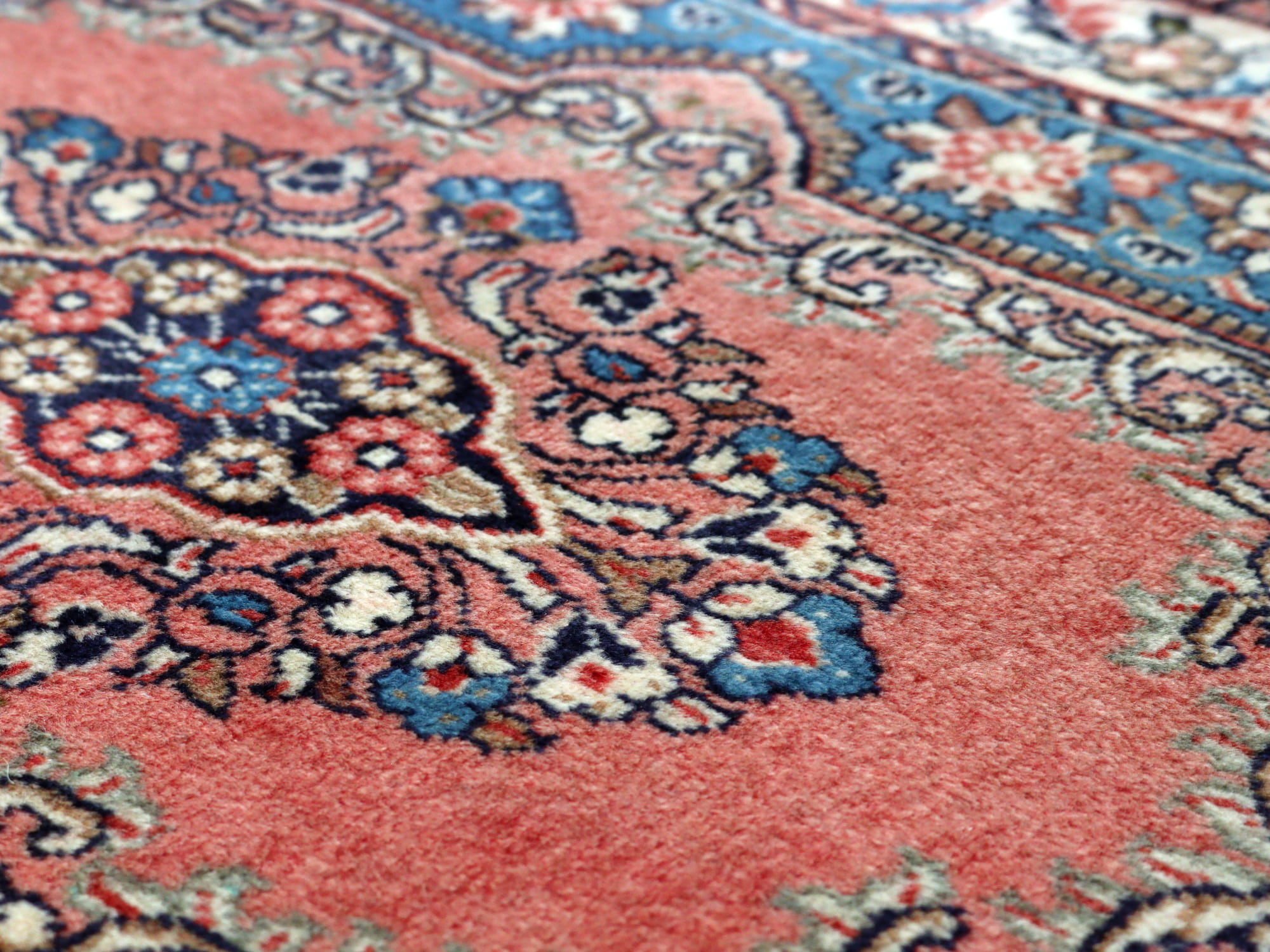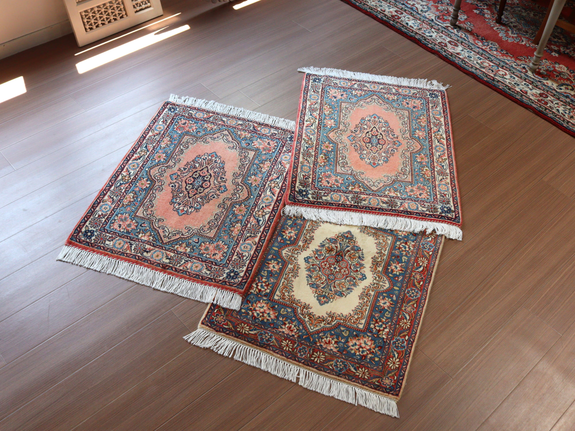 縦糸にコットンを使用しています。ベースを含めた絨毯の厚みは0.9cm程で、パイルはすっきりと刈られています。こちらは横幅があり、正方形や幅のある絨毯をお探しの方にはおすすめです。