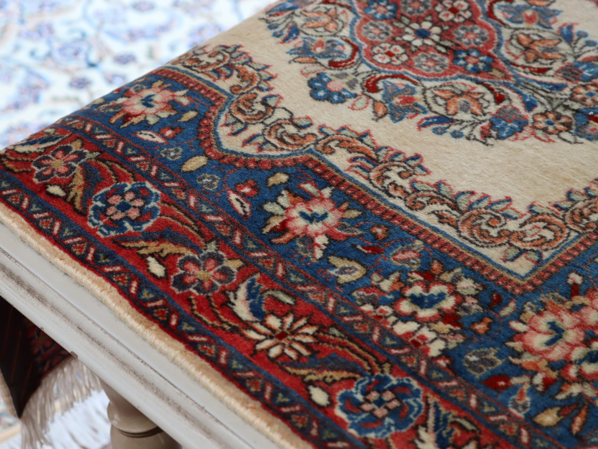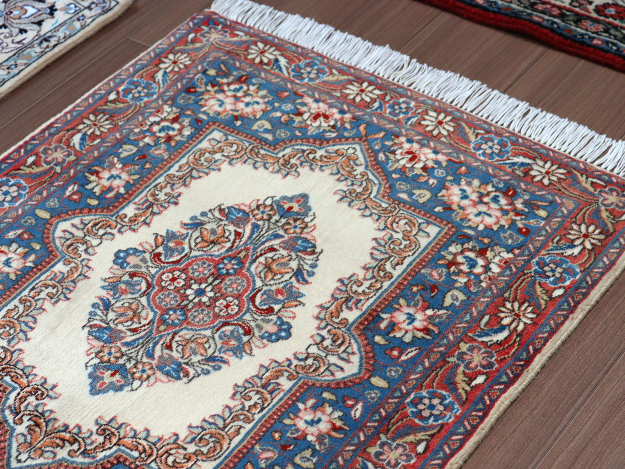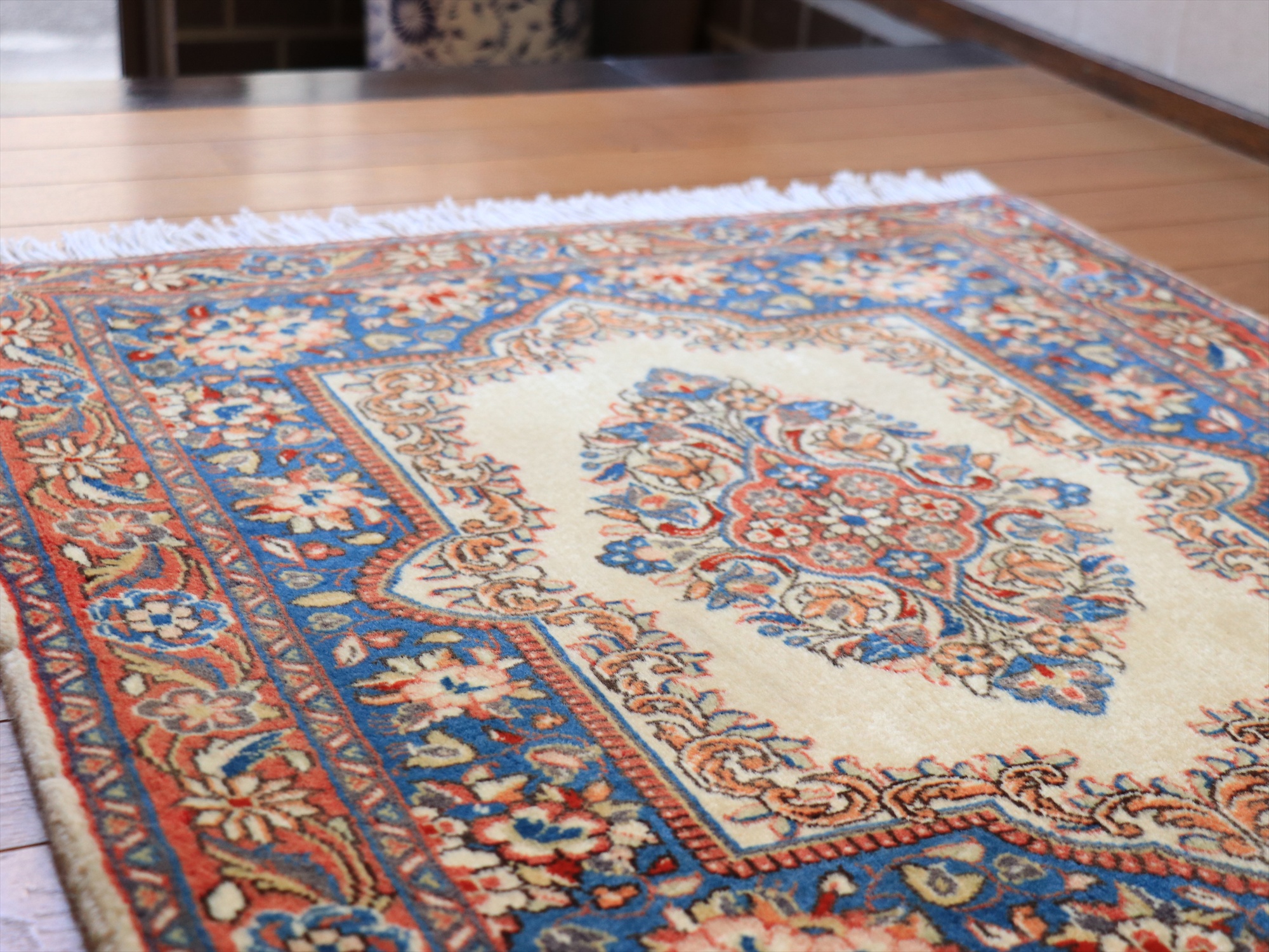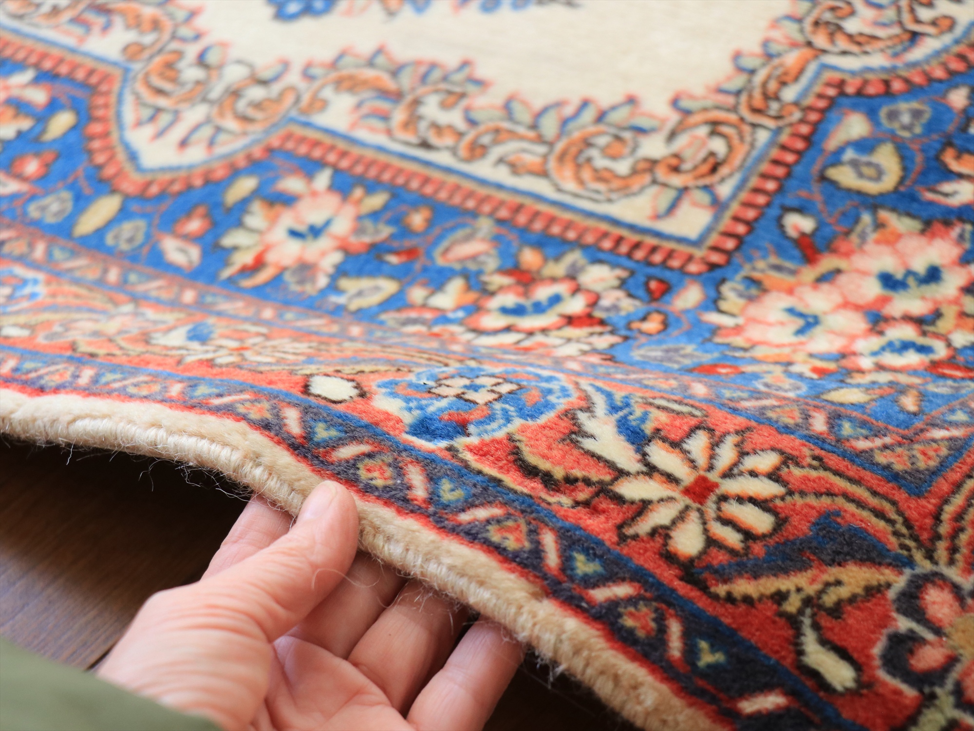 縦糸にコットンを使用しています。パイルを含めた絨毯の厚みは1cm弱で、ふっくらとしています。こちらは横幅があり、正方形や幅のある絨毯をお探しの方にはおすすめです。