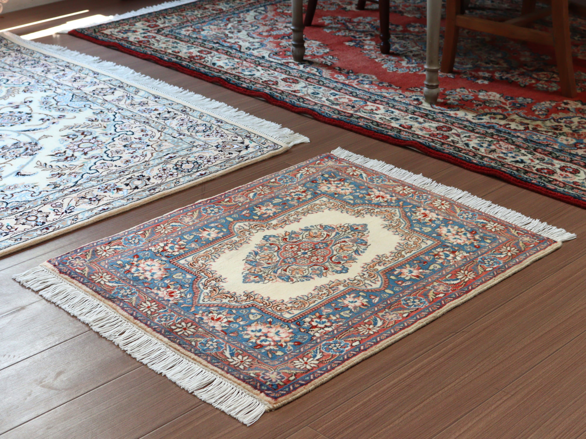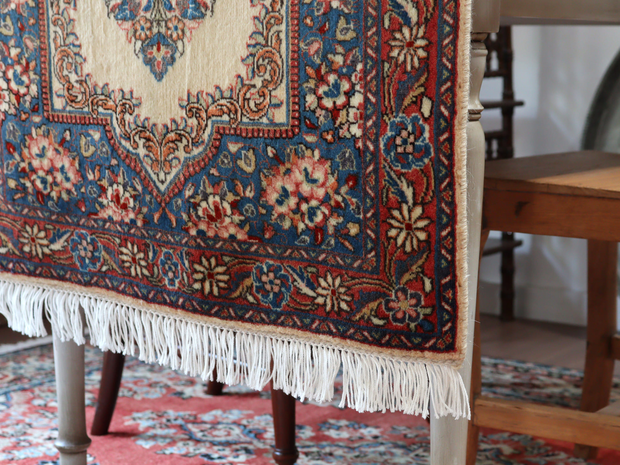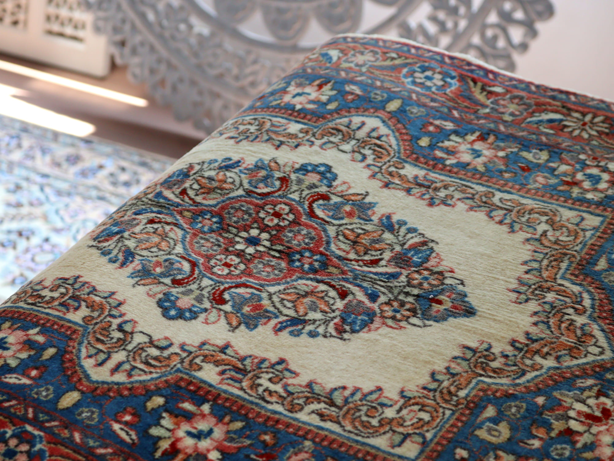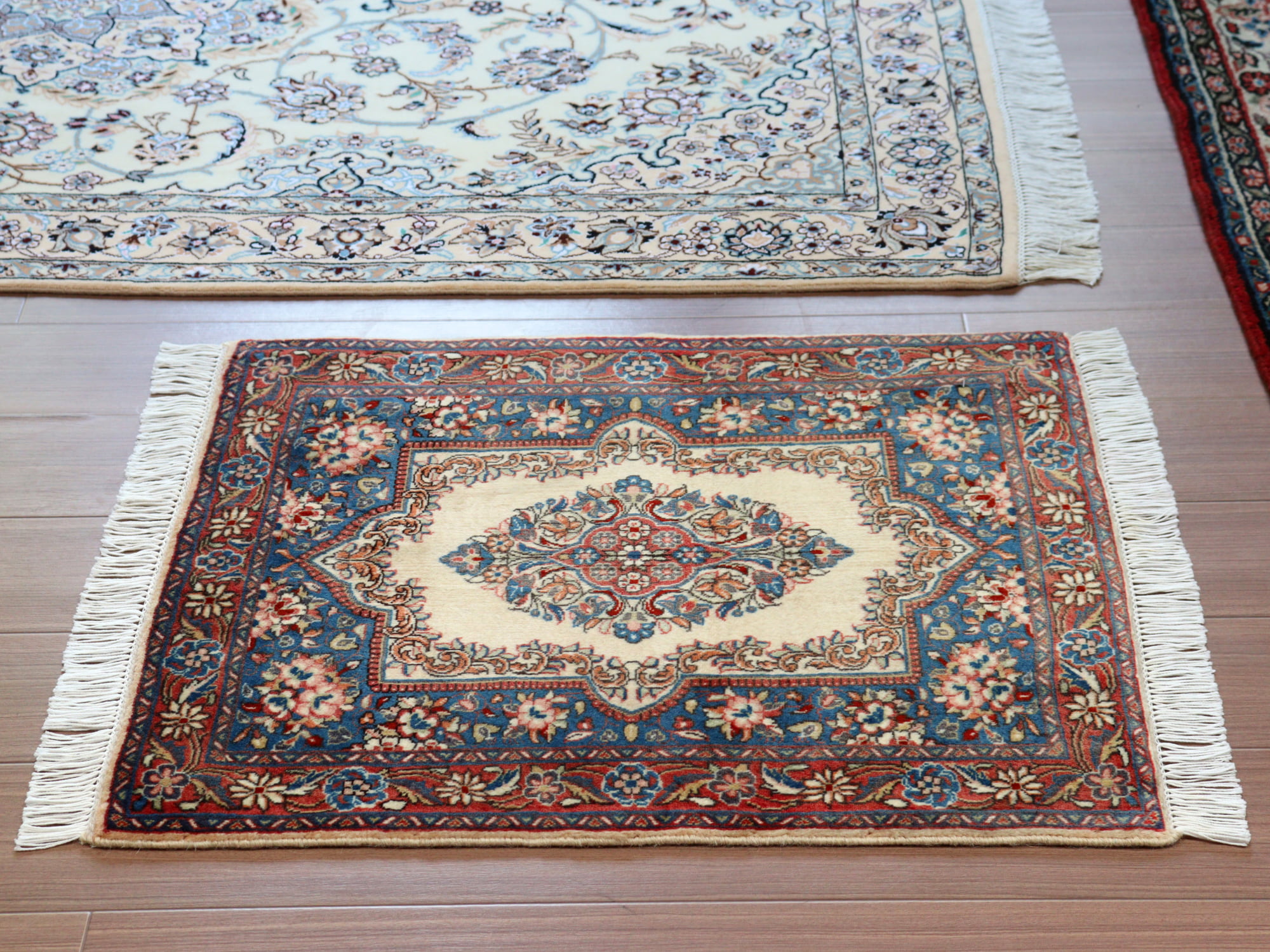 縦糸にコットンを使用しています。パイルを含めた絨毯の厚みは1cm弱で、ふっくらとしています。こちらは横幅があり、正方形や幅のある絨毯をお探しの方にはおすすめです。