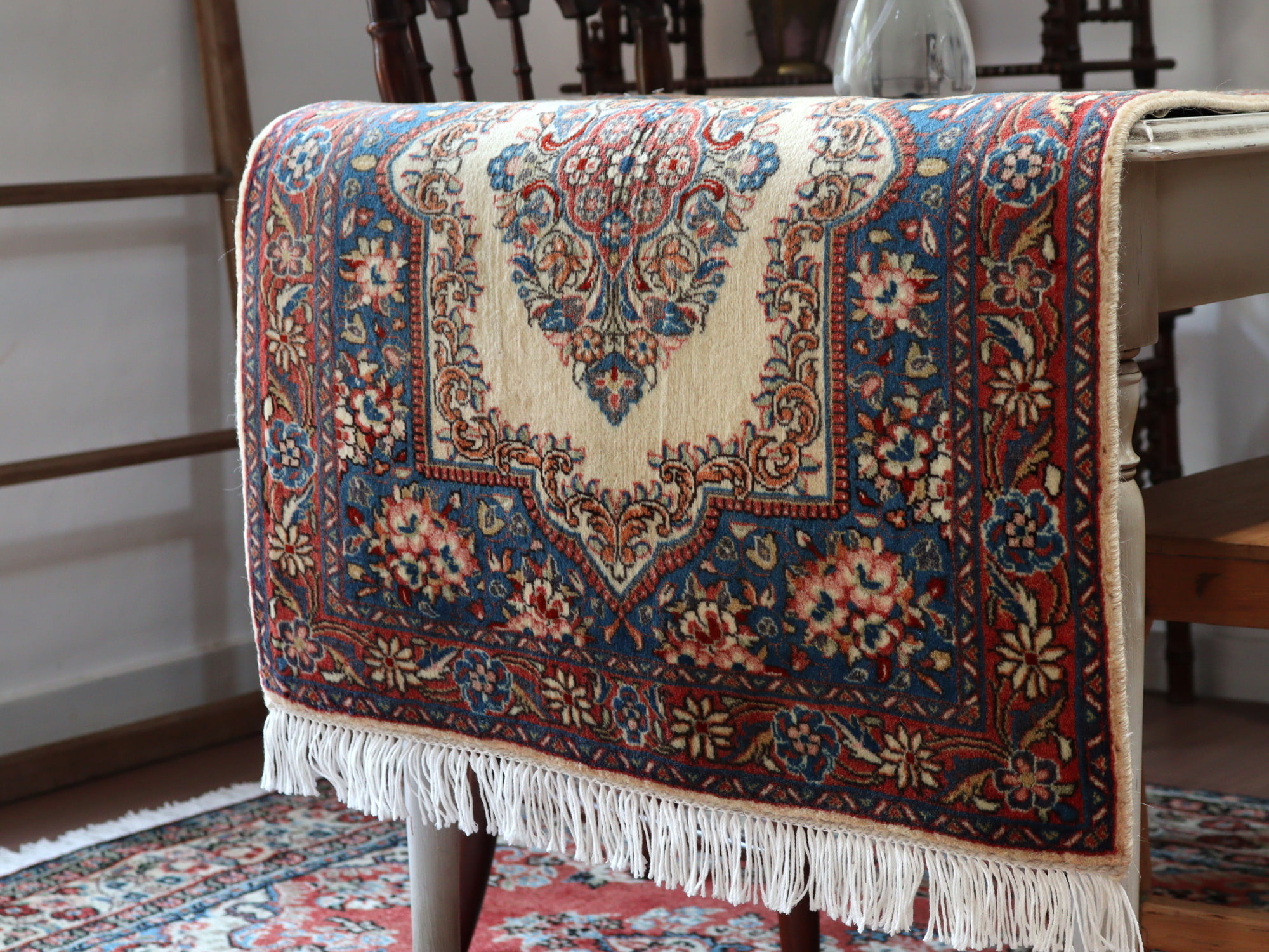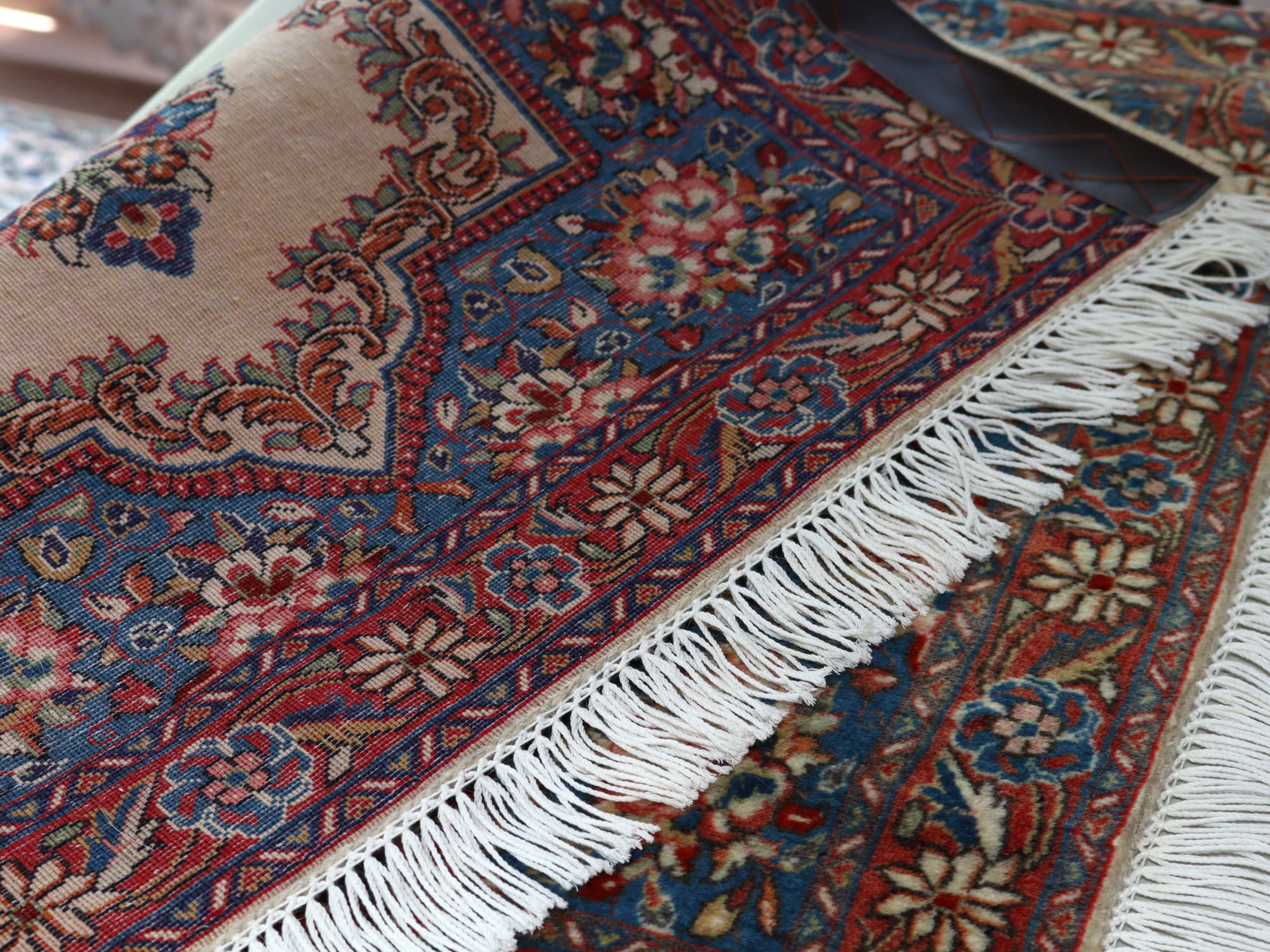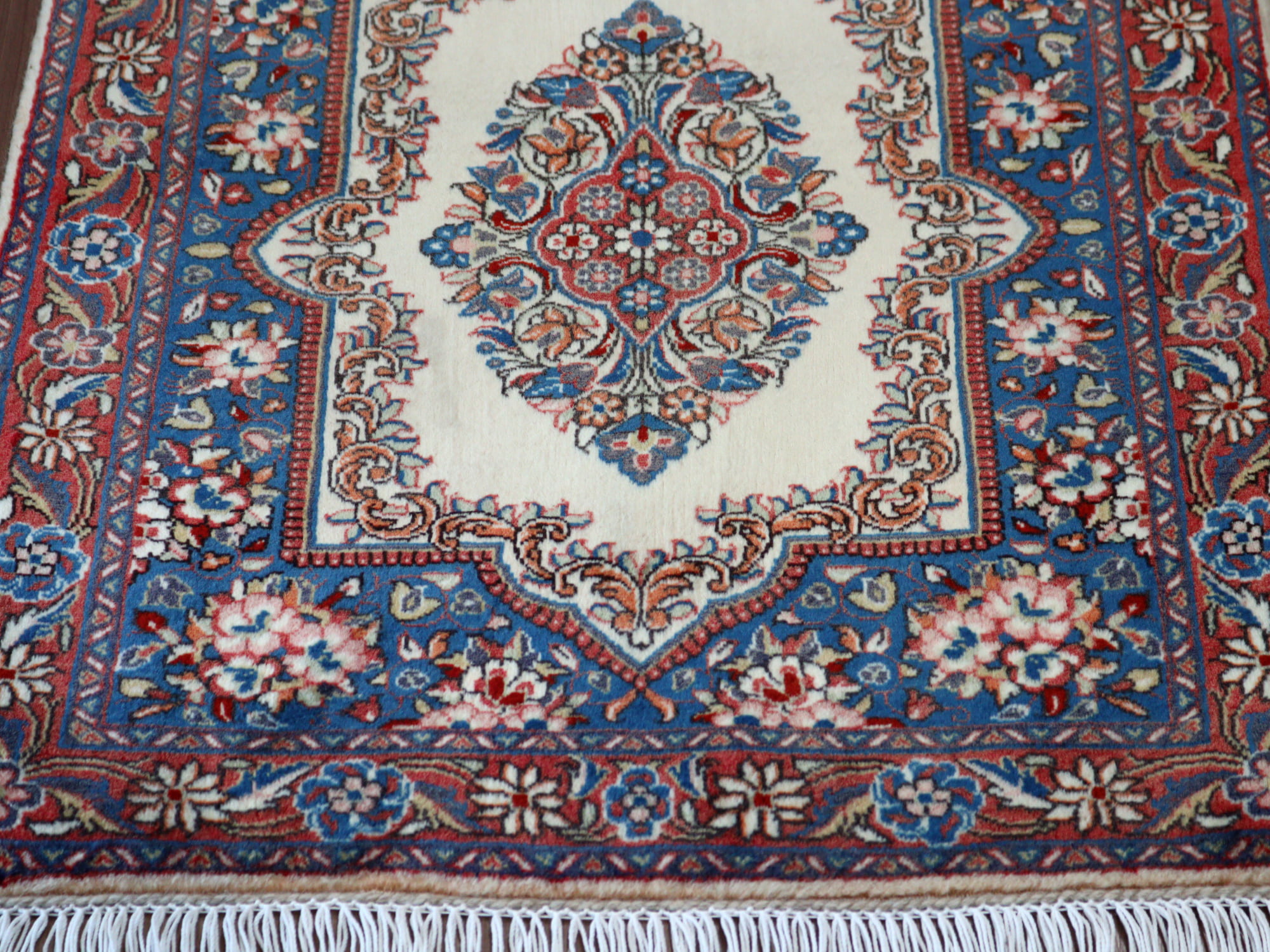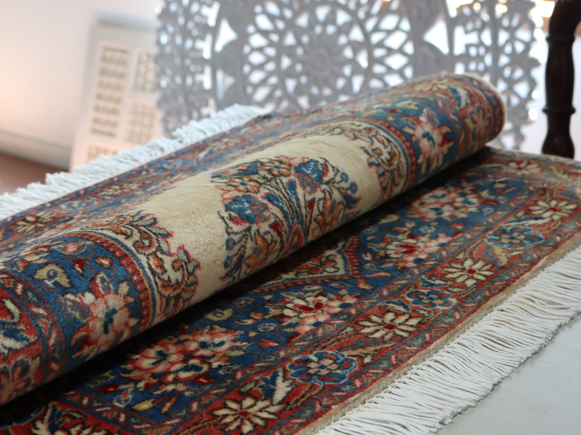 縦糸にコットンを使用しています。パイルを含めた絨毯の厚みは1cm弱で、ふっくらとしています。こちらは横幅があり、正方形や幅のある絨毯をお探しの方にはおすすめです。