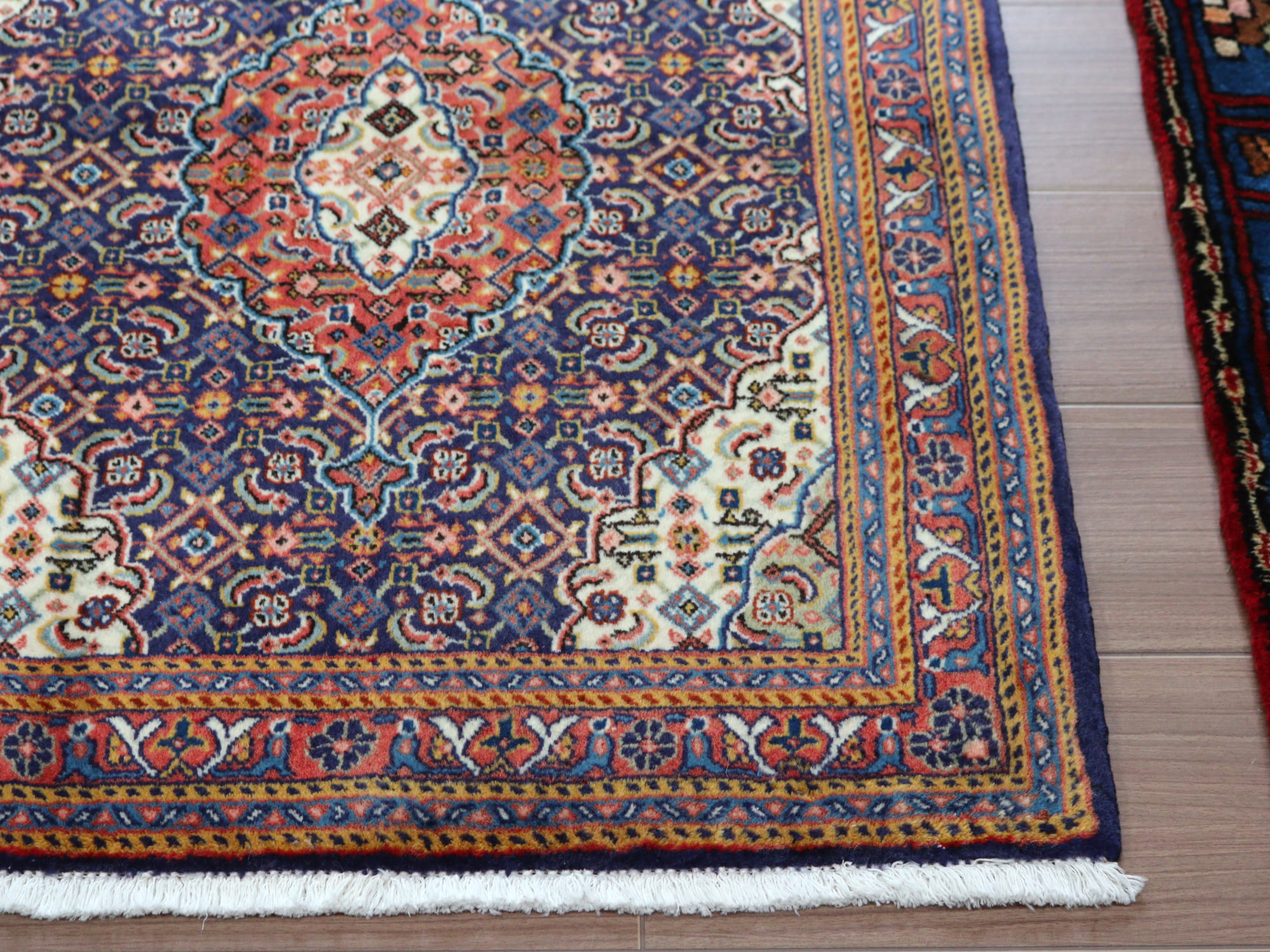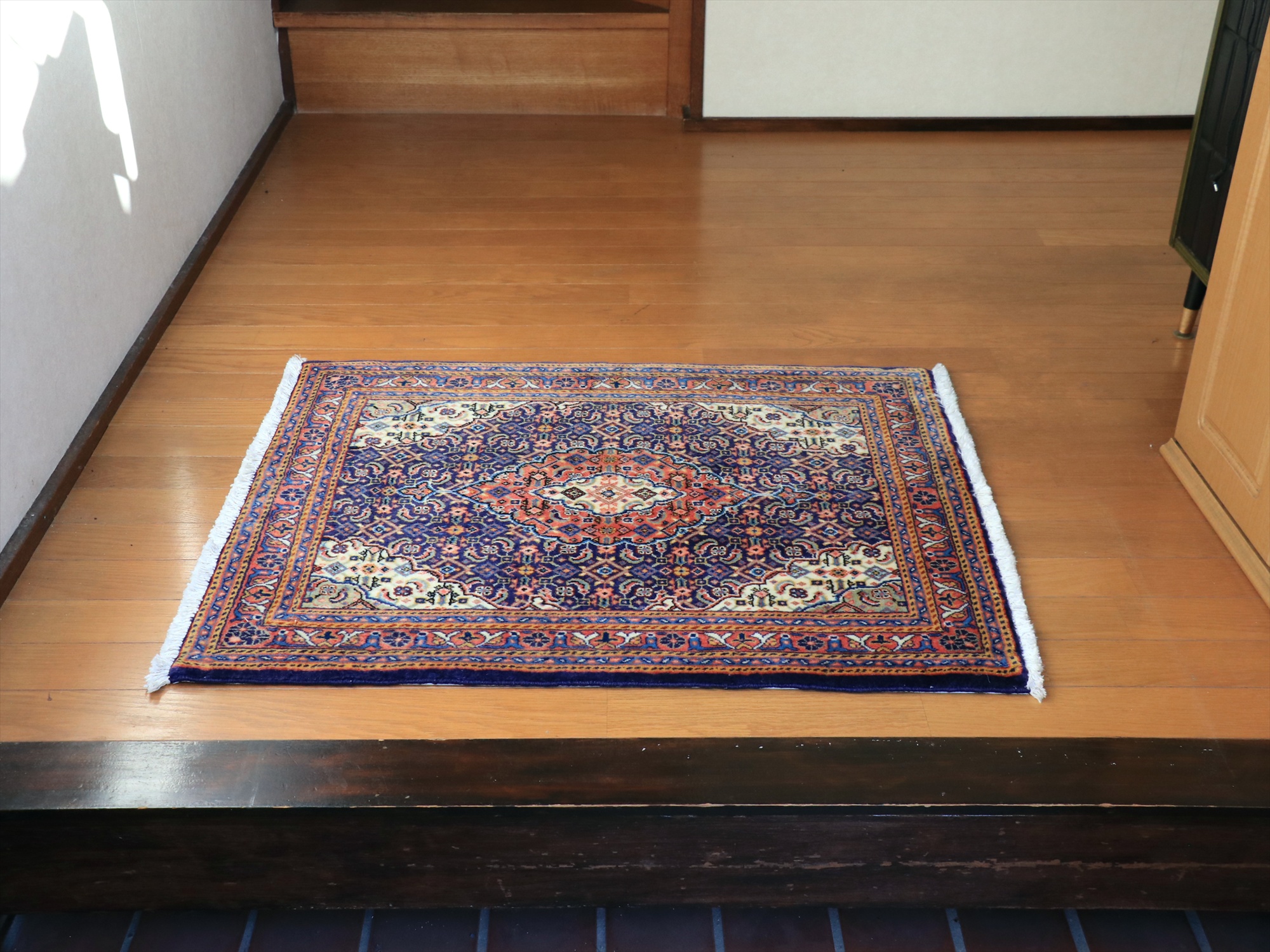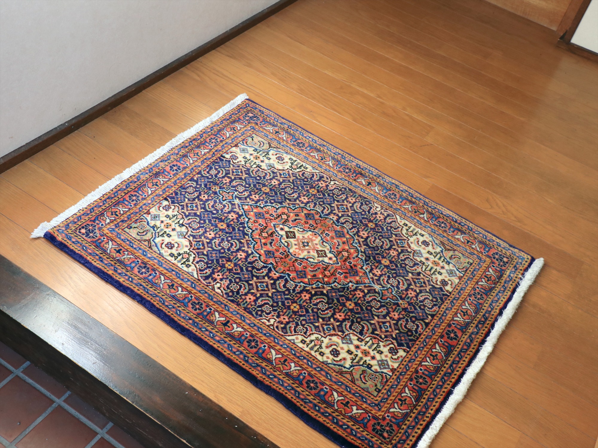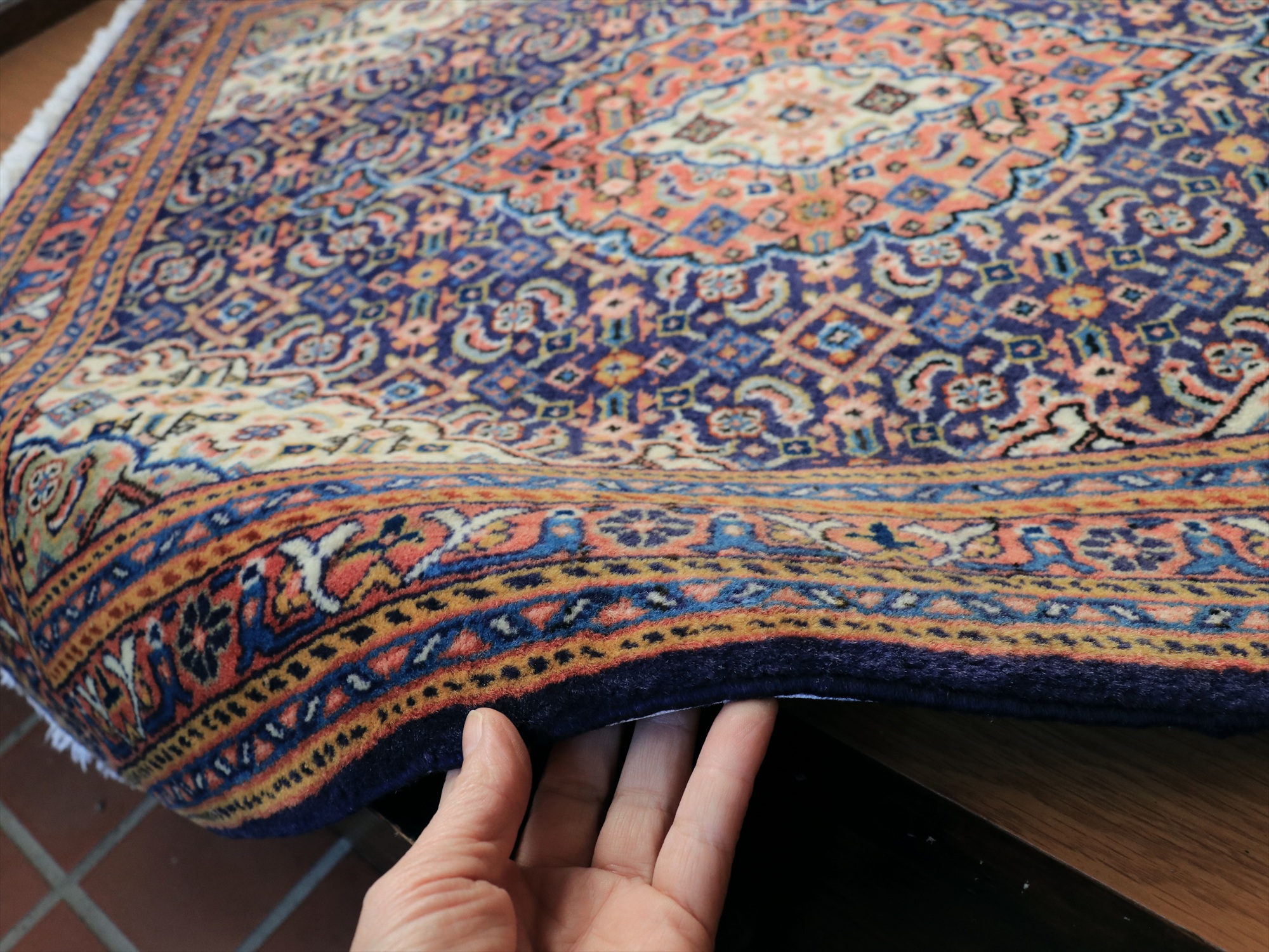 縦糸にコットンを使用しています。ベースを含めた絨毯の厚みは0.7cm程で、パイルはすっきりと刈られています。こちらは横幅があり、正方形や幅のある絨毯をお探しの方にはおすすめです。