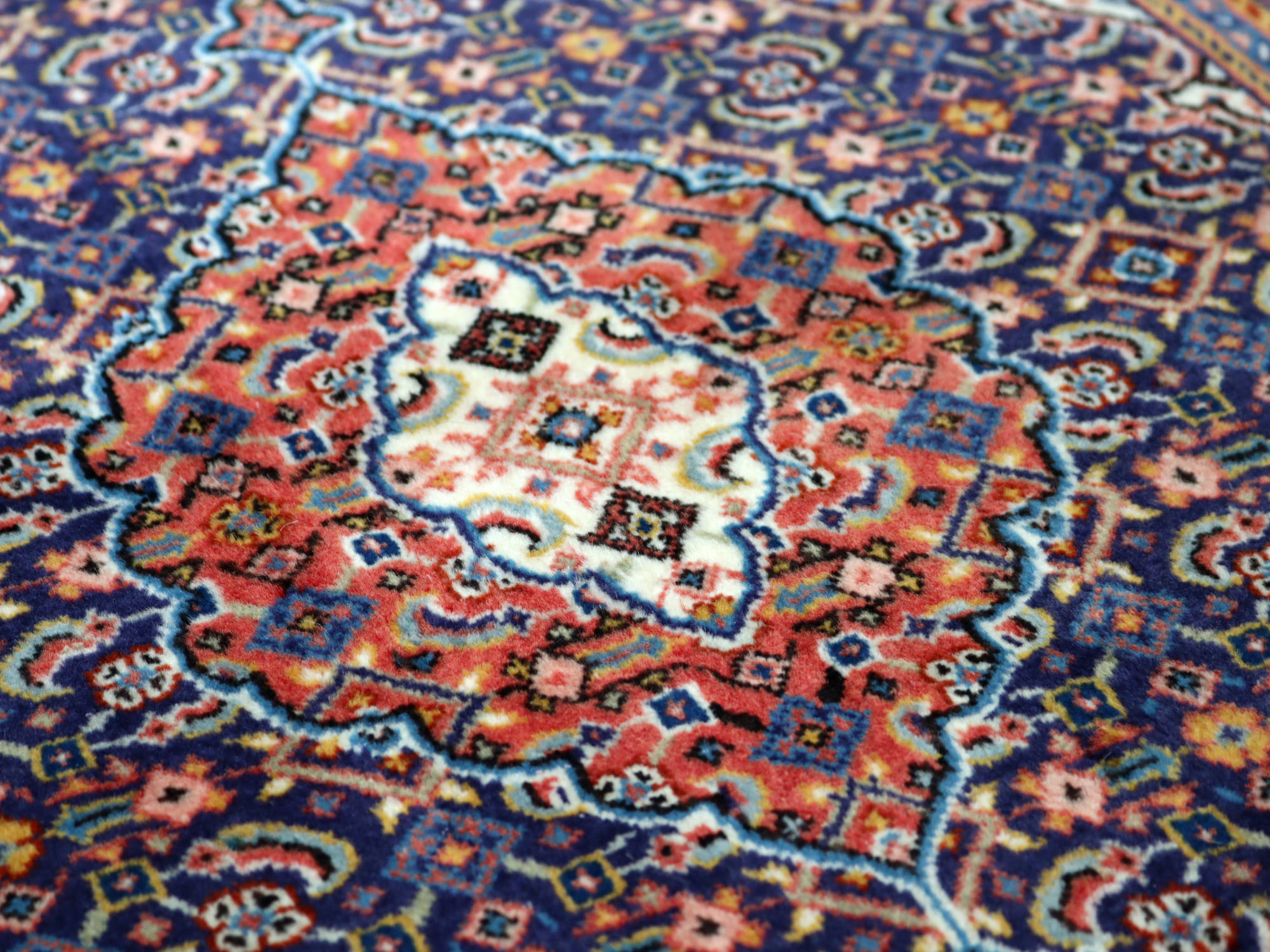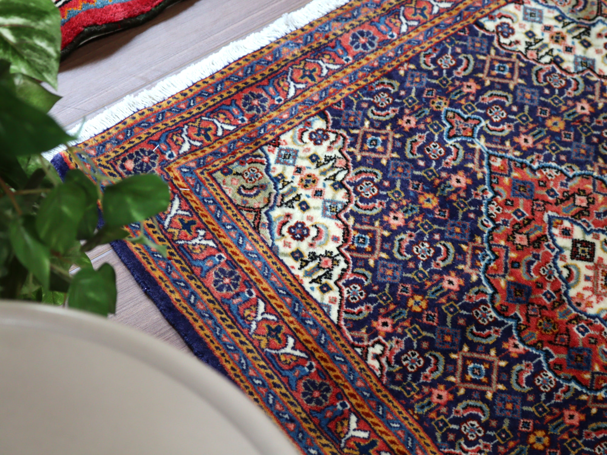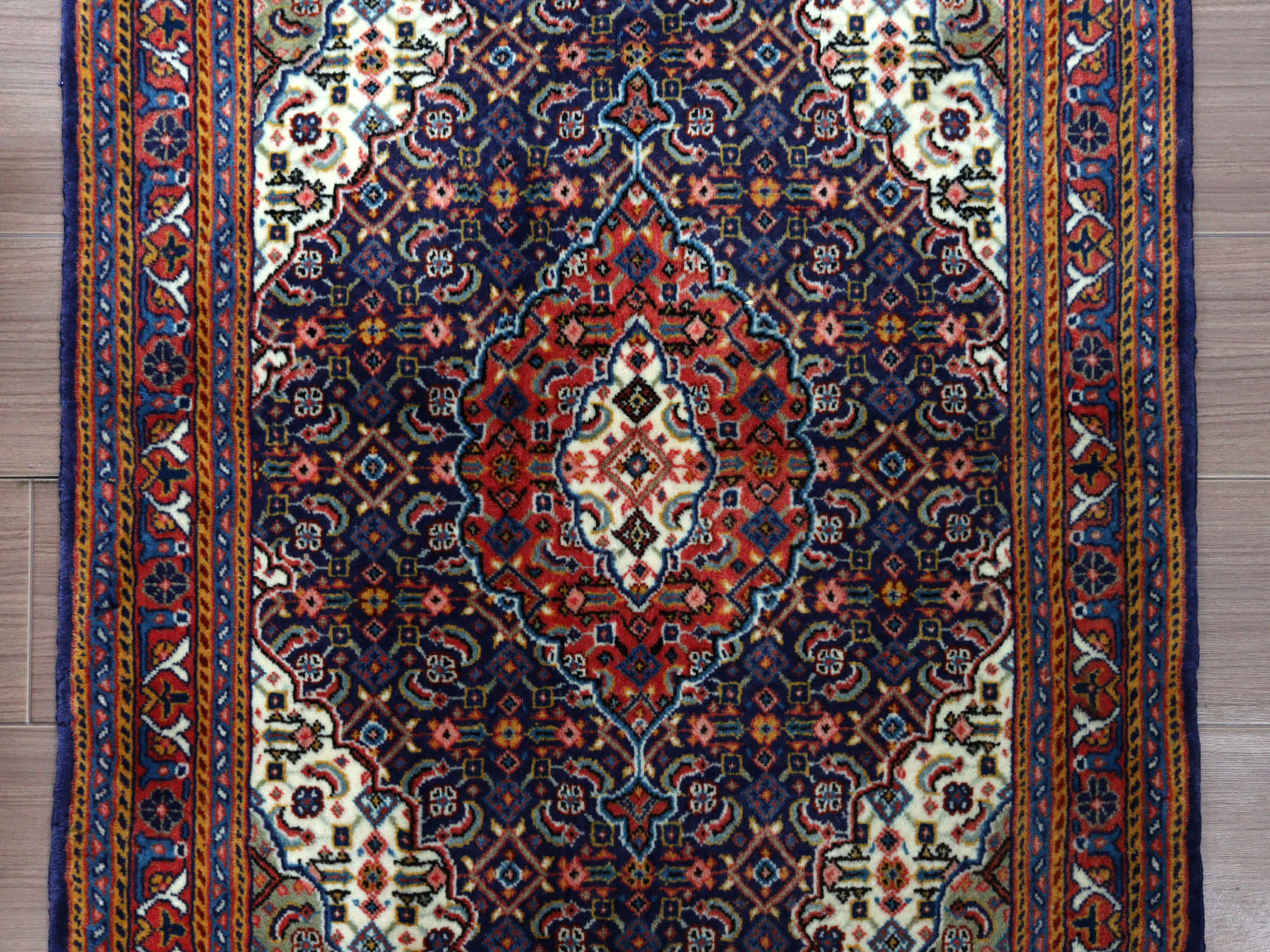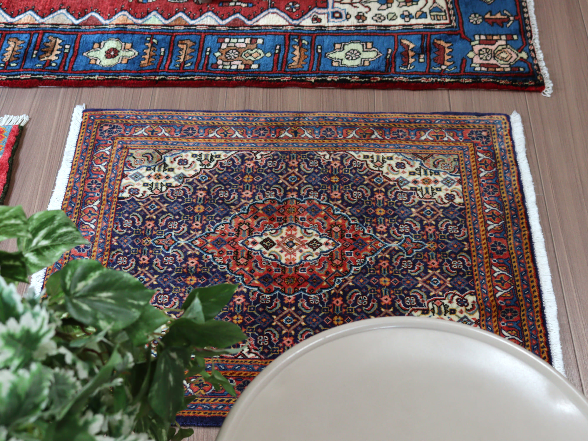 縦糸にコットンを使用しています。ベースを含めた絨毯の厚みは0.7cm程で、パイルはすっきりと刈られています。こちらは横幅があり、正方形や幅のある絨毯をお探しの方にはおすすめです。