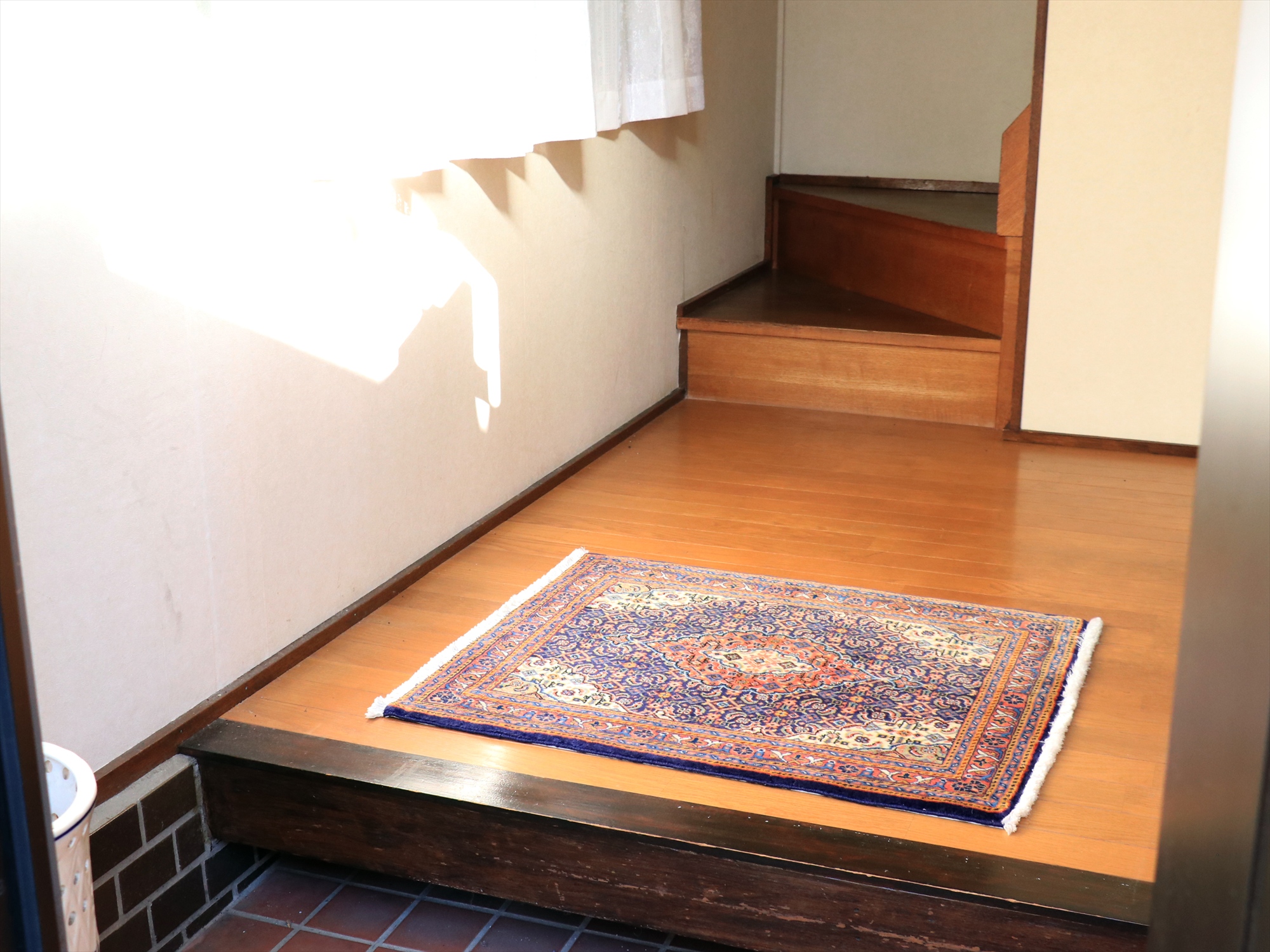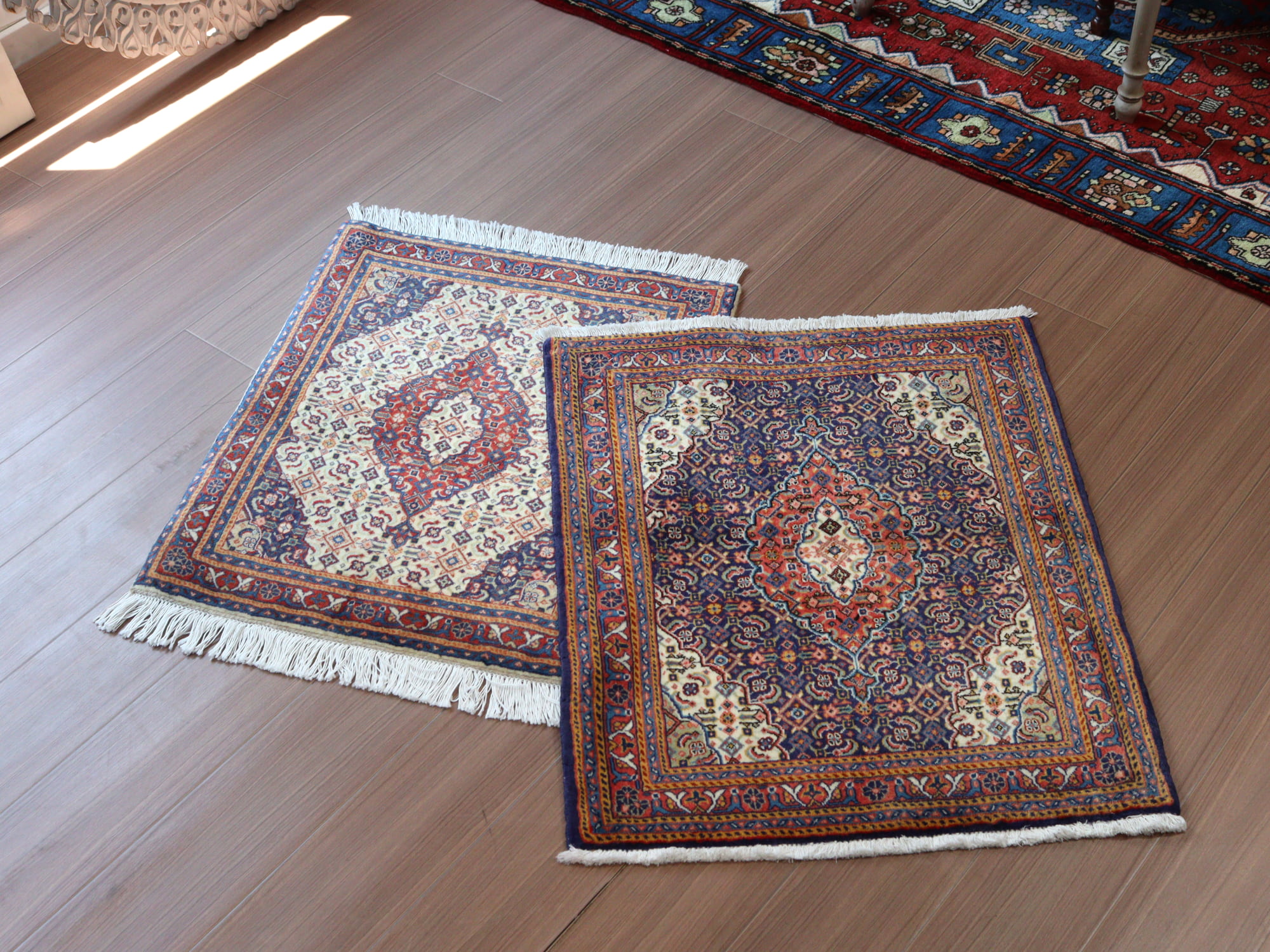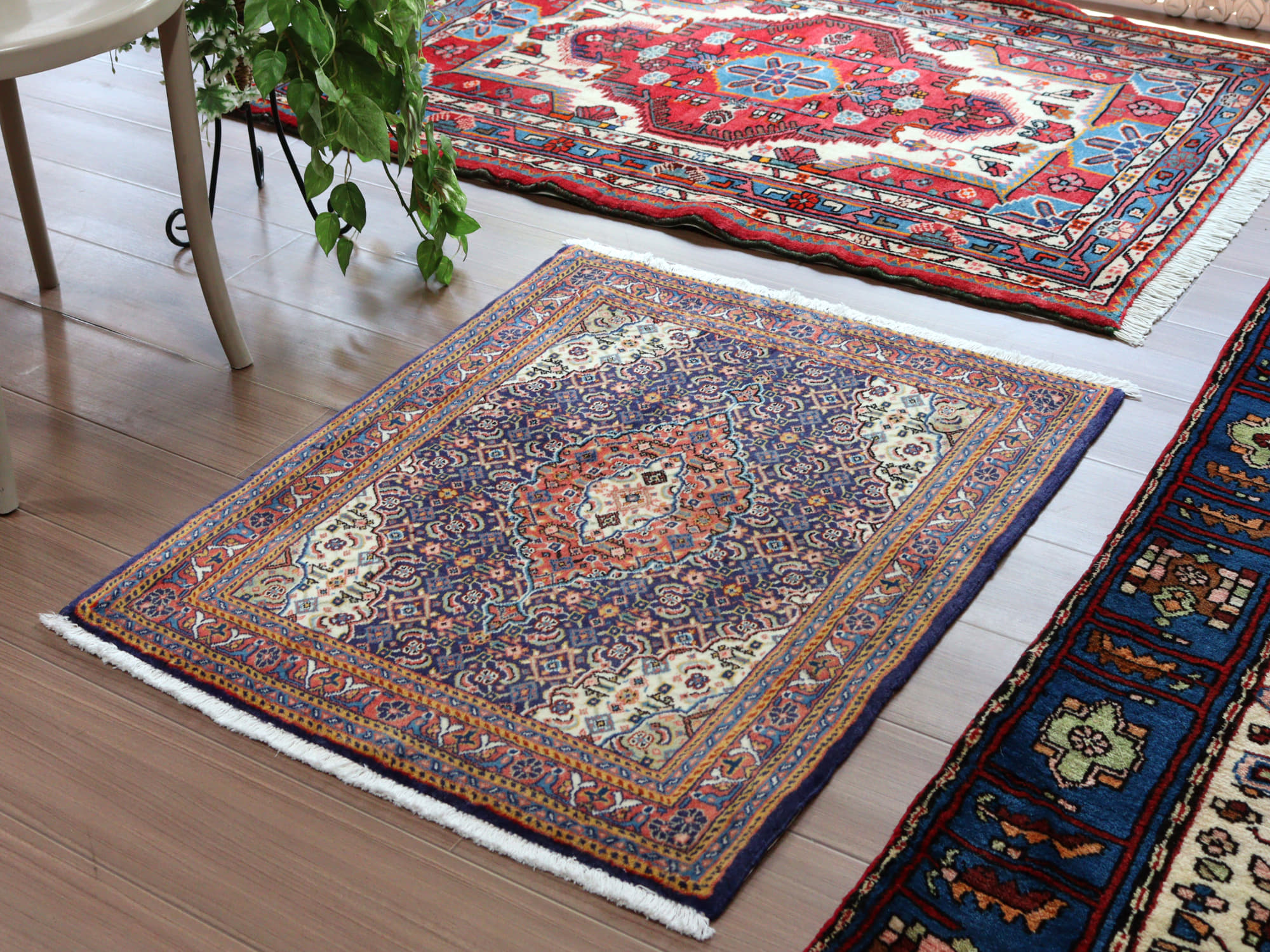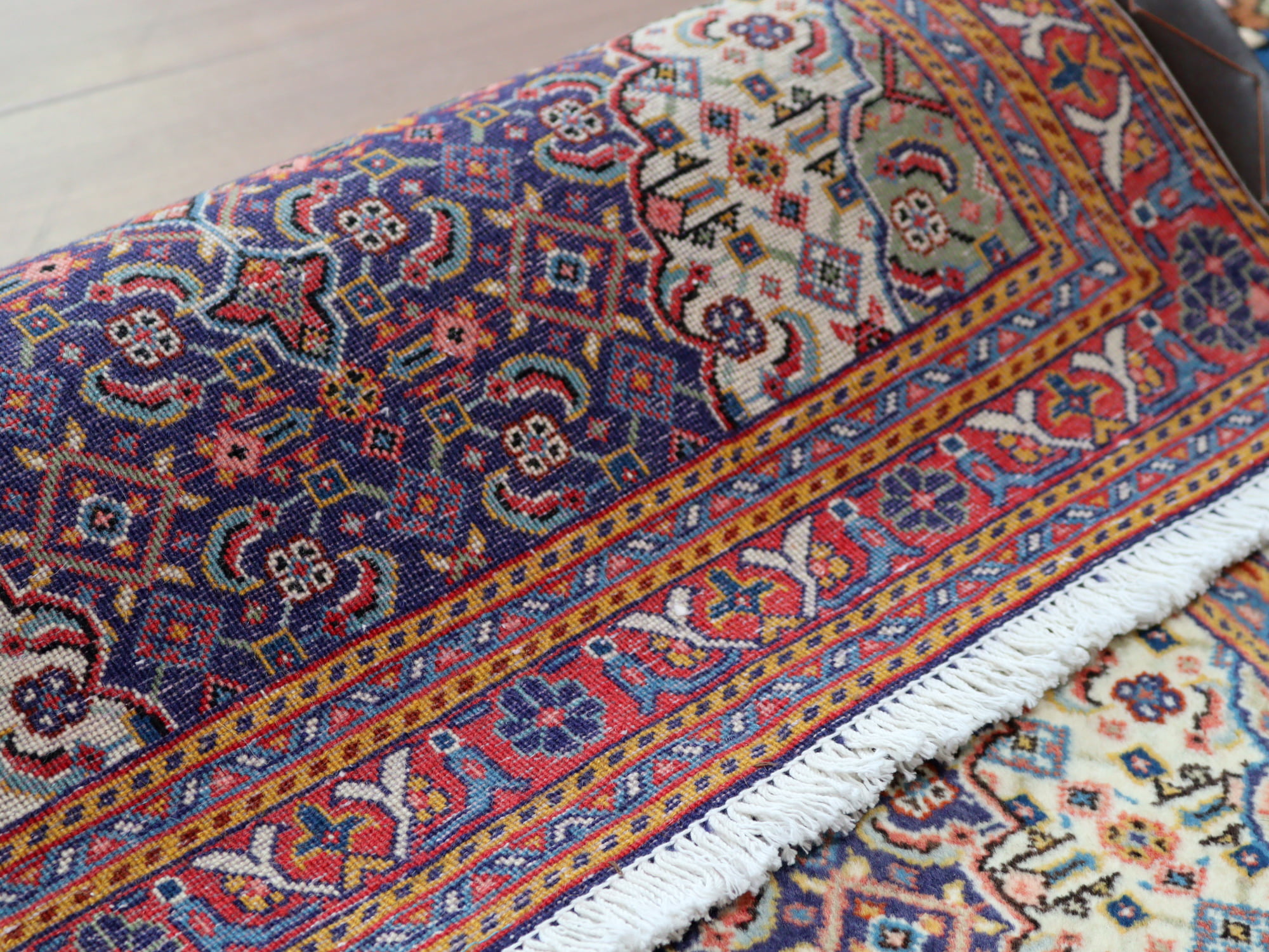 縦糸にコットンを使用しています。ベースを含めた絨毯の厚みは0.7cm程で、パイルはすっきりと刈られています。こちらは横幅があり、正方形や幅のある絨毯をお探しの方にはおすすめです。