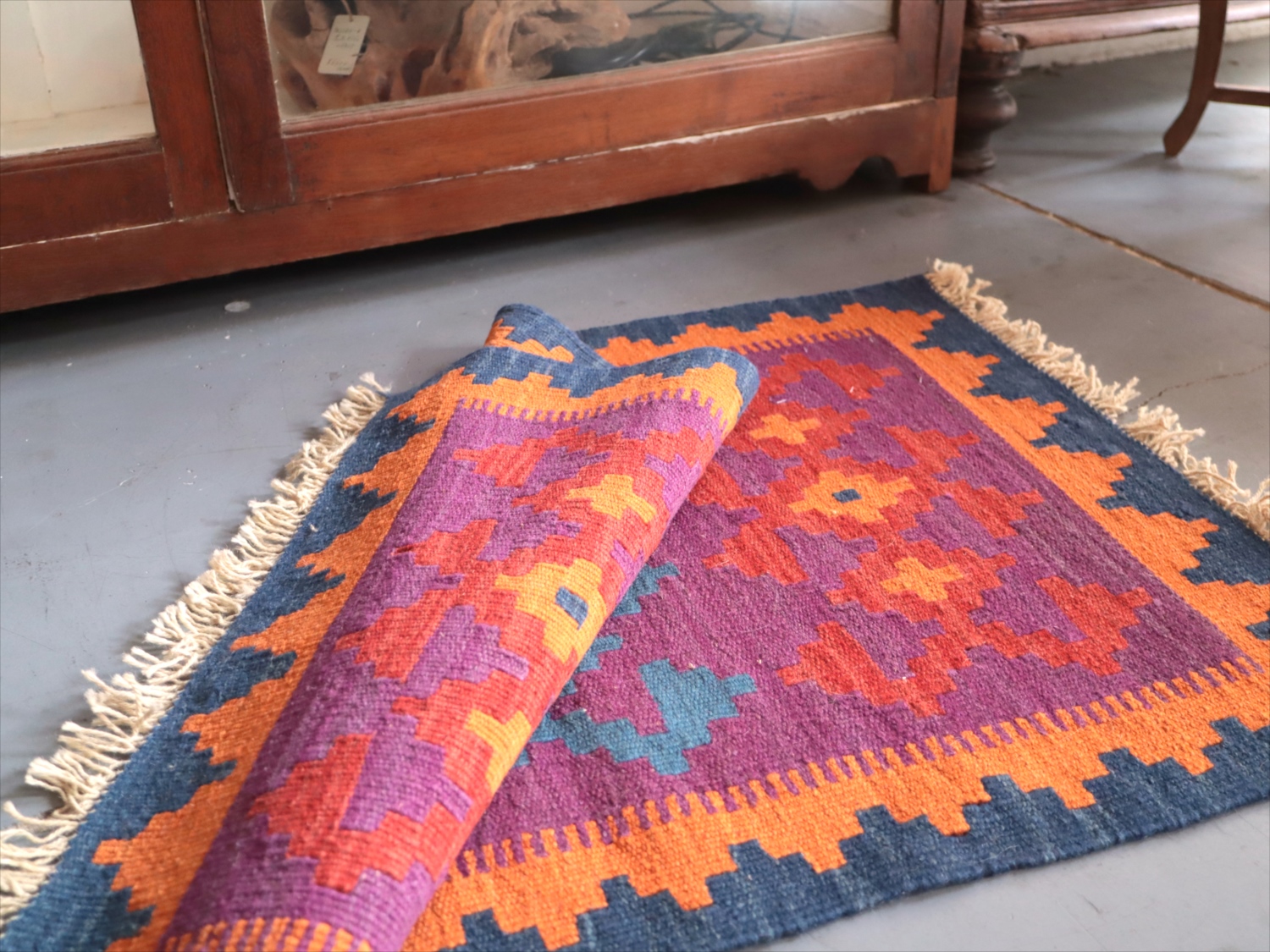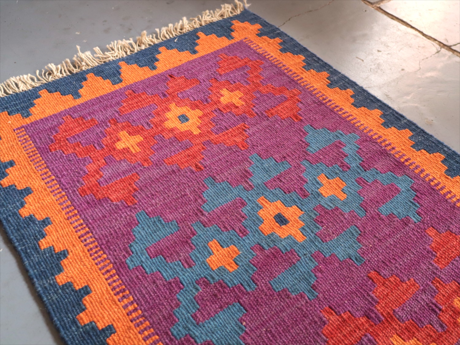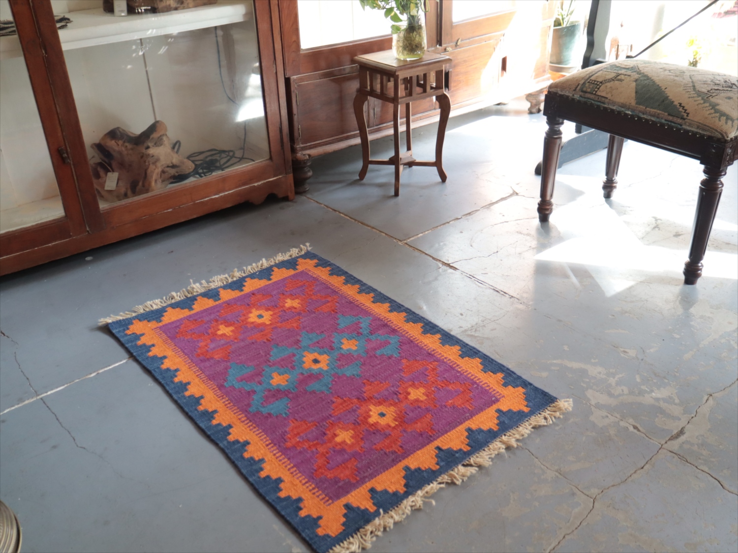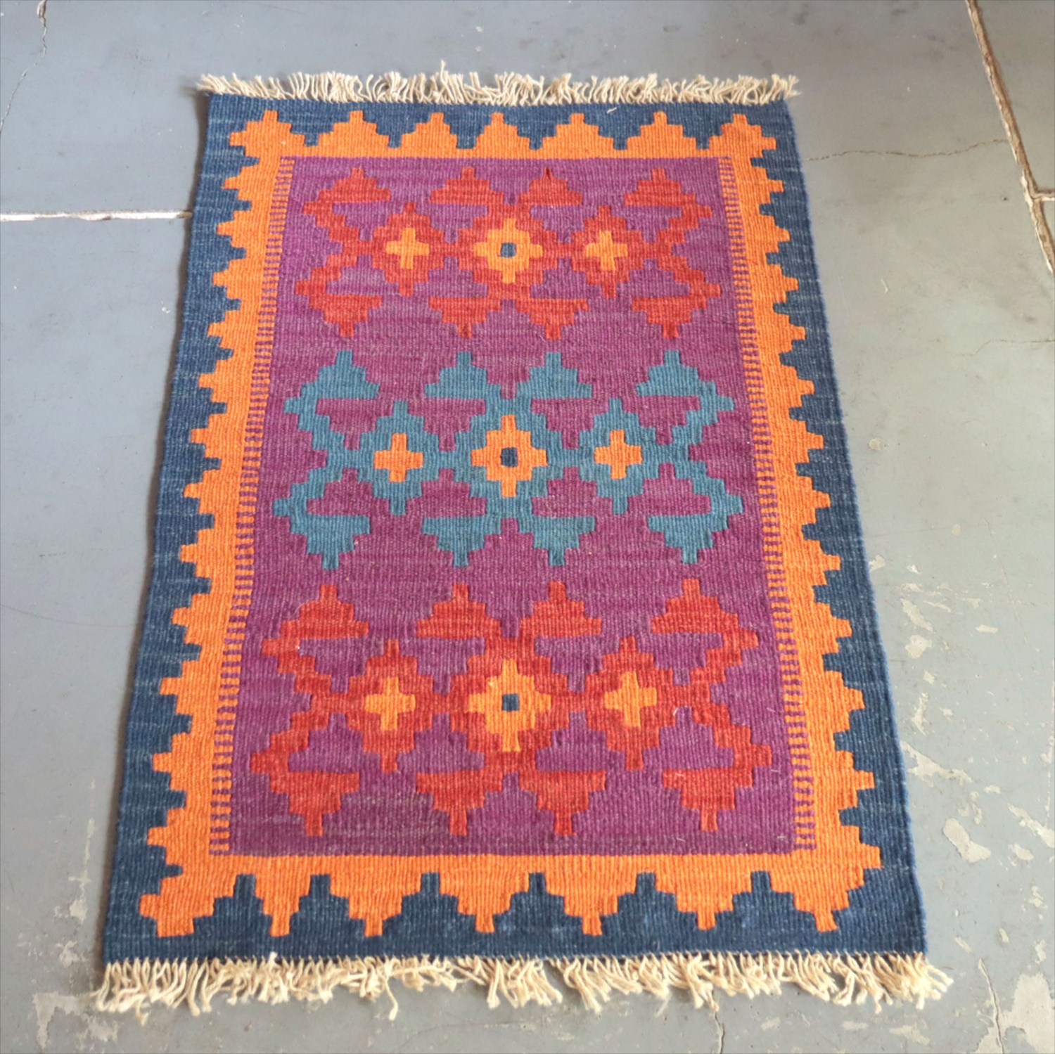 6-7mm程度の厚みがあり、パイル(毛足)がない平織りの敷物で表面は少しザラっとした肌ざわりです。織り手の自由なアイデアでデザインされていますので、左右対象でなかったり、モチーフが少しずれていたりということもありますが、世界で一枚だけの作品ですからその点はご了承ください。