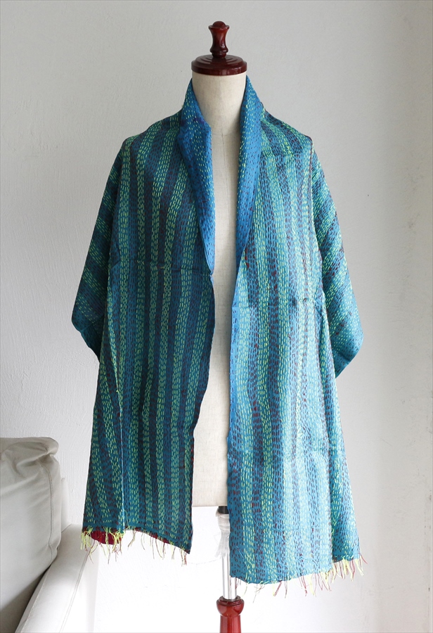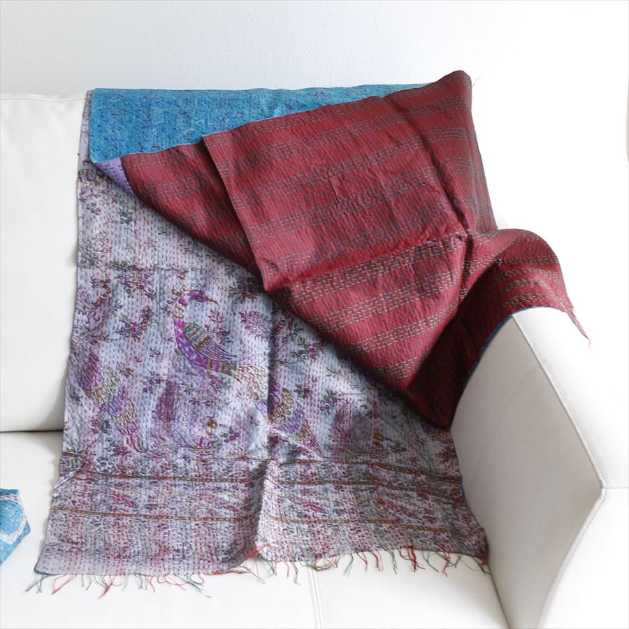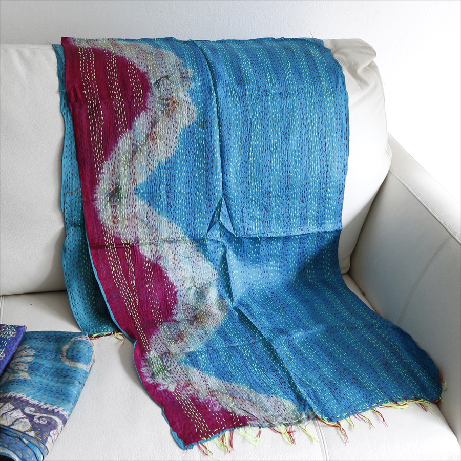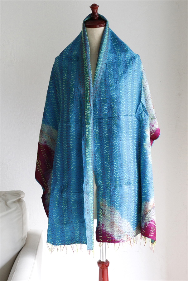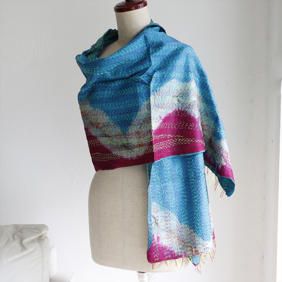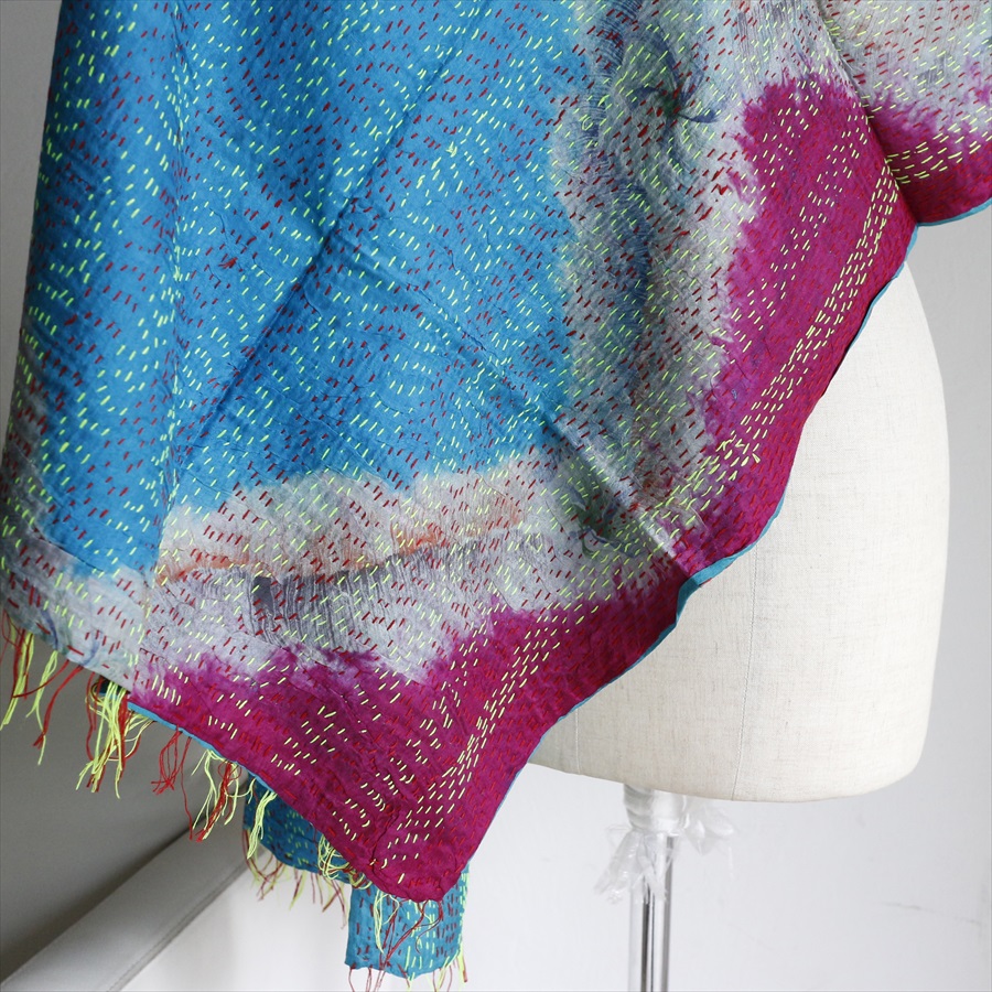 カンタ刺繍のシルクストールです。シルクの光沢感、布地の色柄とビビットな刺繍が個性的な布。ベースのシルク地はサリー(女性の衣装)のリサイクルで、表と裏に違う色柄の布を合わせて手作業で縫い合わされています。表裏ともにシルクなので軽くてさらりとした肌触りです。
