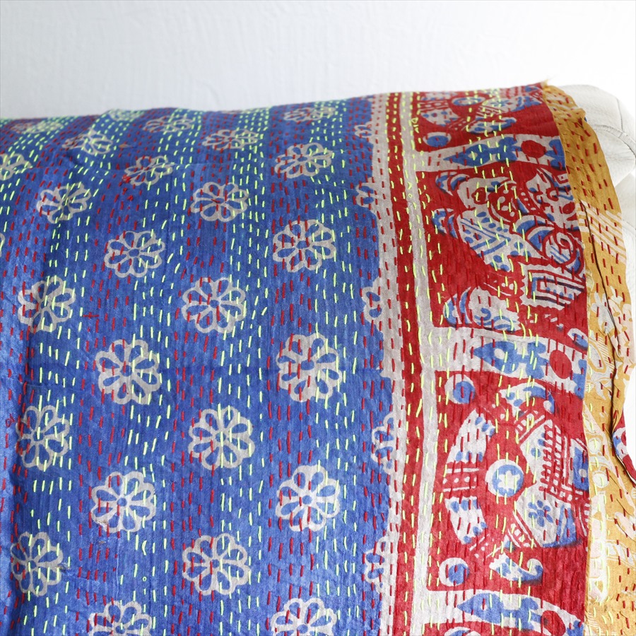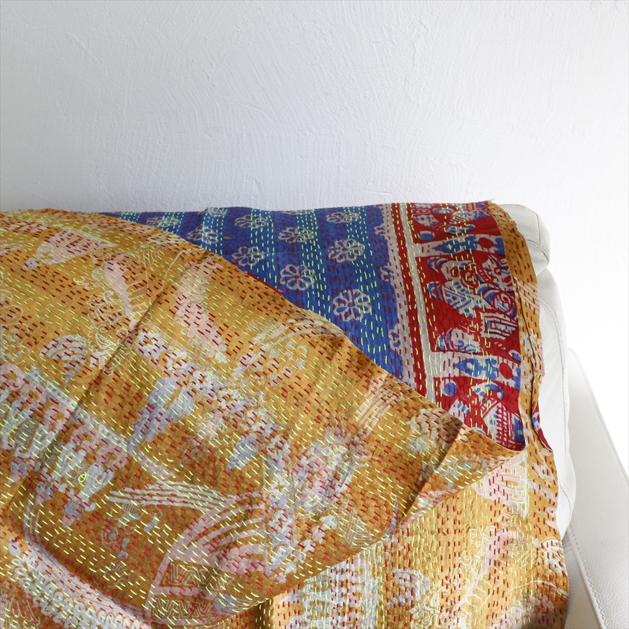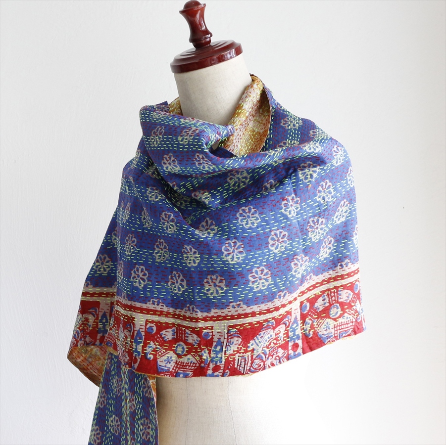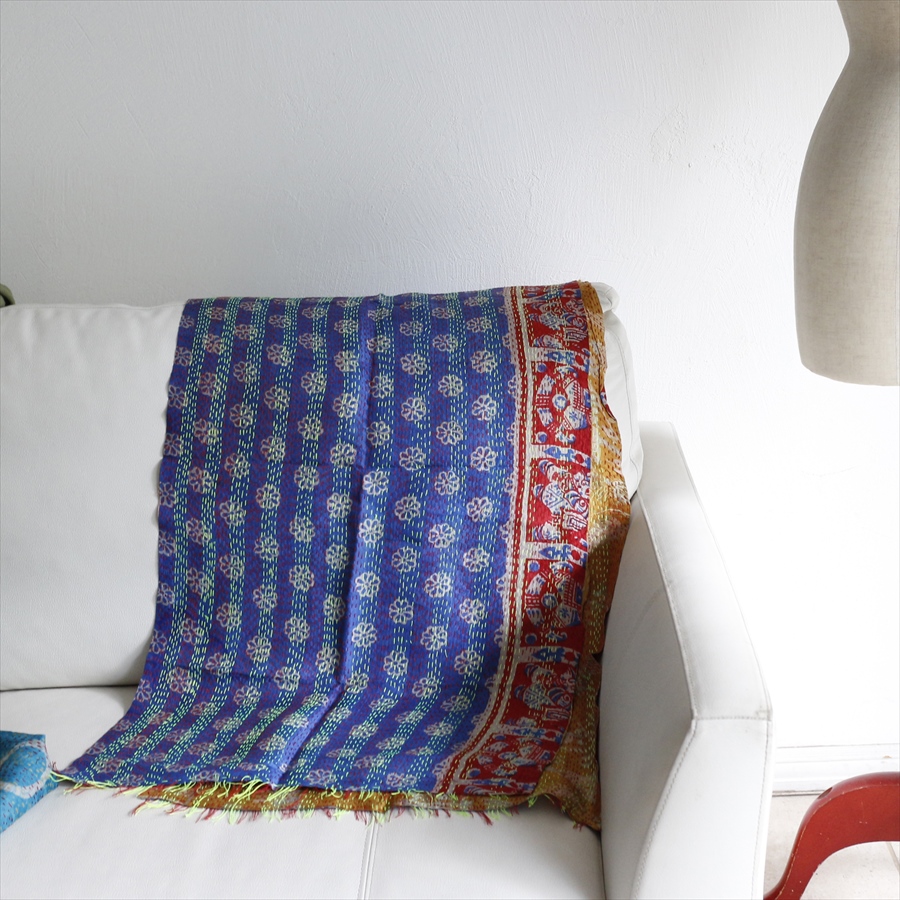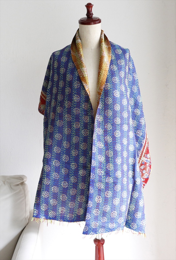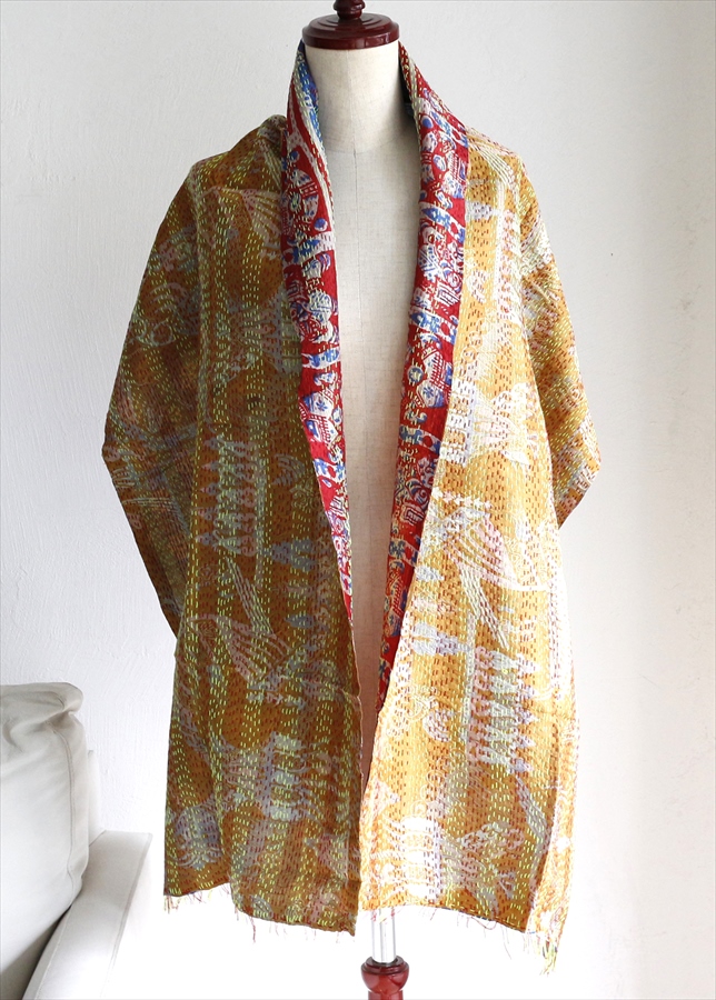 カンタ刺繍のシルクストールです。シルクの光沢感、布地の色柄とビビットな刺繍が個性的な布。ベースのシルク地はサリー(女性の衣装)のリサイクルで、表と裏に違う色柄の布を合わせて手作業で縫い合わされています。表裏ともにシルクなので軽くてさらりとした肌触りです。