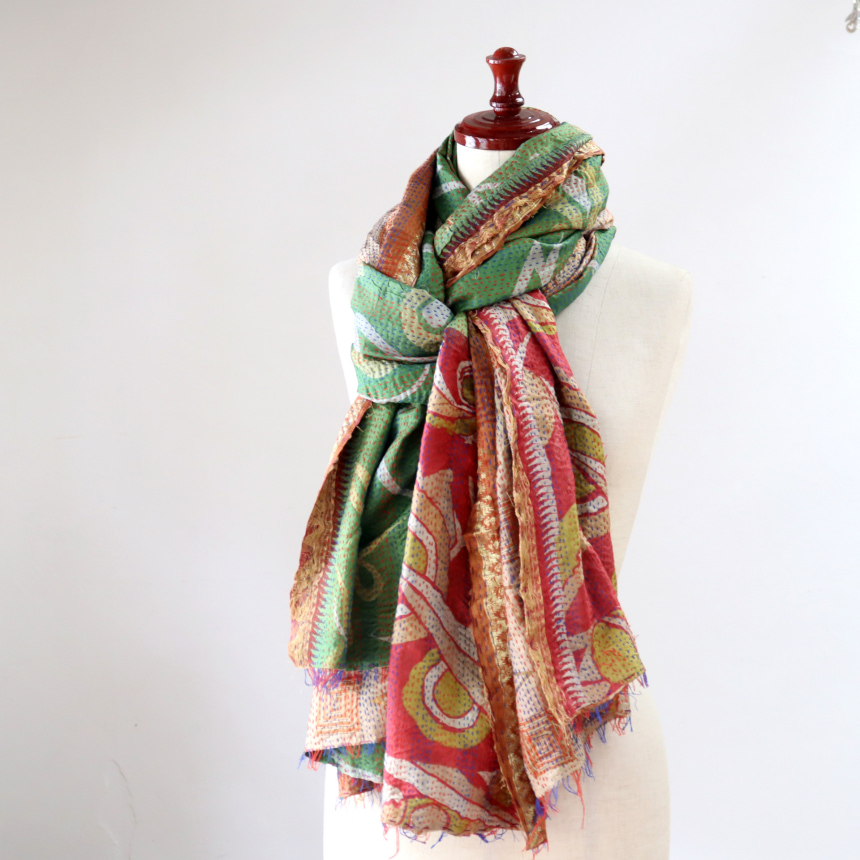 カンタ刺繍のシルクストールです。シルクの光沢感、布地の色柄とビビットな刺繍が個性的な布。ベースのシルク地はサリー(女性の衣装)のリサイクルで、表と裏に違う色柄の布を合わせて手作業で縫い合わされています。表裏ともにシルクなので軽くてさらりとした肌触りです。