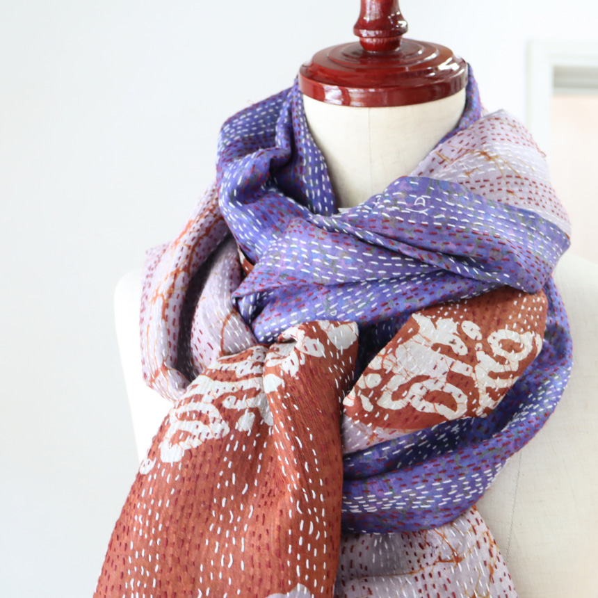カンタ刺繍のシルクストールです。シルクの光沢感、布地の色柄とビビットな刺繍が個性的な布。ベースのシルク地はサリー(女性の衣装)のリサイクルで、表と裏に違う色柄の布を合わせて手作業で縫い合わされています。表裏ともにシルクなので軽くてさらりとした肌触りです。