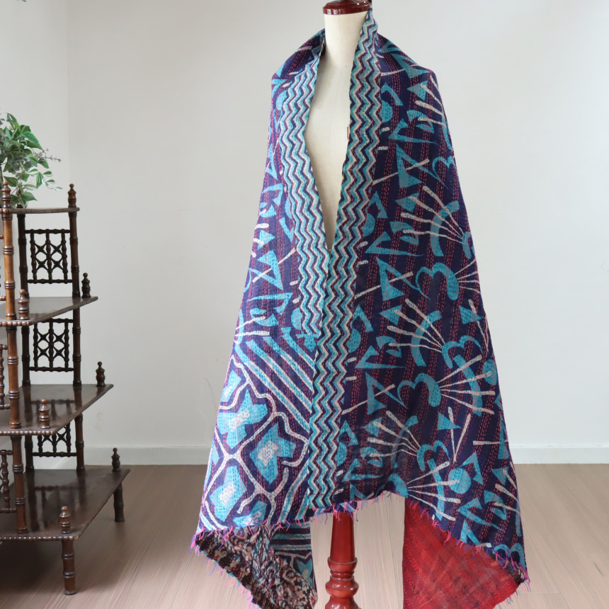 カンタ刺繍のシルクストールです。シルクの光沢感、布地の色柄とビビットな刺繍が個性的な布。ベースのシルク地はサリー(女性の衣装)のリサイクルで、表と裏に違う色柄の布を合わせて手作業で縫い合わされています。表裏ともにシルクなので軽くてさらりとした肌触りです。