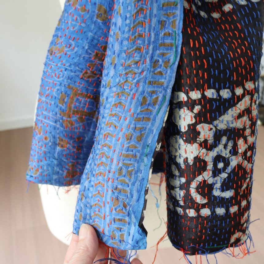 カンタ刺繍のシルクストールです。シルクの光沢感、布地の色柄とビビットな刺繍が個性的な布。ベースのシルク地はサリー(女性の衣装)のリサイクルで、表と裏に違う色柄の布を合わせて手作業で縫い合わされています。表裏ともにシルクなので軽くてさらりとした肌触りです。