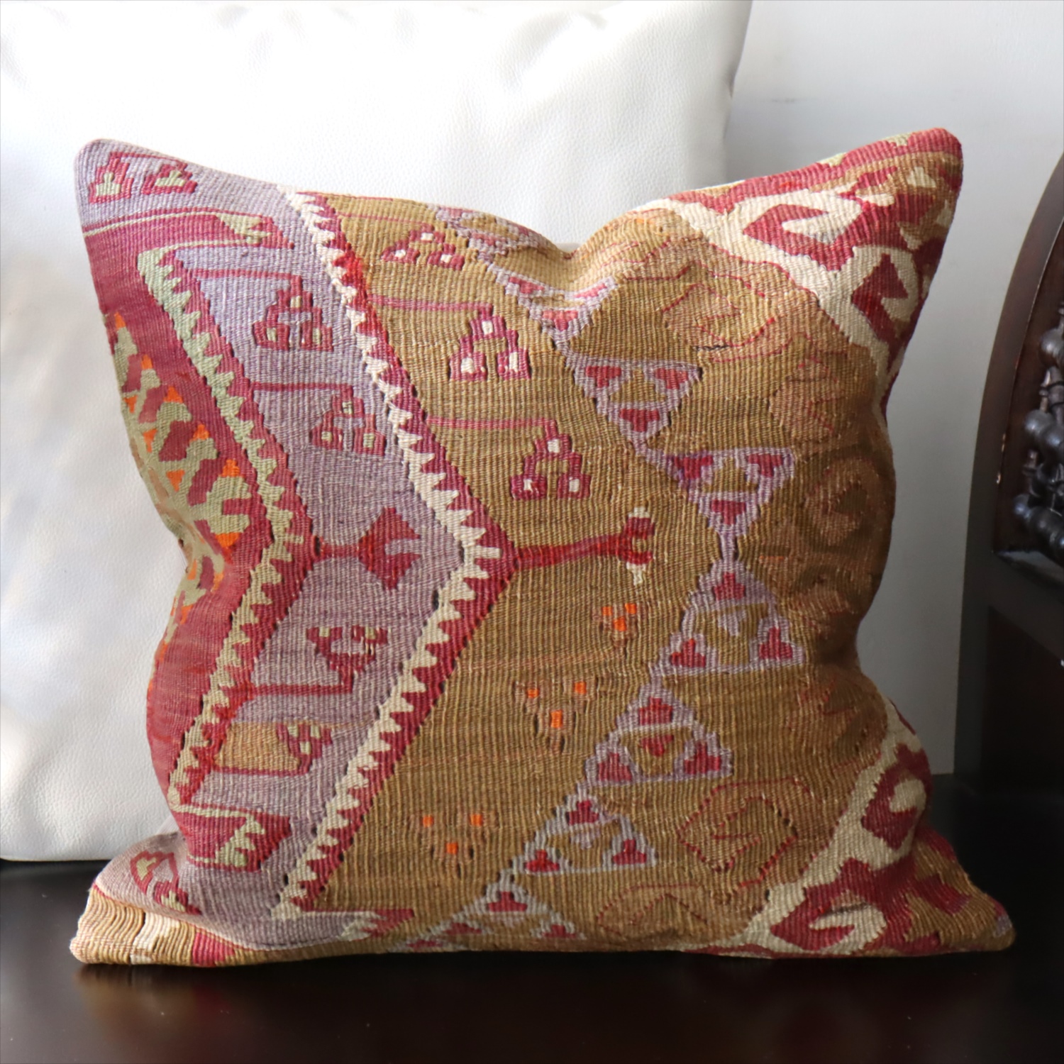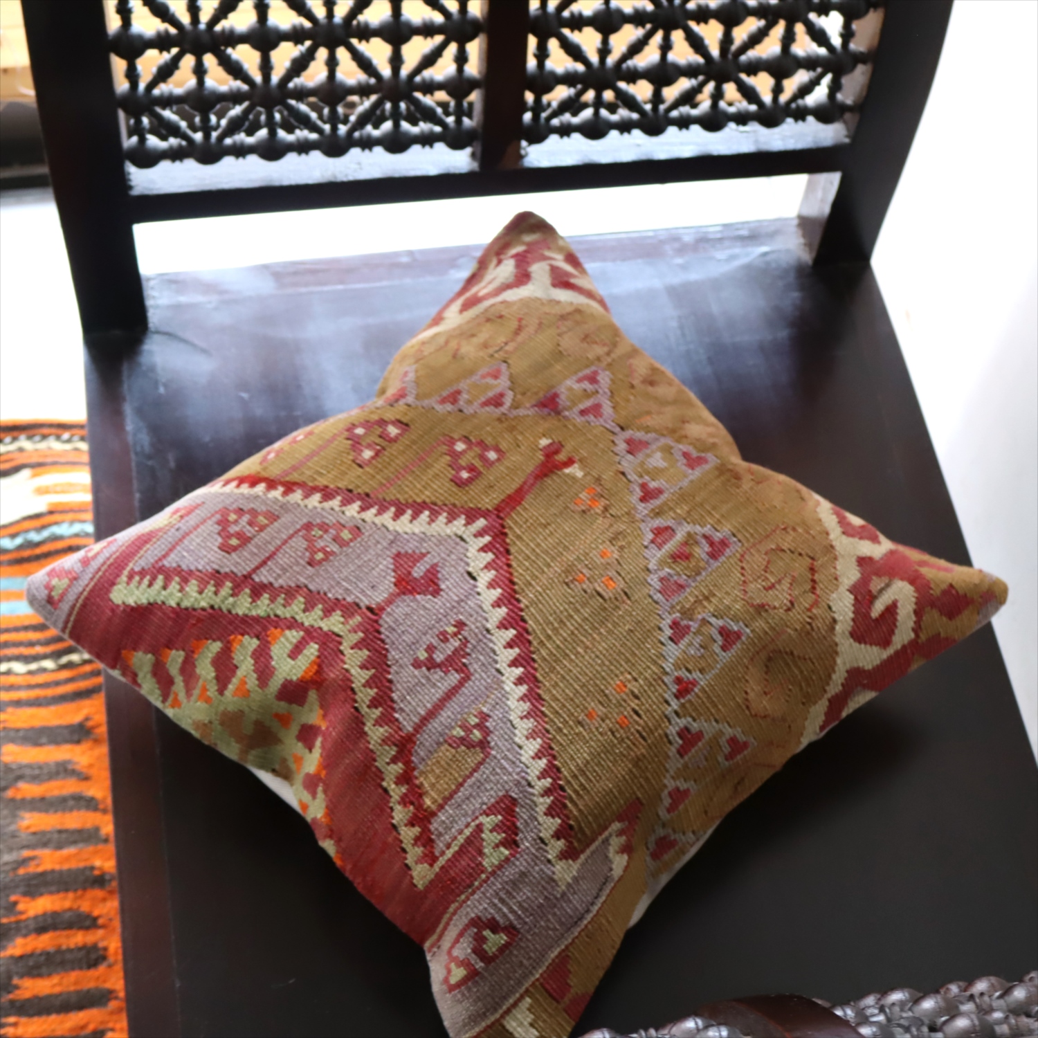 細い糸を使って織られた大型の平織りキリムをカットして作ったクッションカバーです。表面はウールのヴィンテージキリム、裏面は無地のコットン地です。