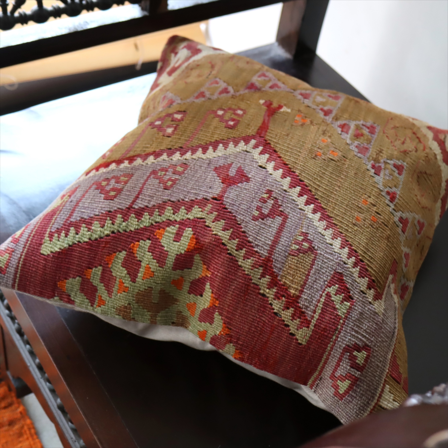20世紀中頃に、アナトリア(トルコ)中央部、カイセリ地方で織られたもので、年代は古いものの、大切に保管されていたようで、日焼けやほつれなどはほとんど見られません。お部屋でクッションとしてお使いいただく間に、少しずつ褪色してやわらかな色に変化すると想像できます。