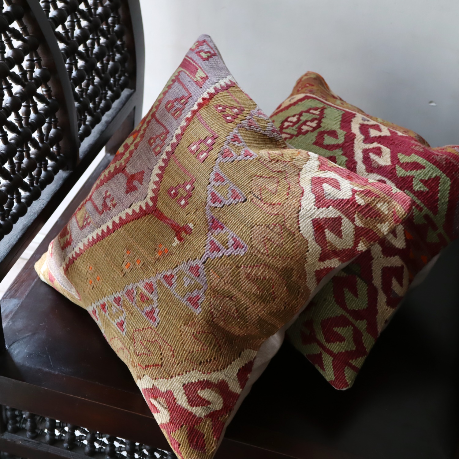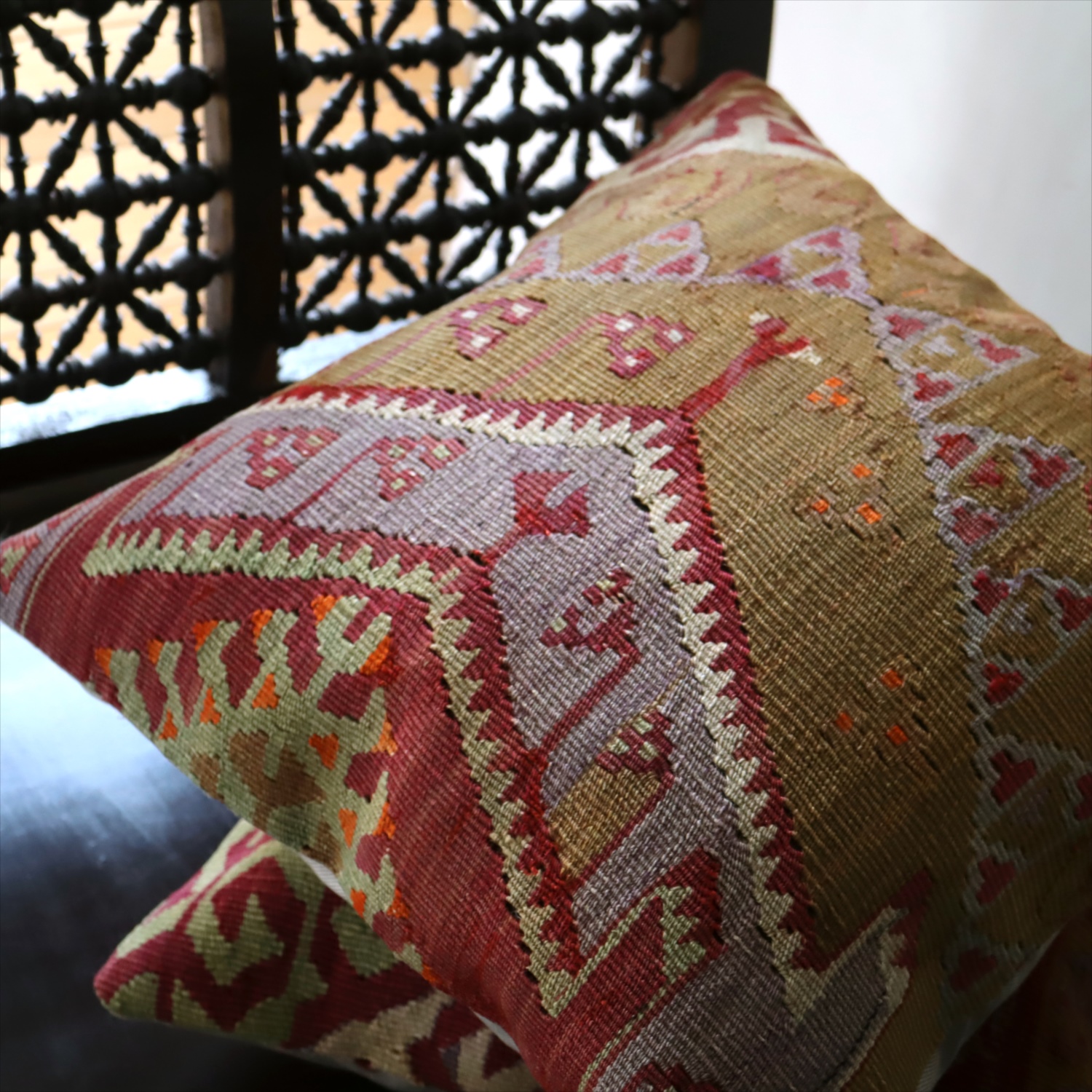 クッションカバーにすると、一枚のキリムから50枚以上に切り分けられるものもあり、配色が似ていてモチーフのバランスが違うクッションができあがります。