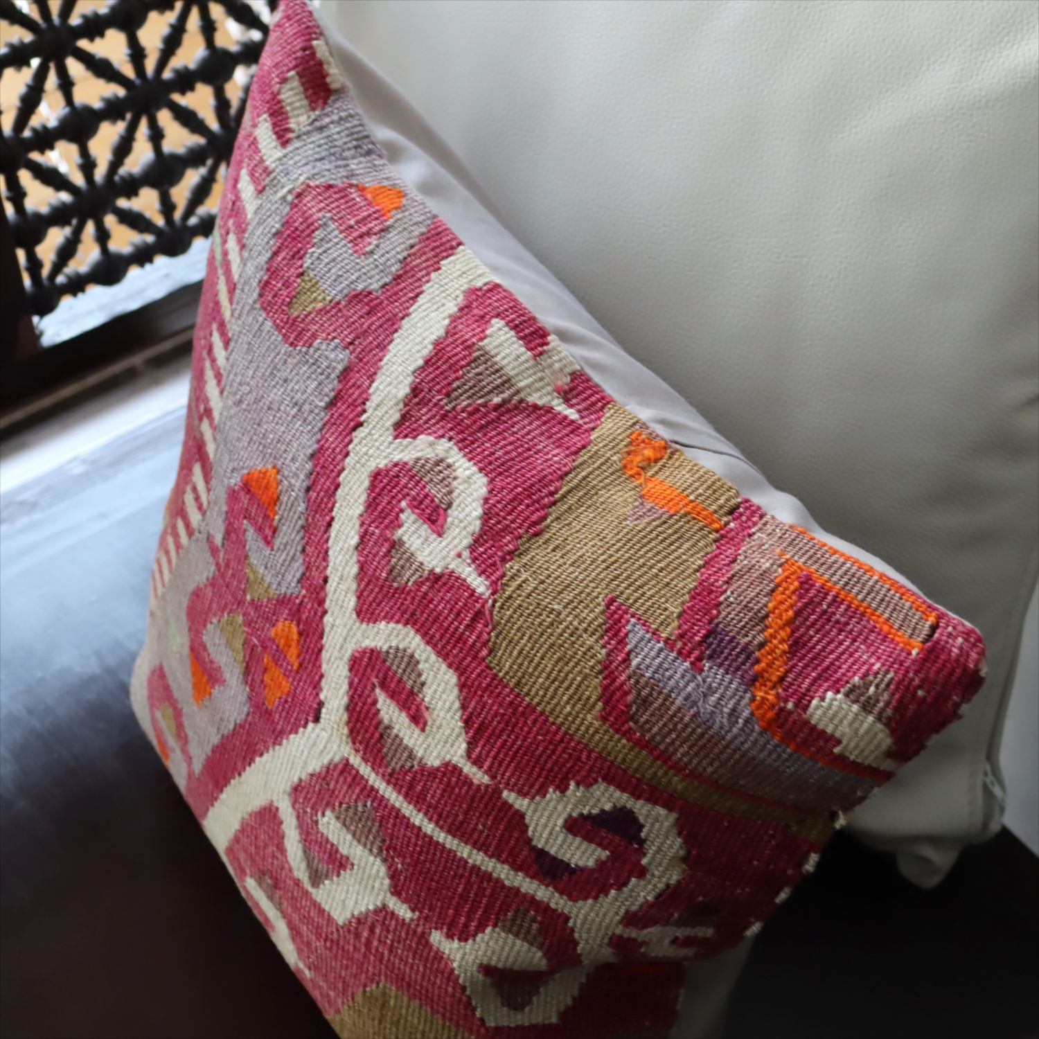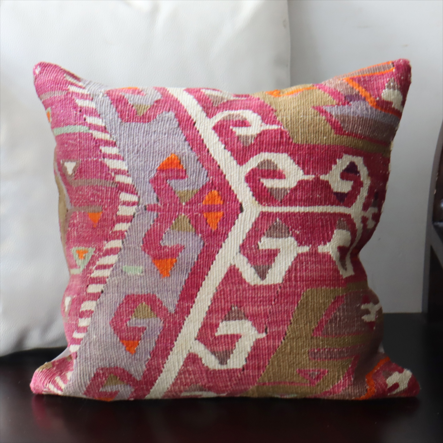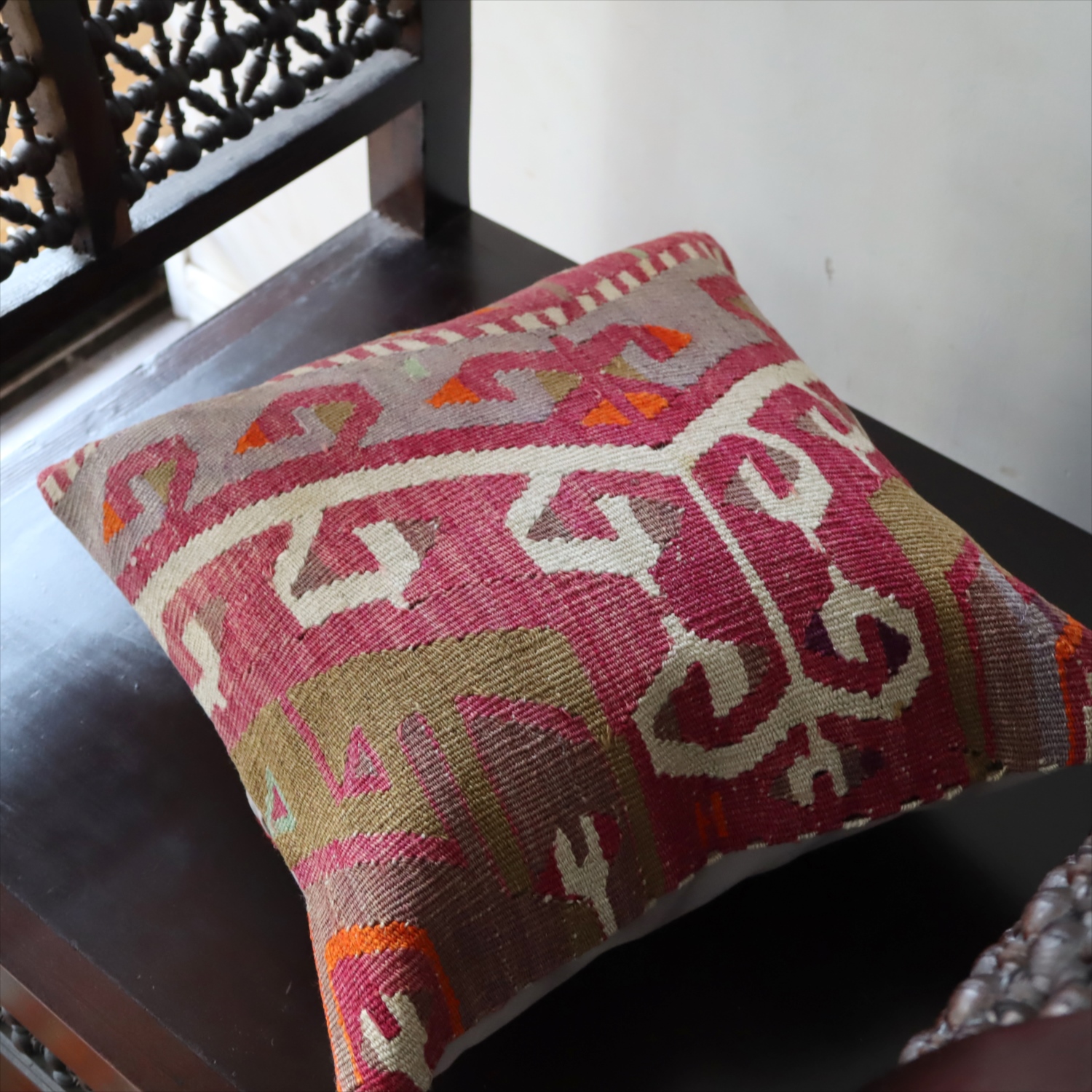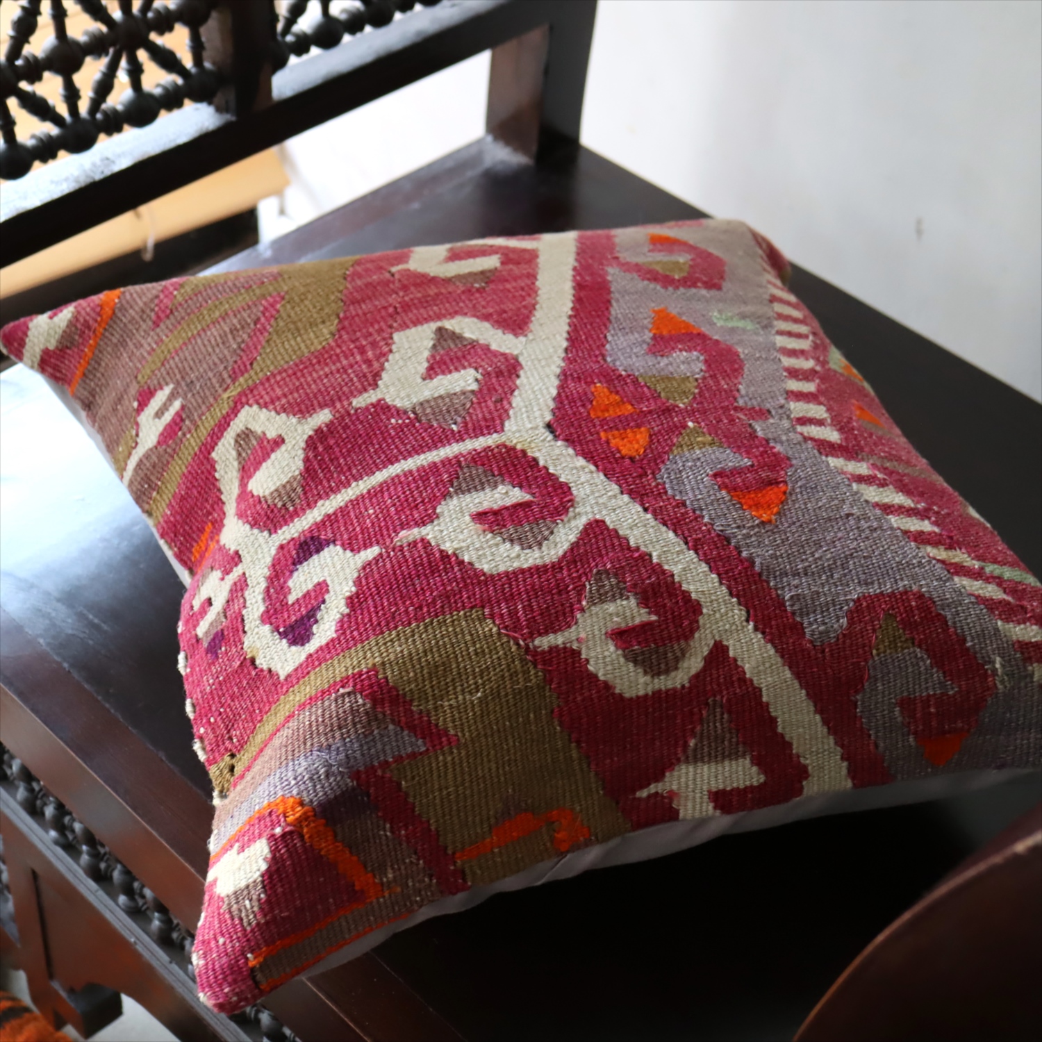 細い糸を使って織られた大型の平織りキリムをカットして作ったクッションカバーです。表面はウールのヴィンテージキリム、裏面は無地のコットン地です。
