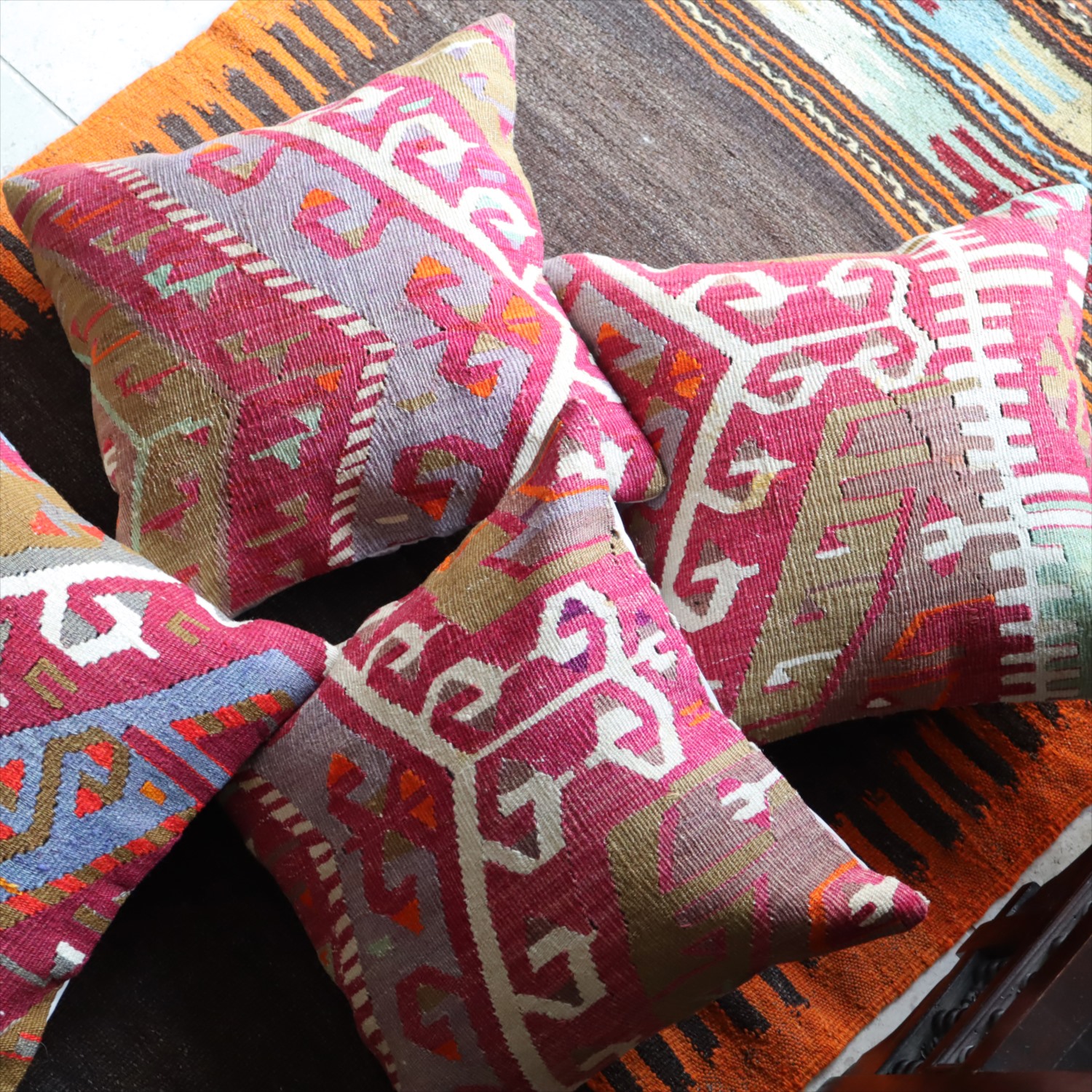 クッションカバーにすると、一枚のキリムから50枚以上に切り分けられるものもあり、配色が似ていてモチーフのバランスが違うクッションができあがります。