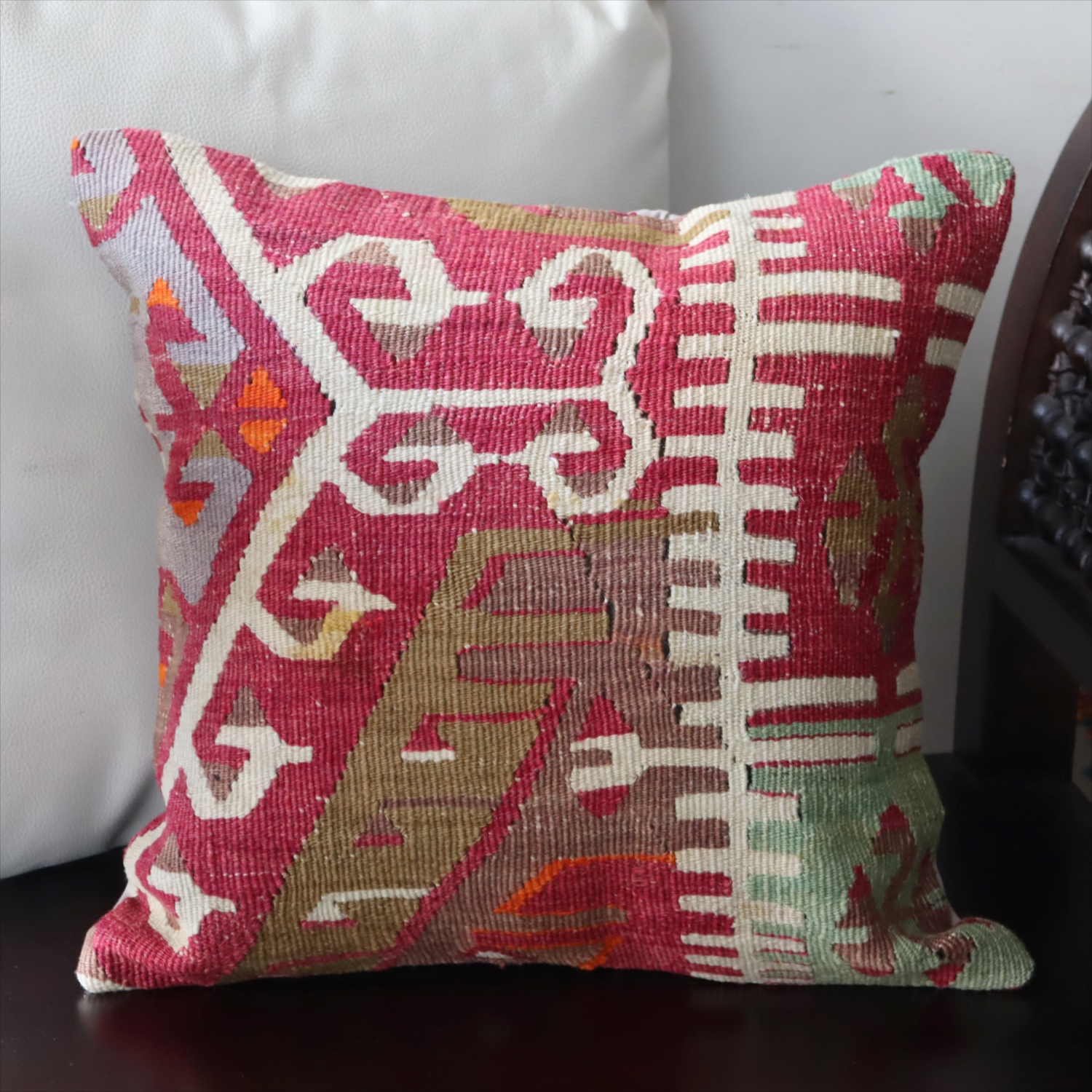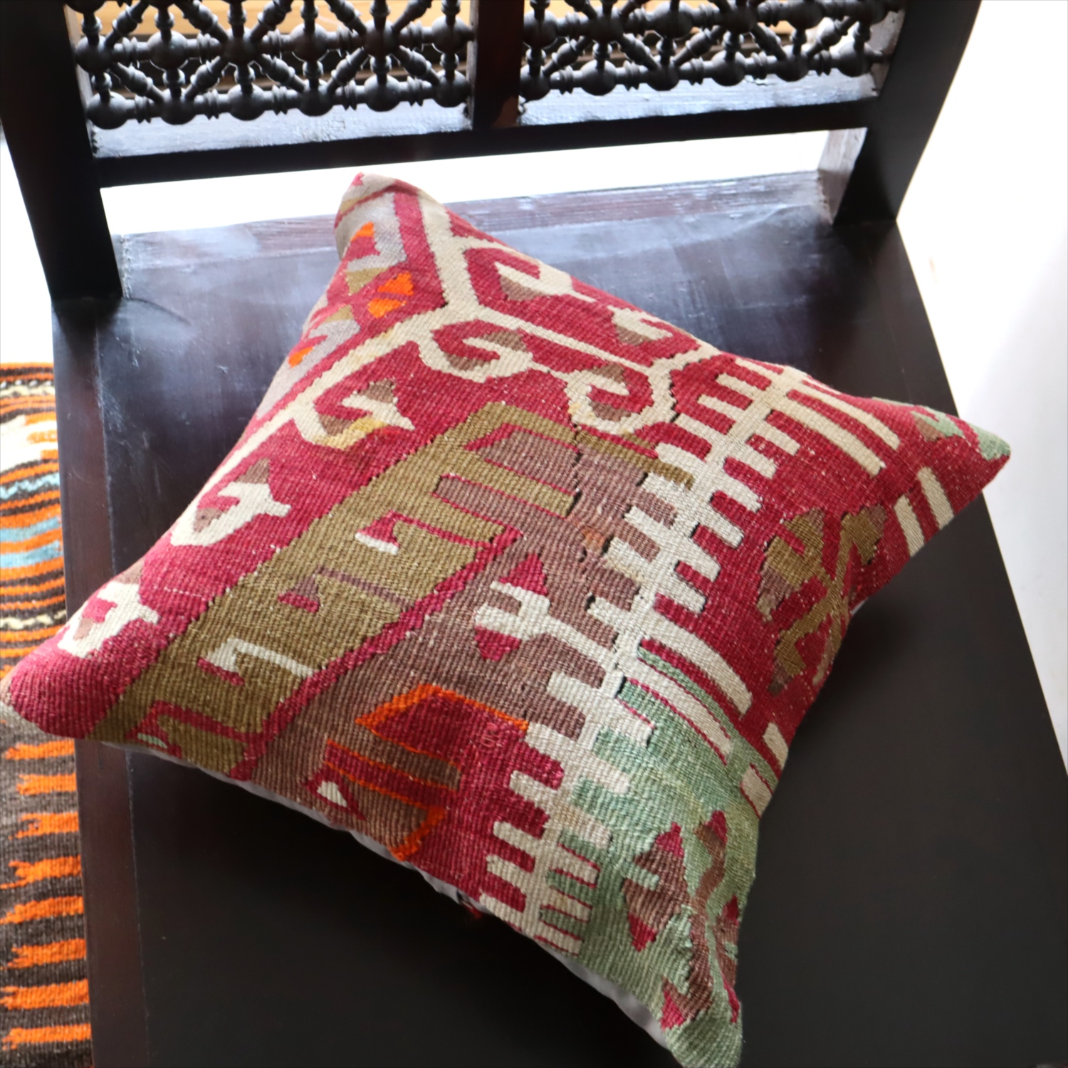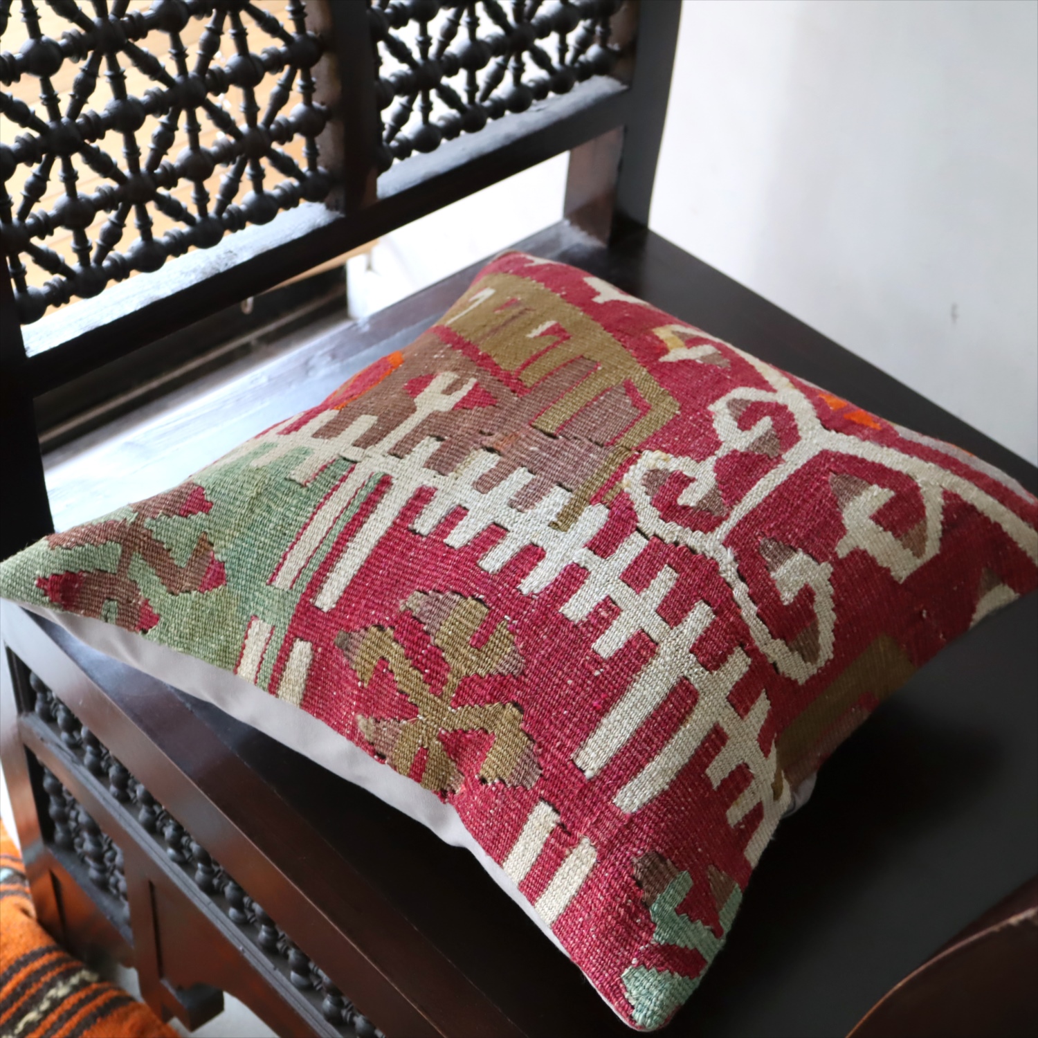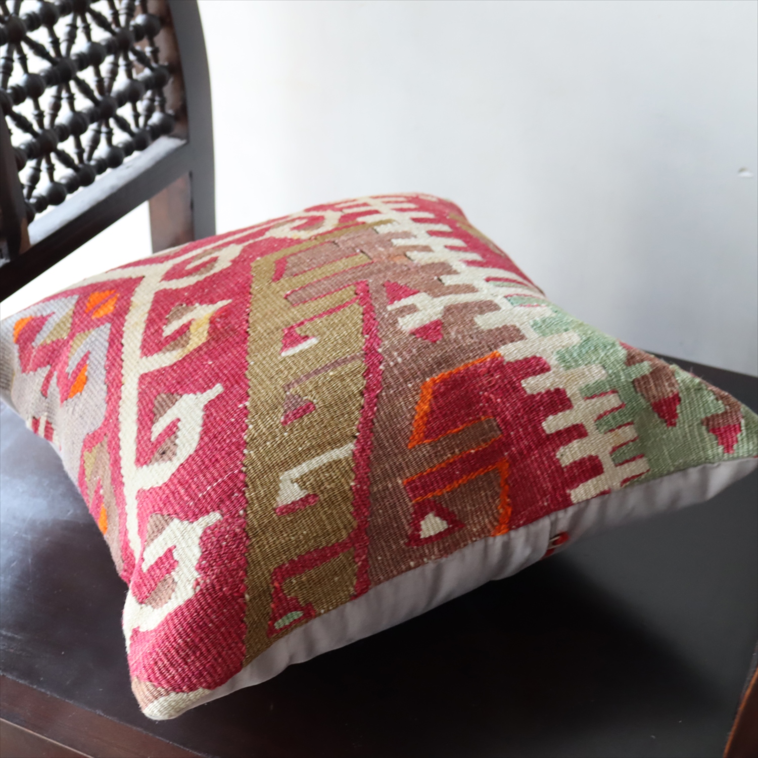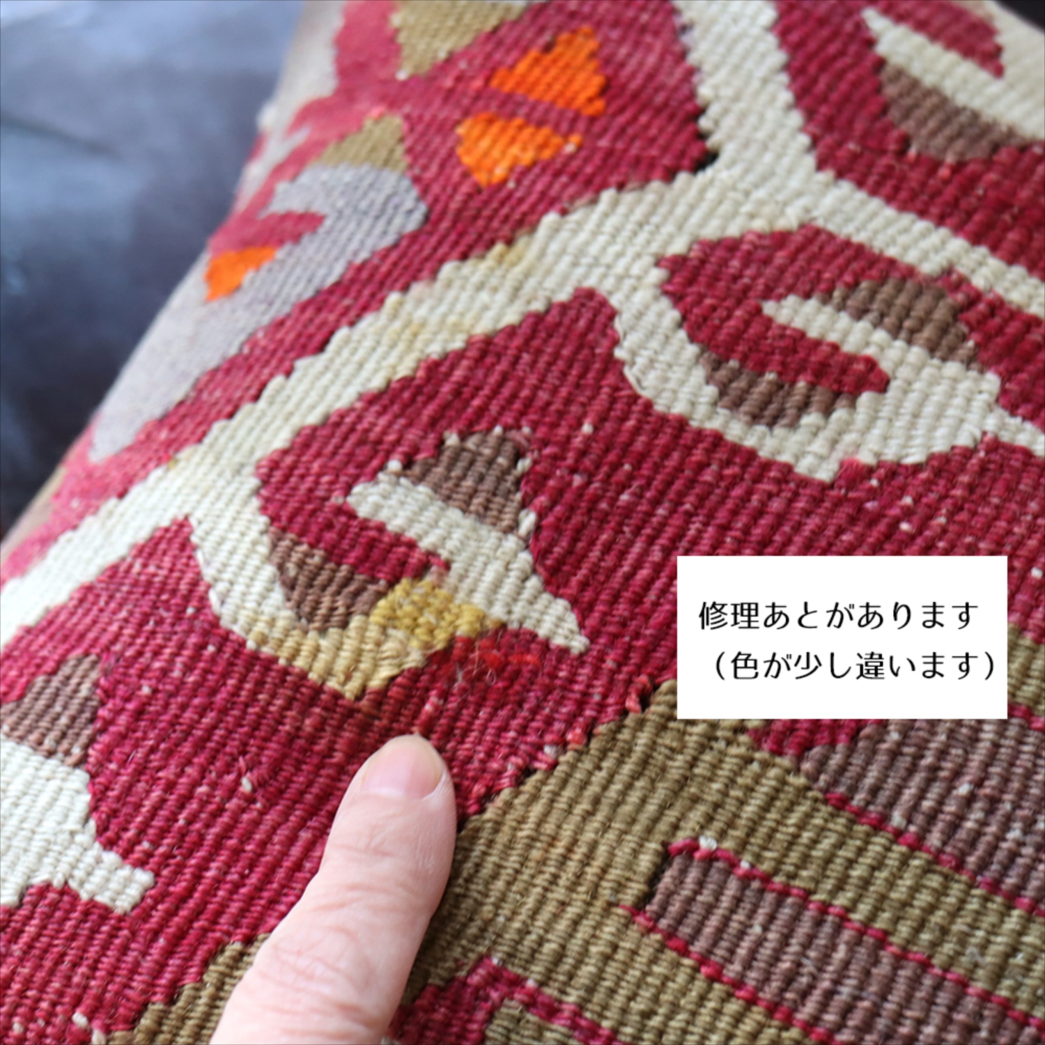 細い糸を使って織られた大型の平織りキリムをカットして作ったクッションカバーです。表面はウールのヴィンテージキリム、裏面は無地のコットン地です。