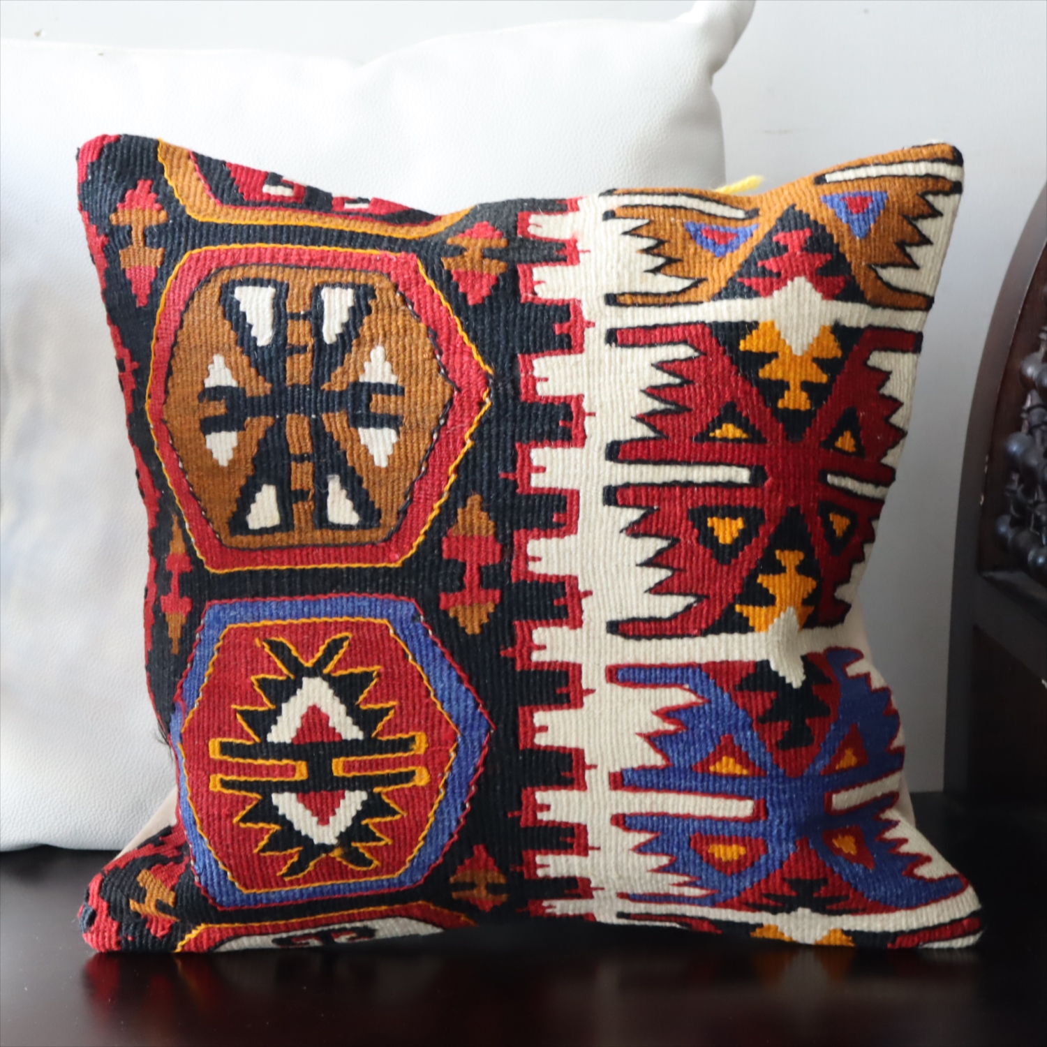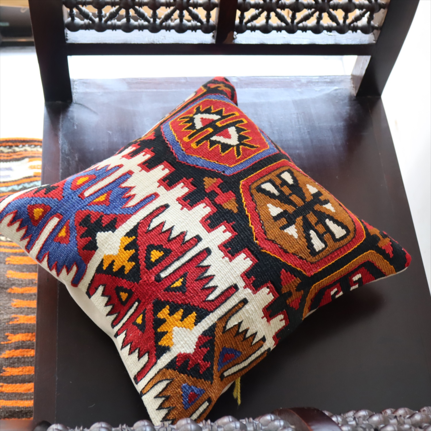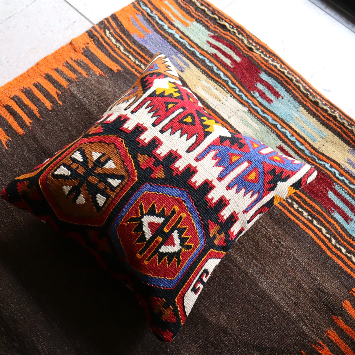 細い糸を使って織られた大型の平織りキリムをカットして作ったクッションカバーです。表面はウールのヴィンテージキリム、裏面は無地のコットン地です。