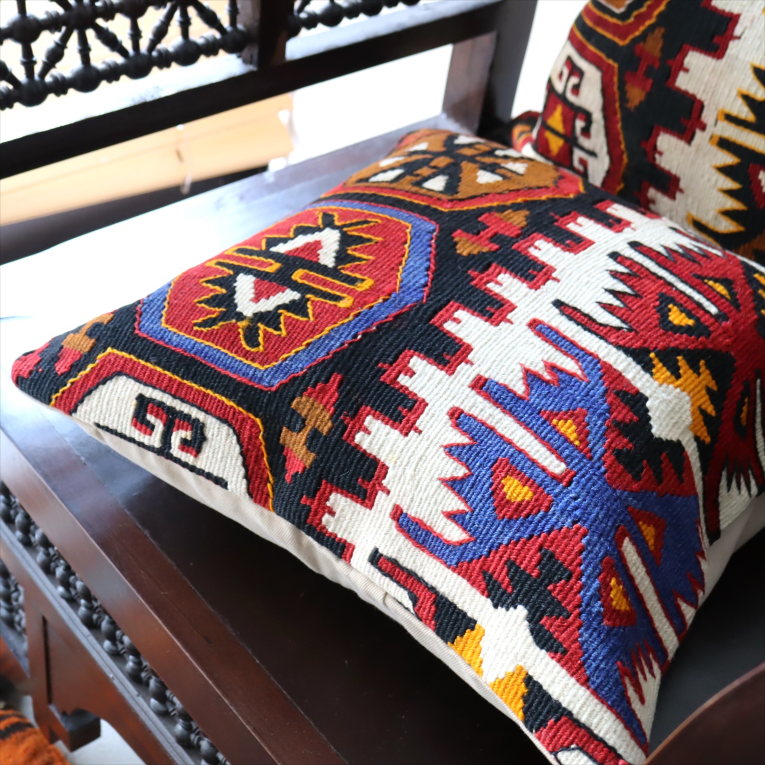 クッションカバーにすると、一枚のキリムから50枚以上に切り分けられるものもあり、配色が似ていてモチーフのバランスが違うクッションができあがります。