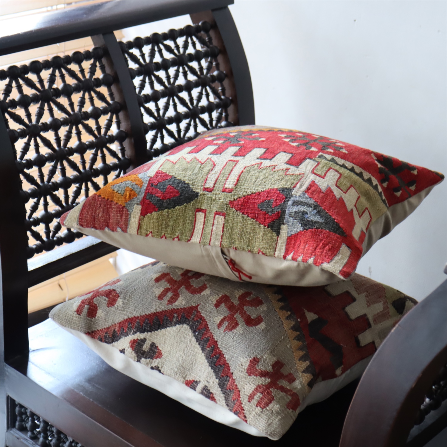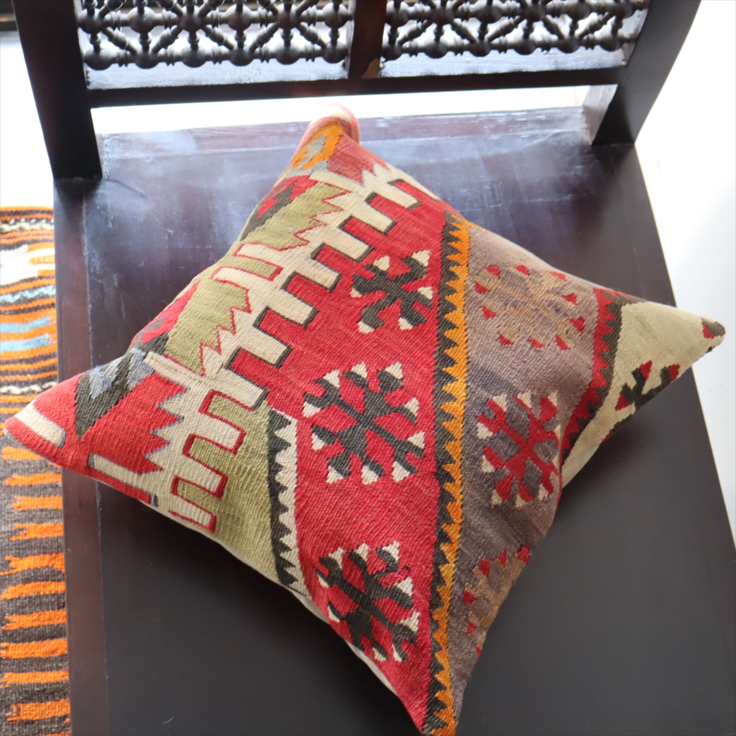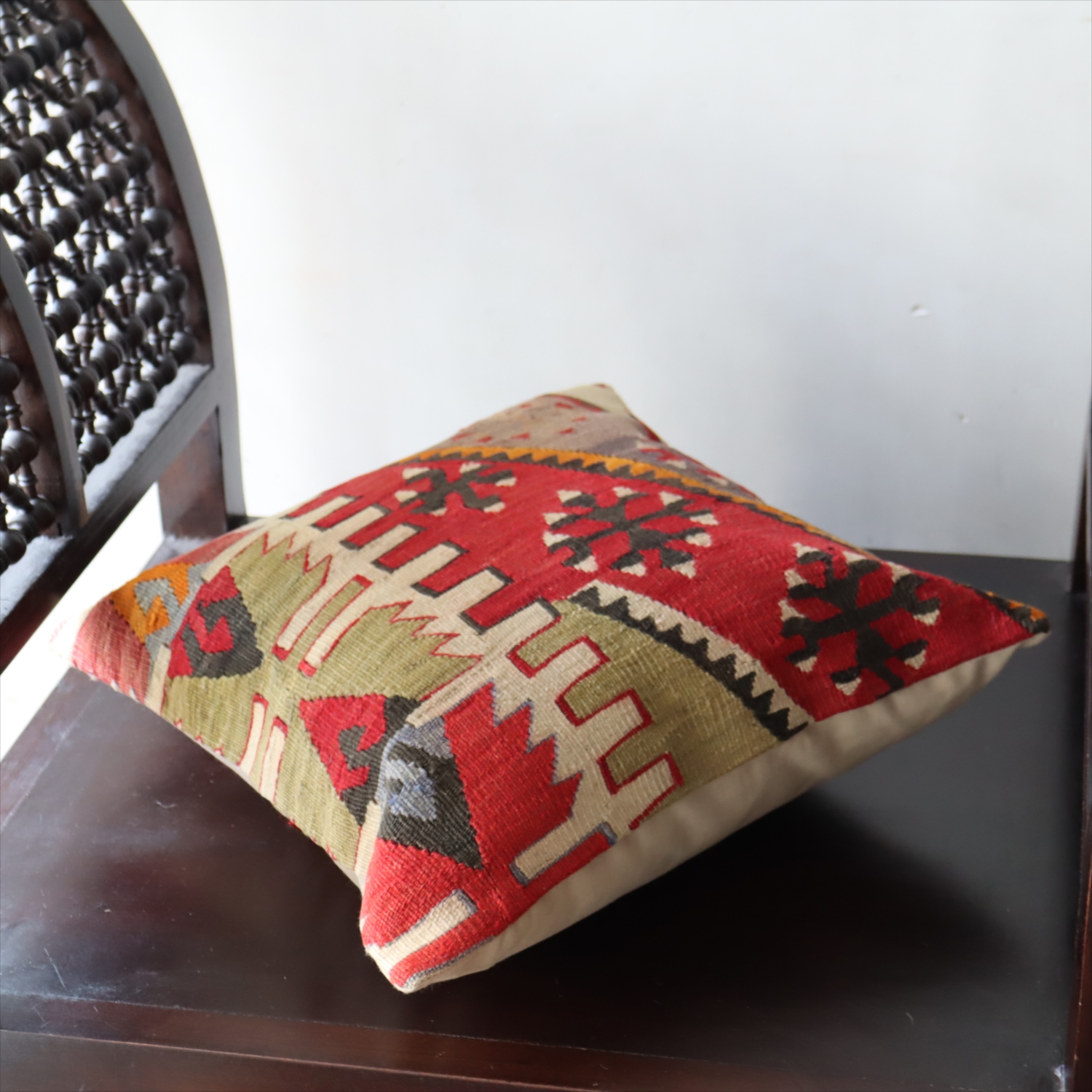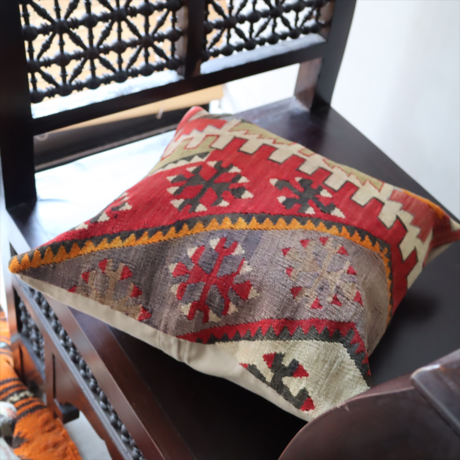 細い糸を使って織られた大型の平織りキリムをカットして作ったクッションカバーです。表面はウールのヴィンテージキリム、裏面は無地のコットン地です。