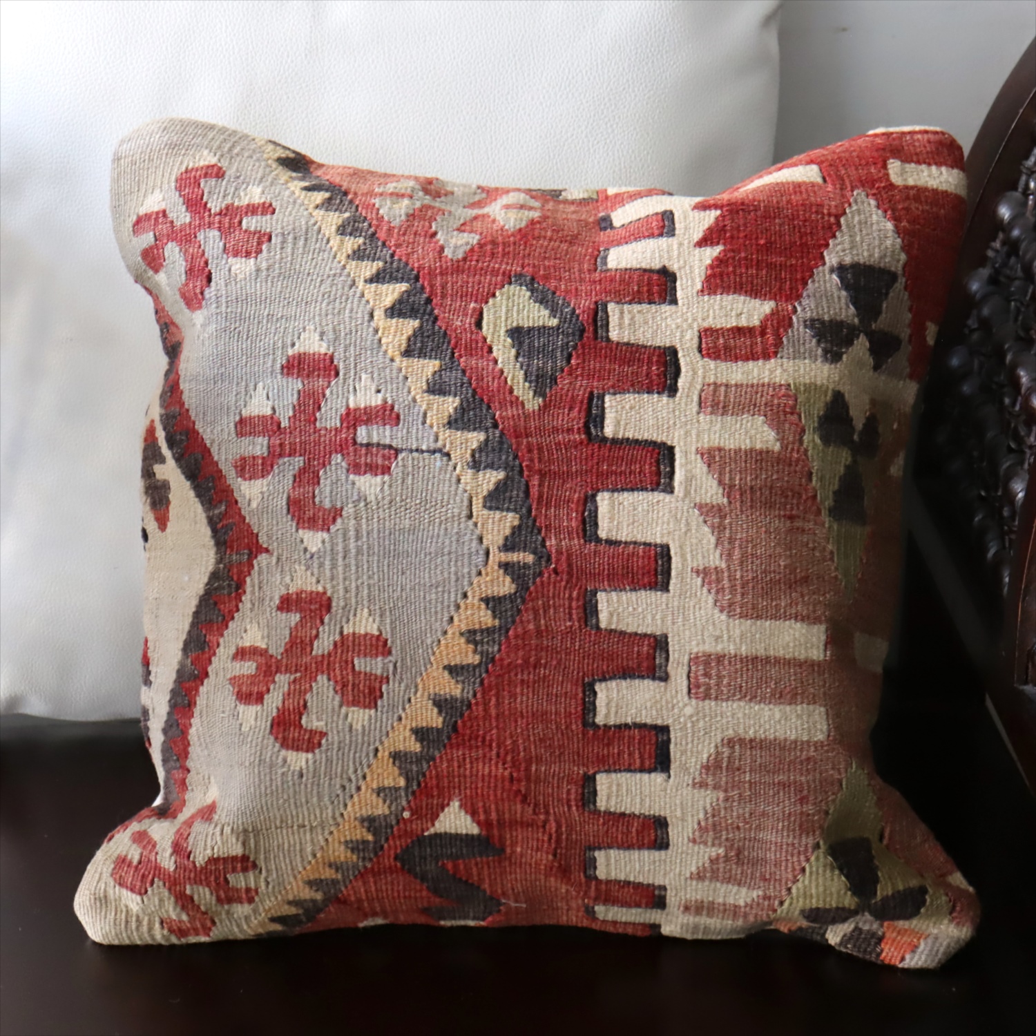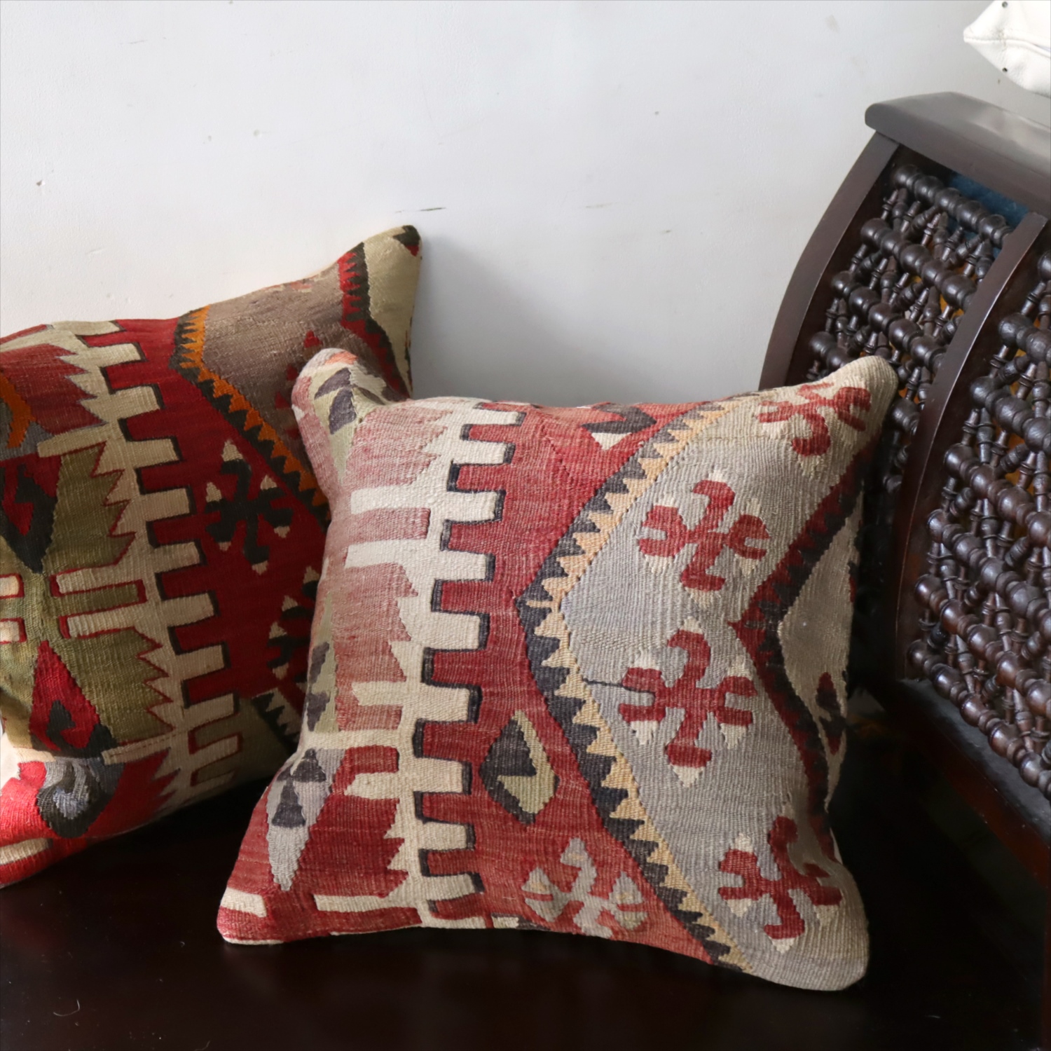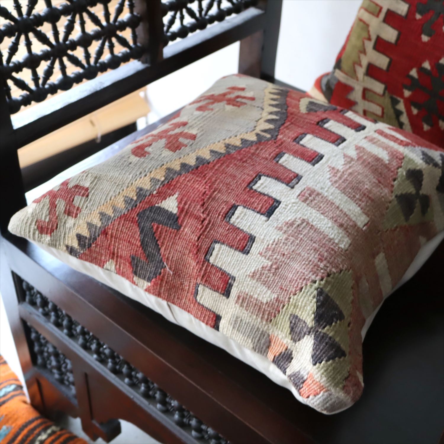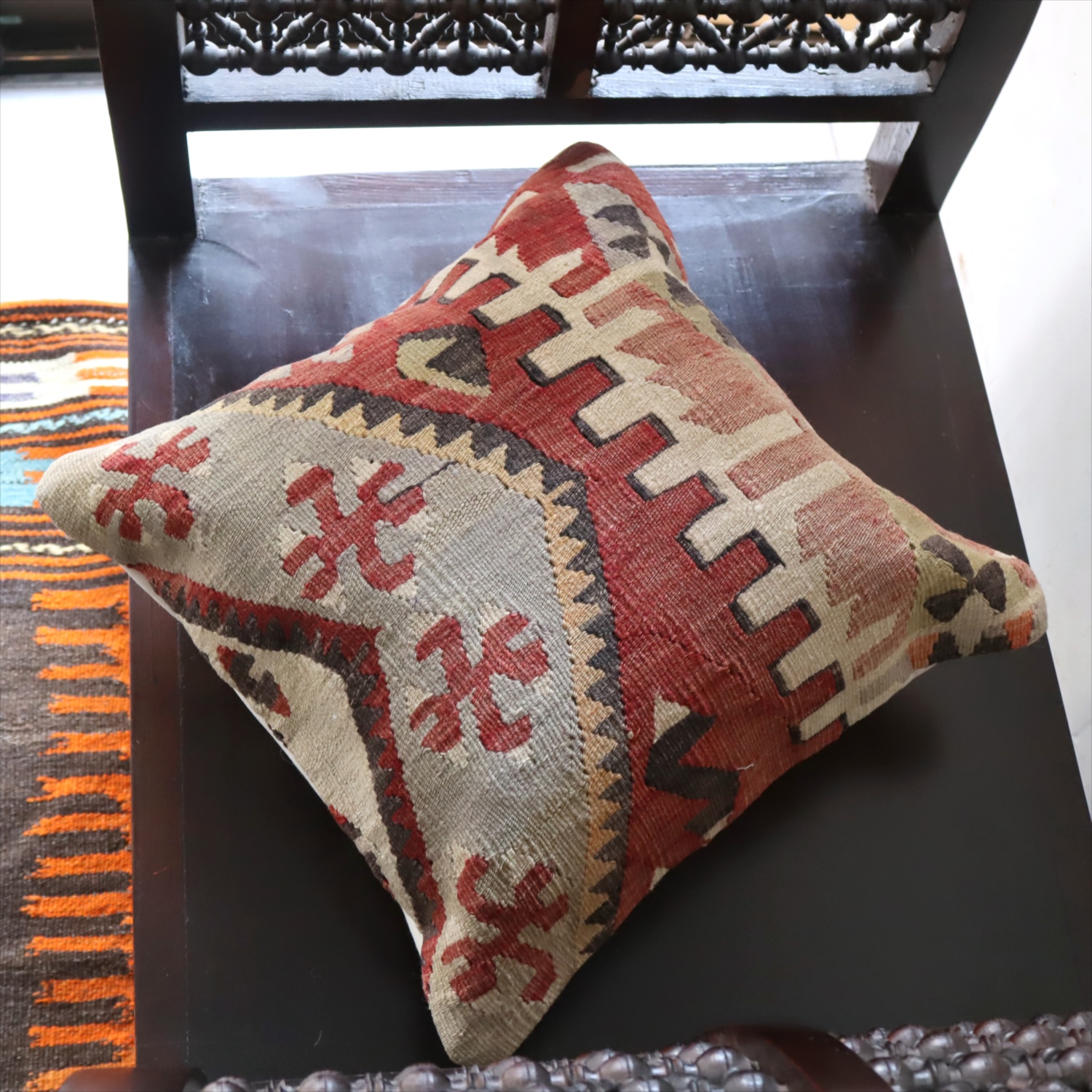 細い糸を使って織られた大型の平織りキリムをカットして作ったクッションカバーです。表面はウールのヴィンテージキリム、裏面は無地のコットン地です。