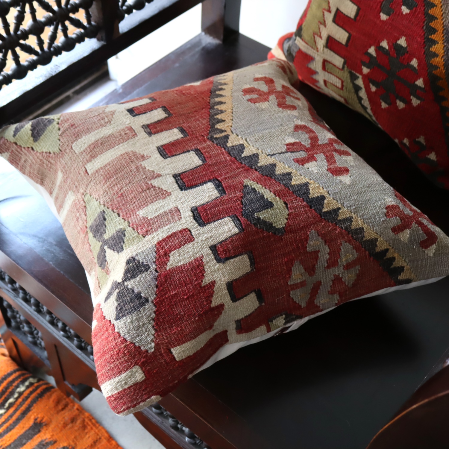 クッションカバーにすると、一枚のキリムから50枚以上に切り分けられるものもあり、配色が似ていてモチーフのバランスが違うクッションができあがります。