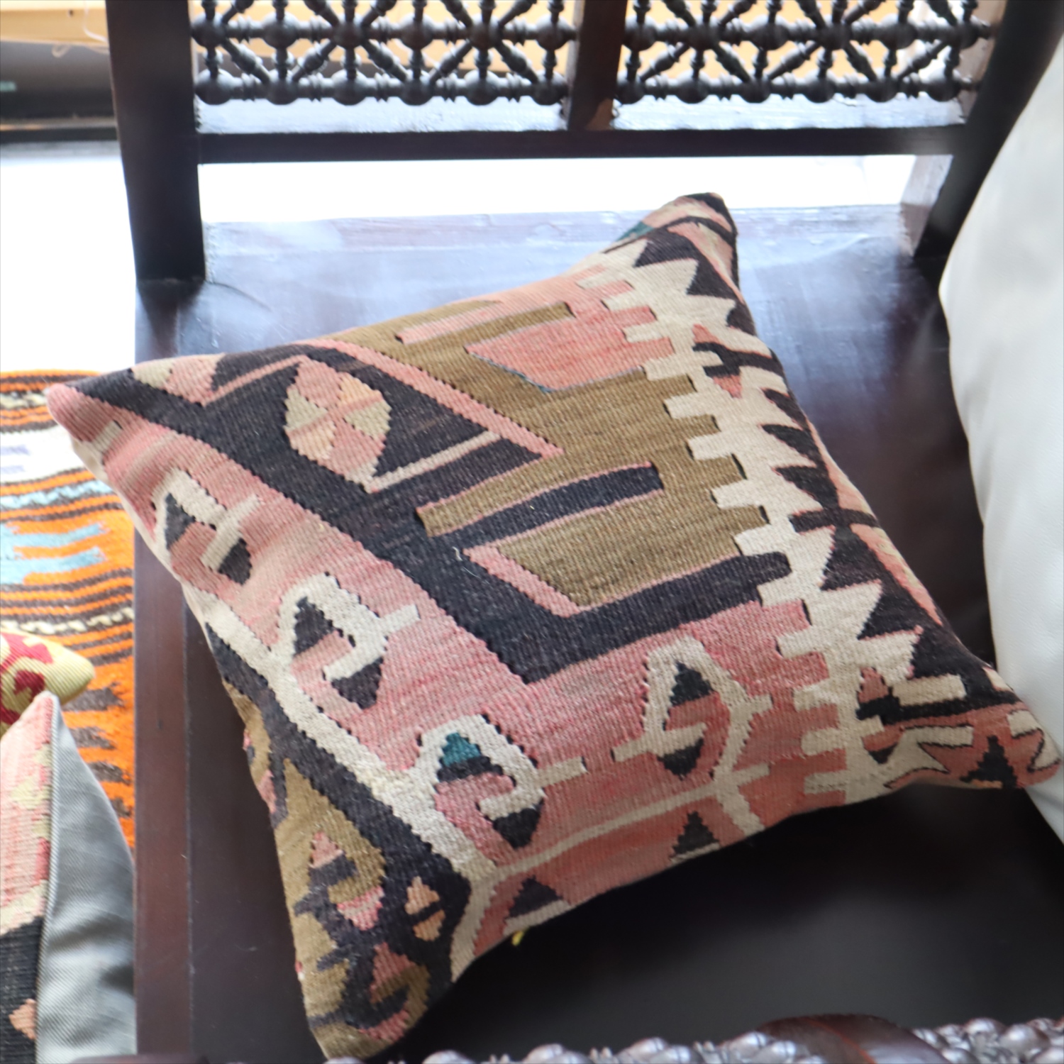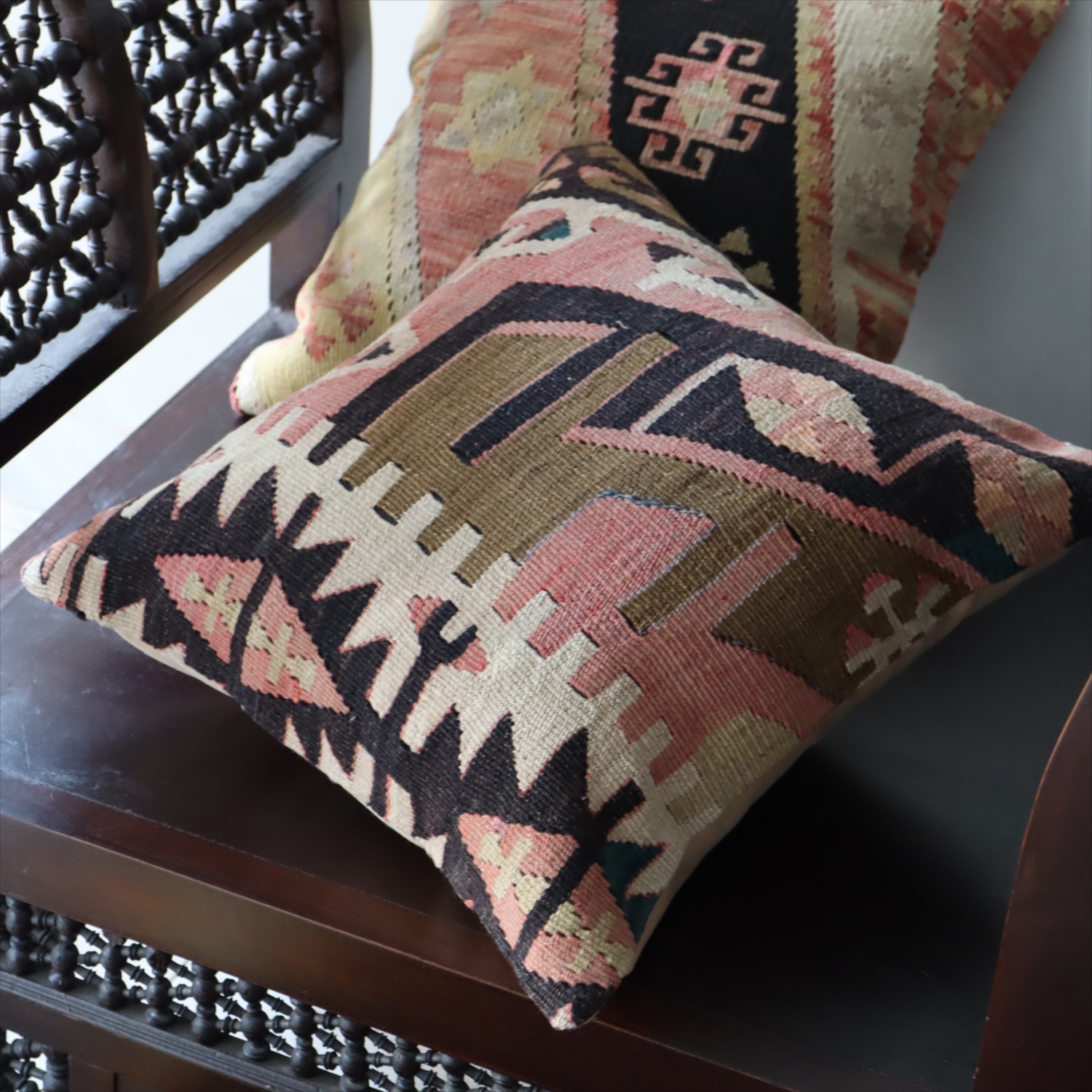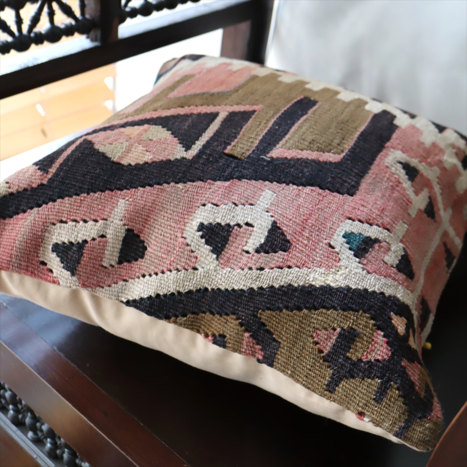 細い糸を使って織られた大型の平織りキリムをカットして作ったクッションカバーです。表面はウールのヴィンテージキリム、裏面は無地のコットン地です。