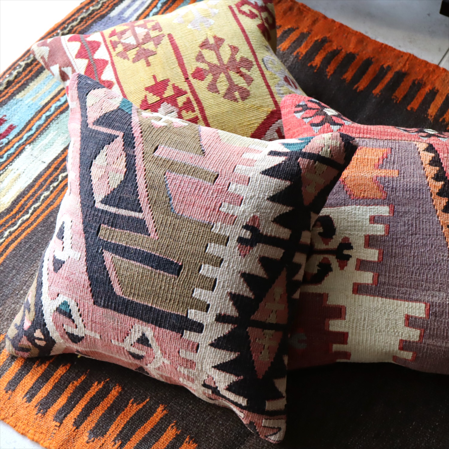 クッションカバーにすると、一枚のキリムから50枚以上に切り分けられるものもあり、配色が似ていてモチーフのバランスが違うクッションができあがります。