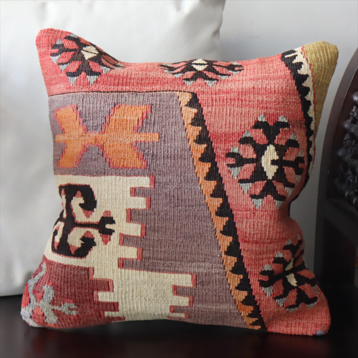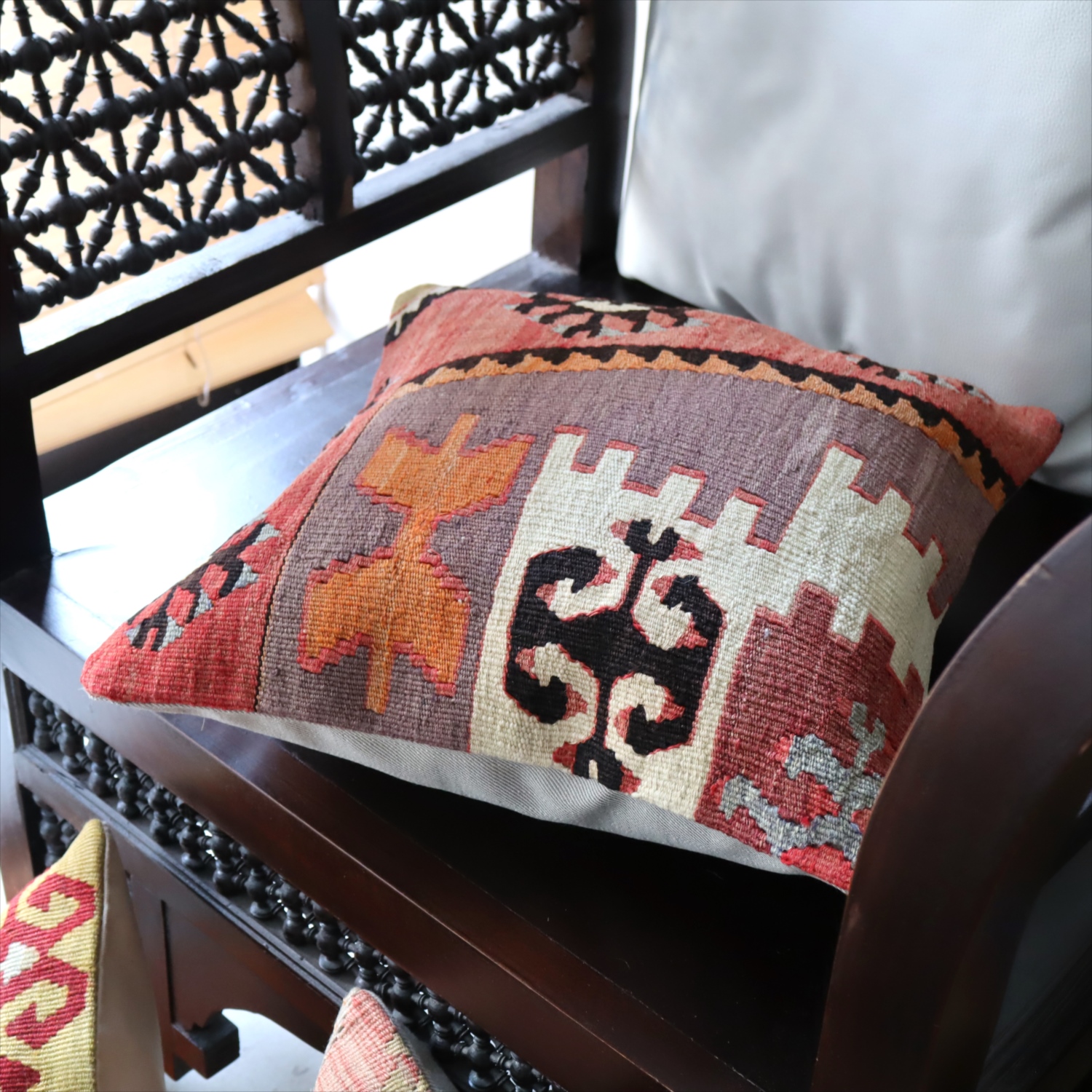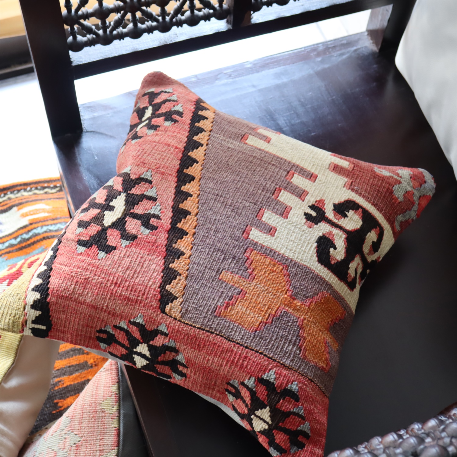 細い糸を使って織られた大型の平織りキリムをカットして作ったクッションカバーです。表面はウールのヴィンテージキリム、裏面は無地のコットン地です。