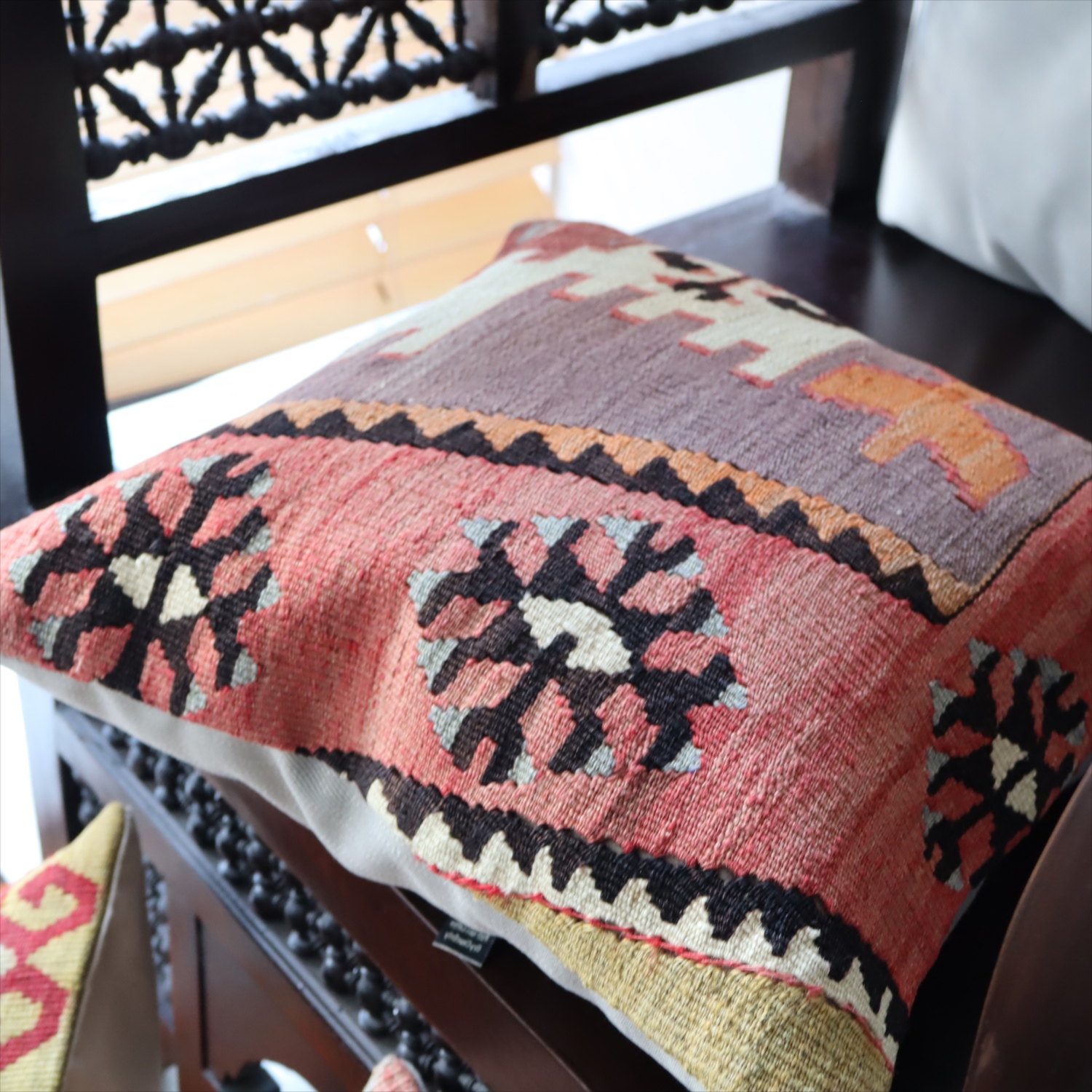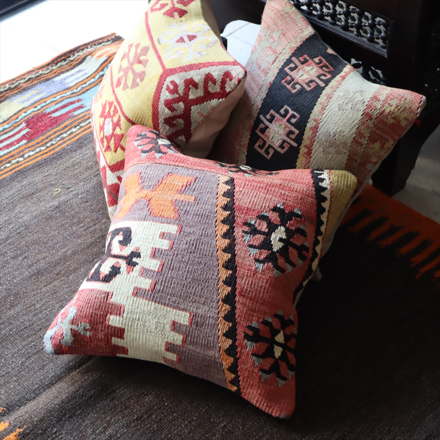 クッションカバーにすると、一枚のキリムから50枚以上に切り分けられるものもあり、配色が似ていてモチーフのバランスが違うクッションができあがります。