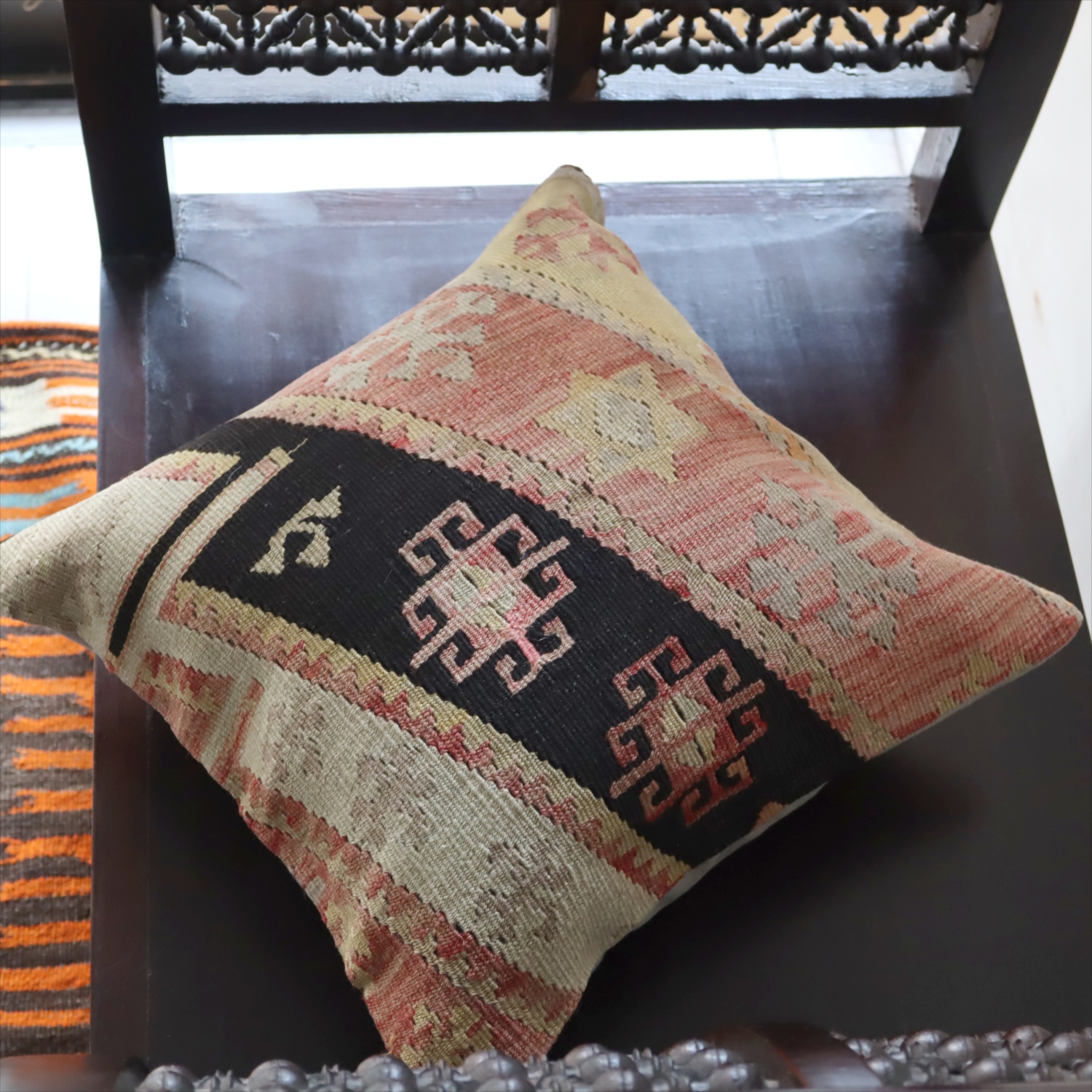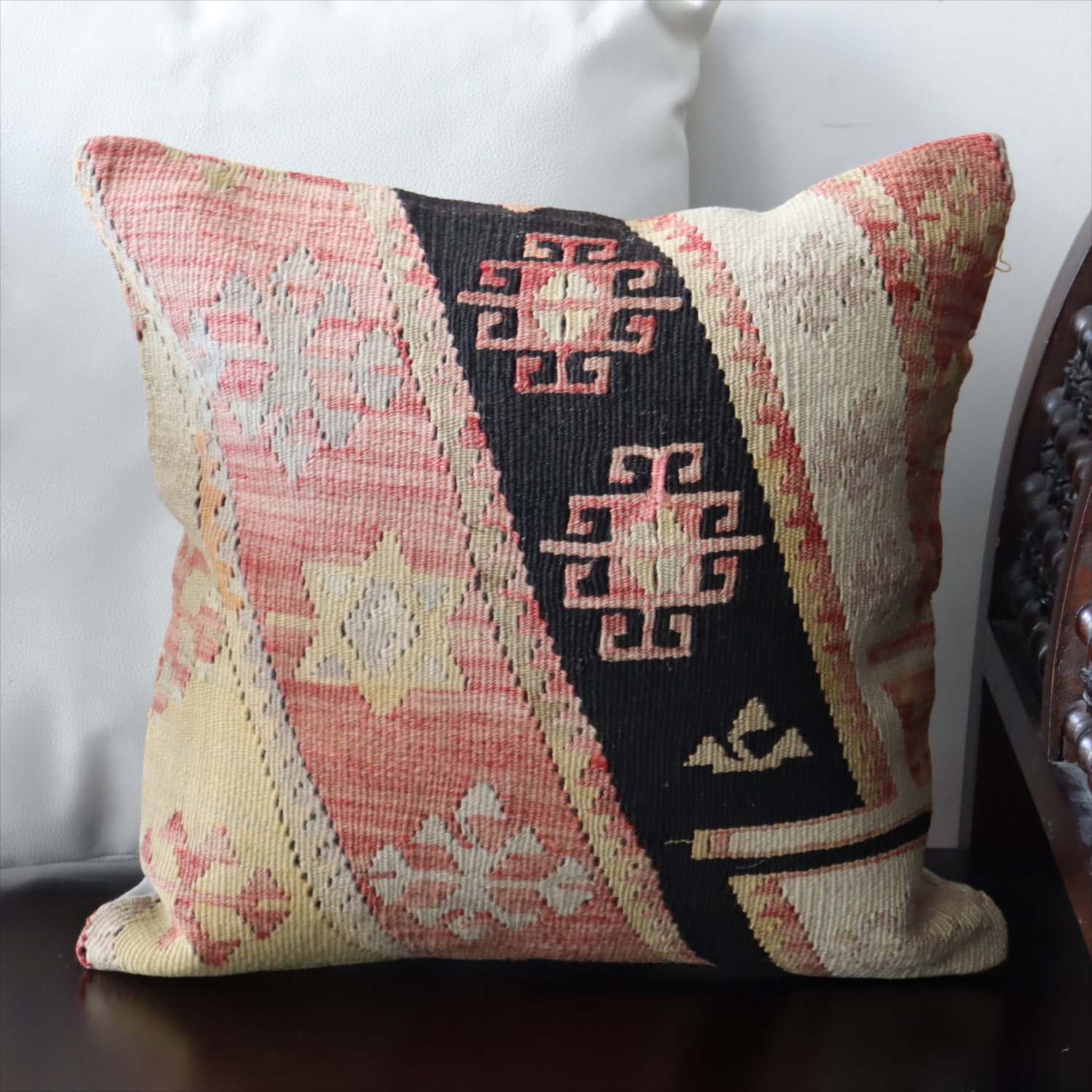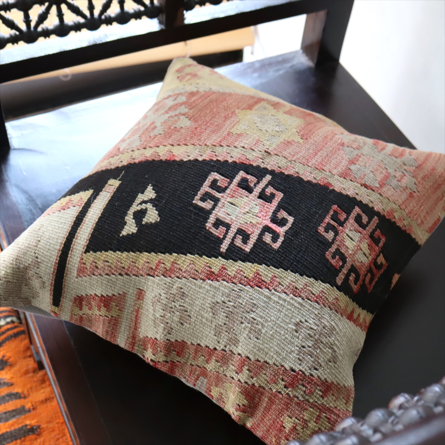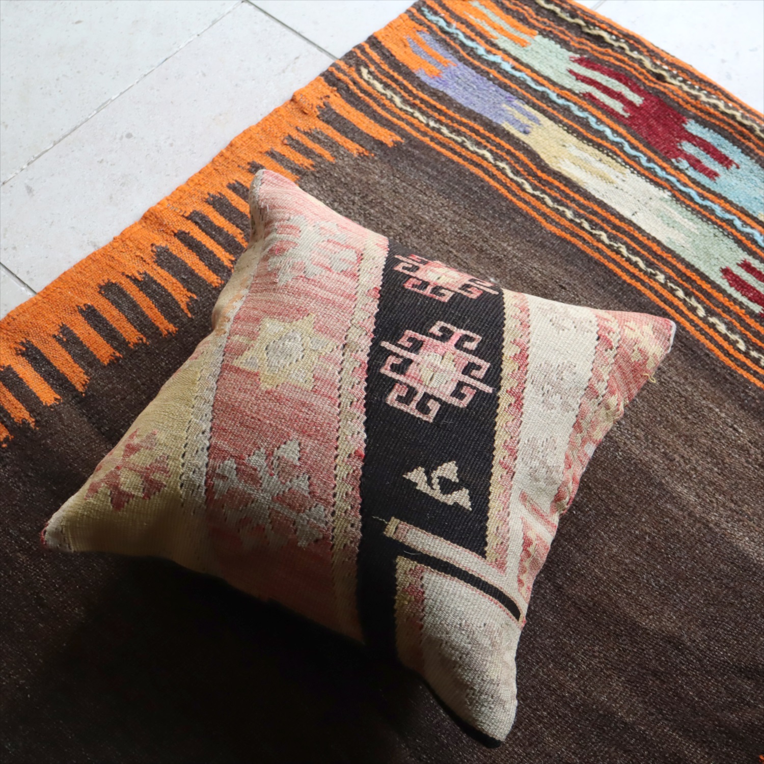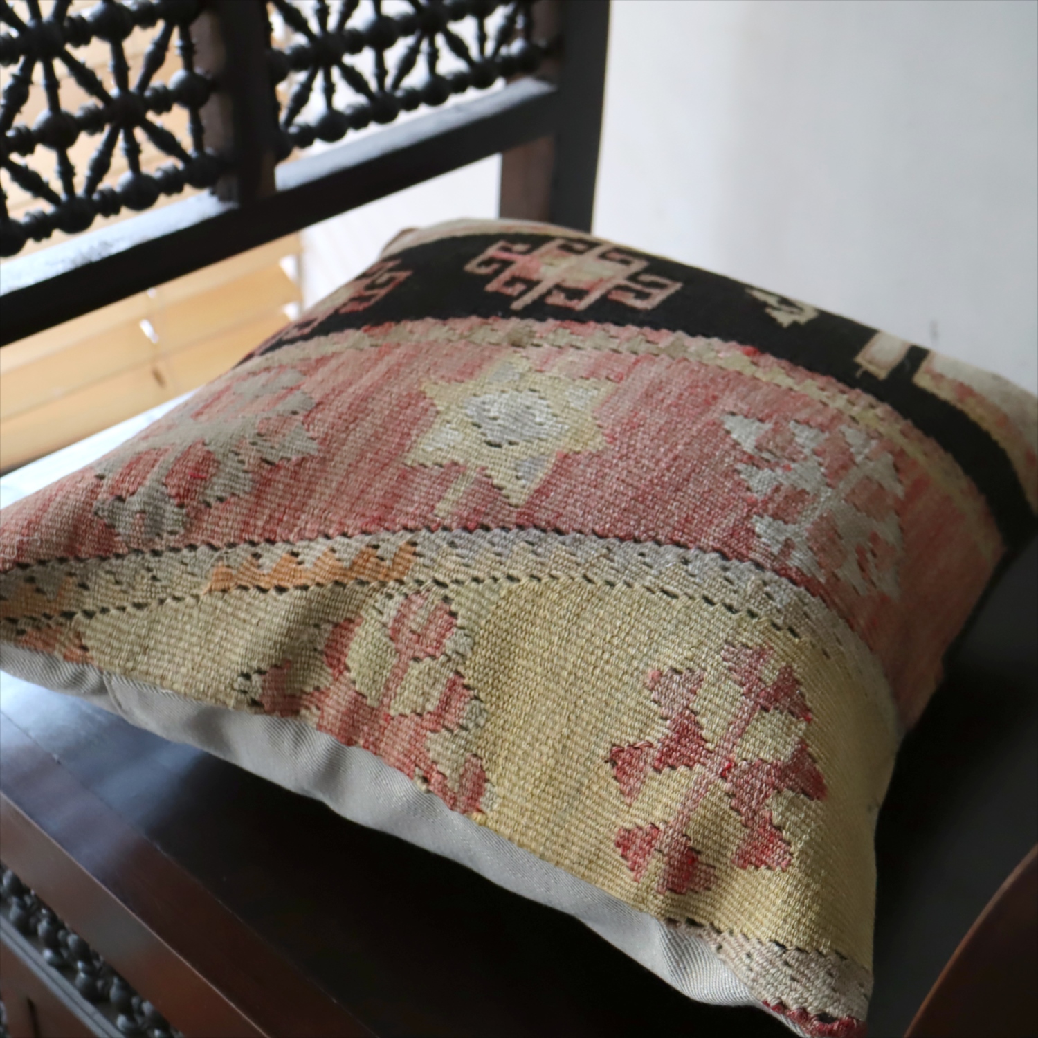 細い糸を使って織られた大型の平織りキリムをカットして作ったクッションカバーです。表面はウールのヴィンテージキリム、裏面は無地のコットン地です。