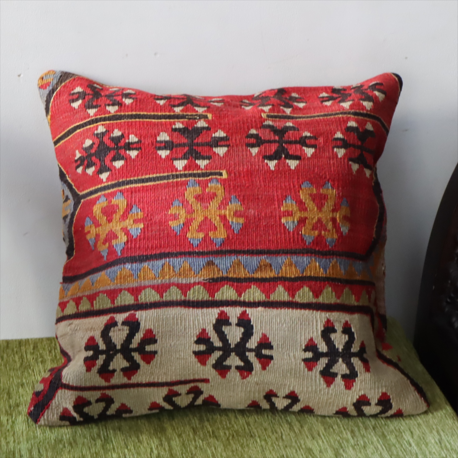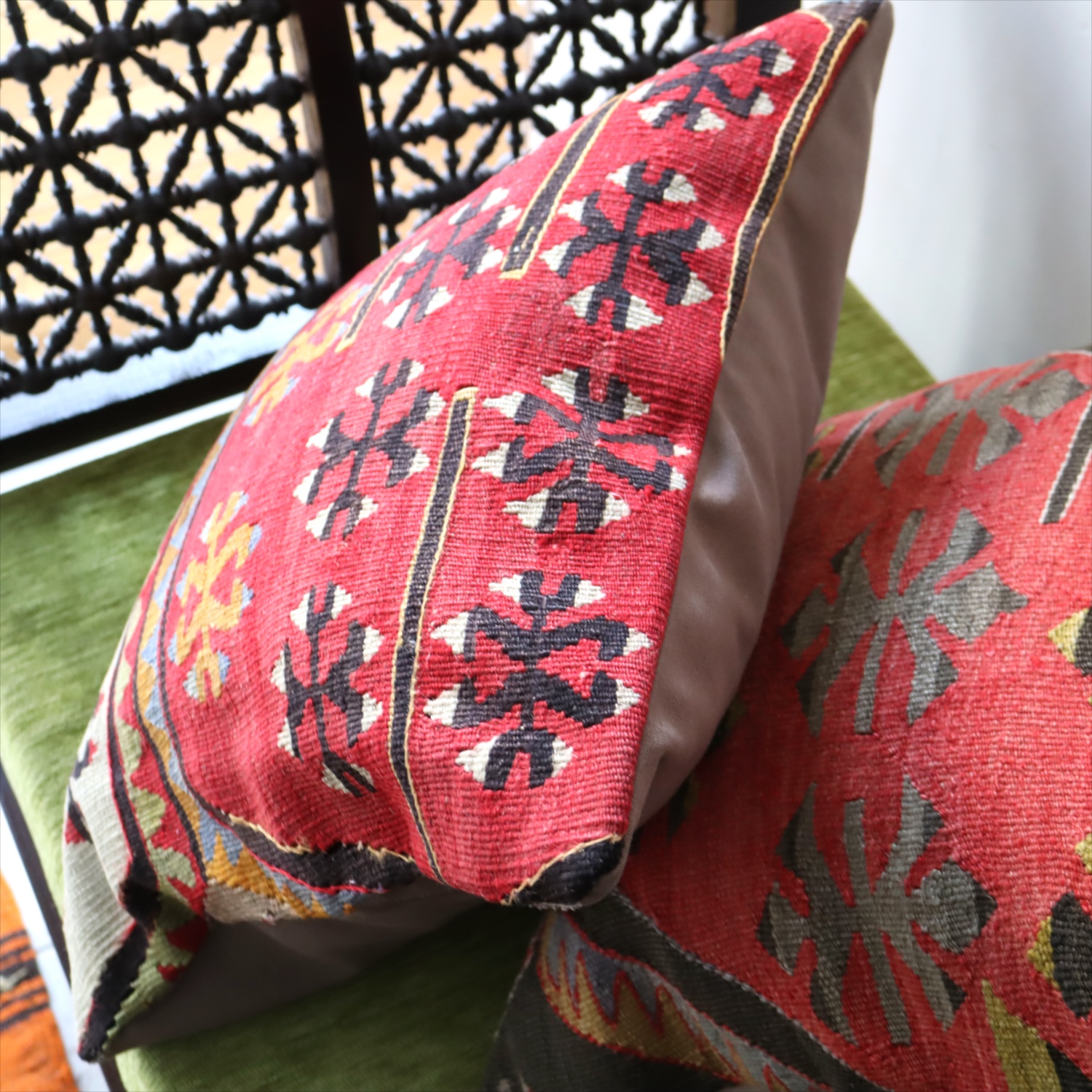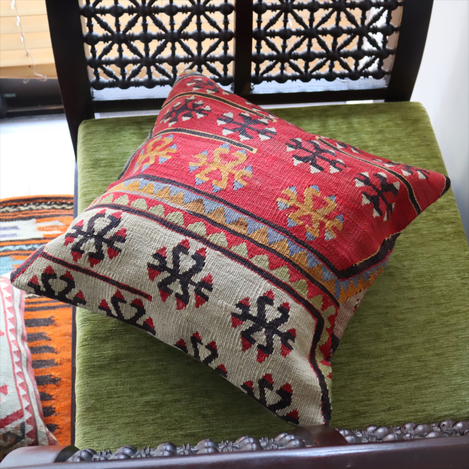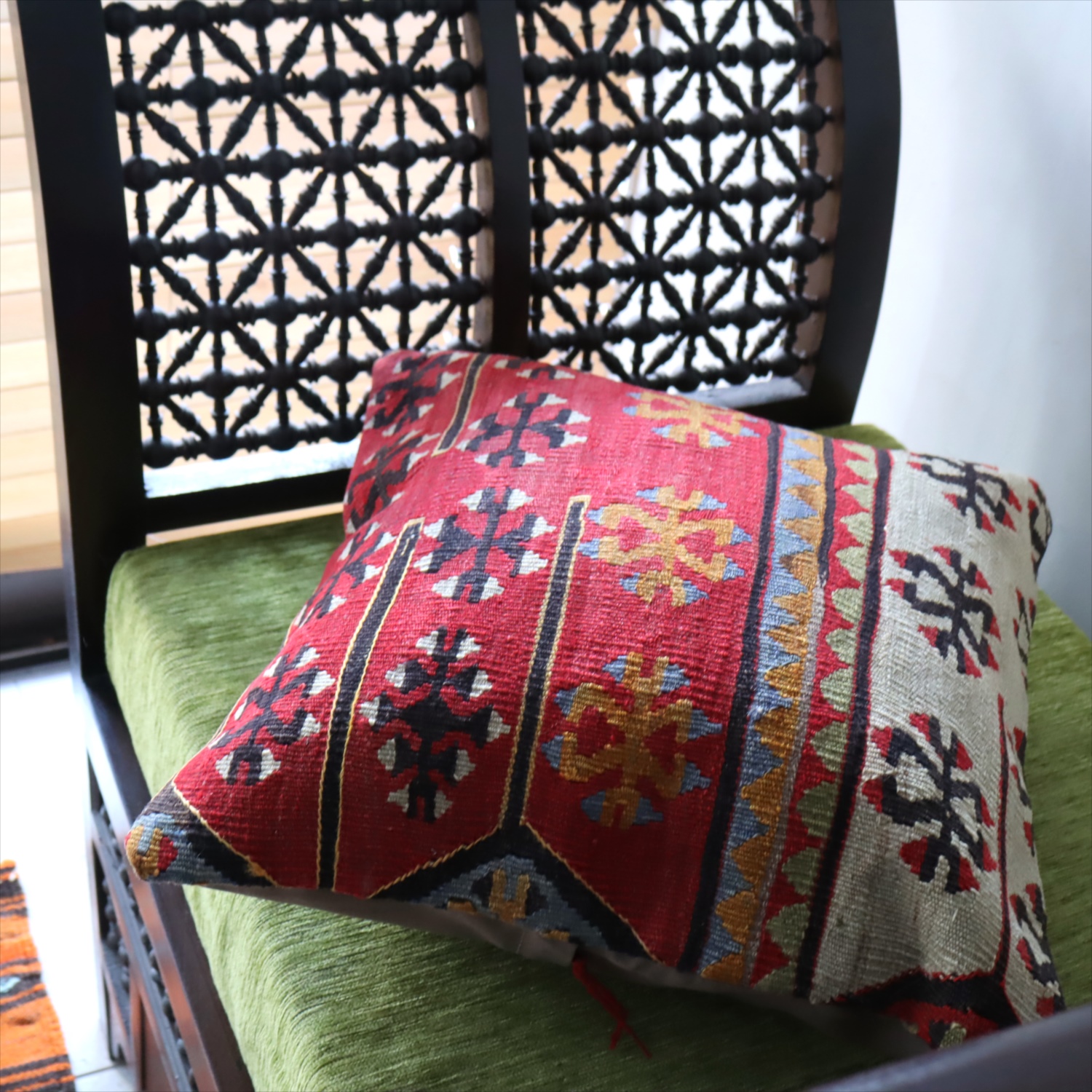 細い糸を使って織られた大型の平織りキリムをカットして作ったクッションカバーです。表面はウールのヴィンテージキリム、裏面は無地のコットン地です。