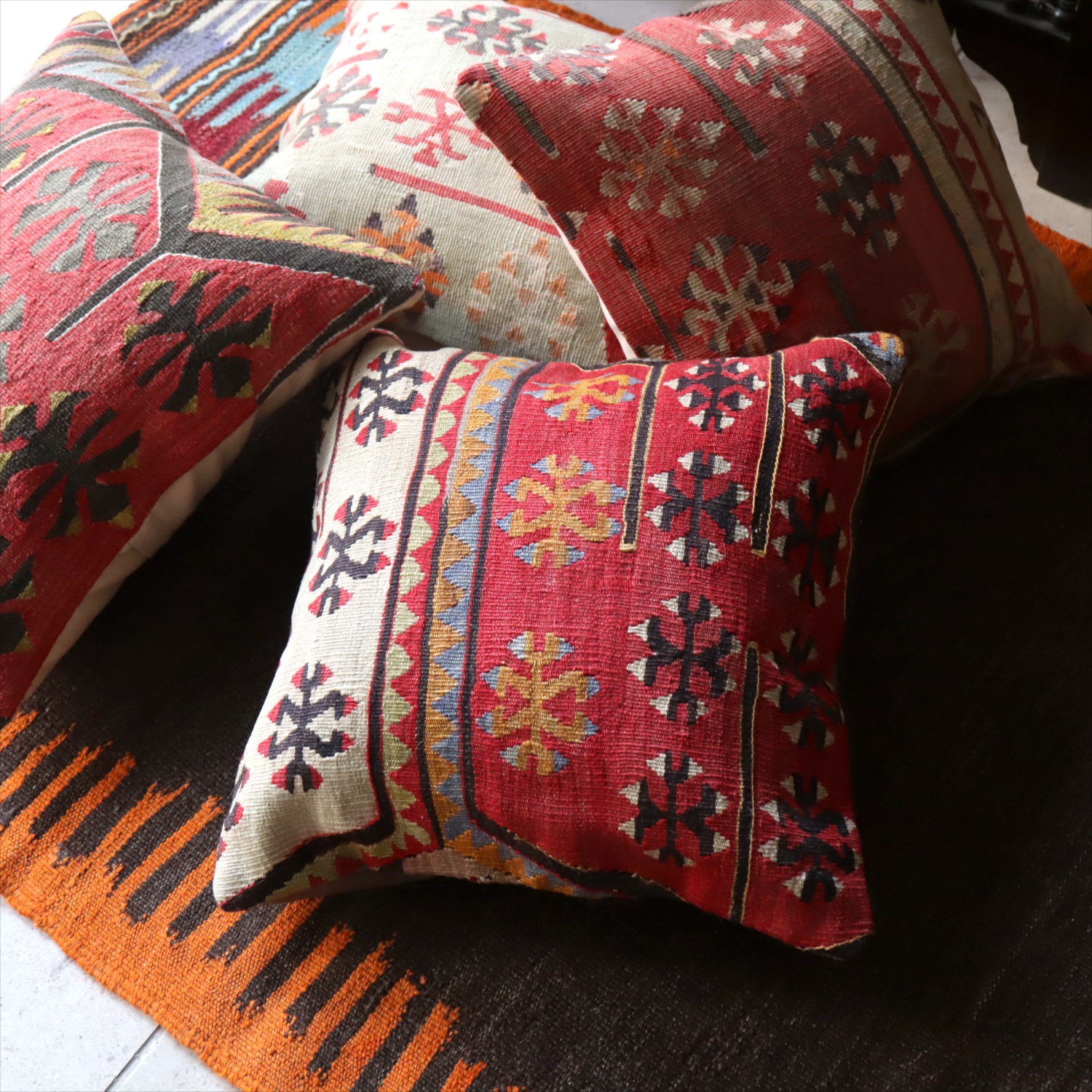 クッションカバーにすると、一枚のキリムから50枚以上に切り分けられるものもあり、配色が似ていてモチーフのバランスが違うクッションができあがります。