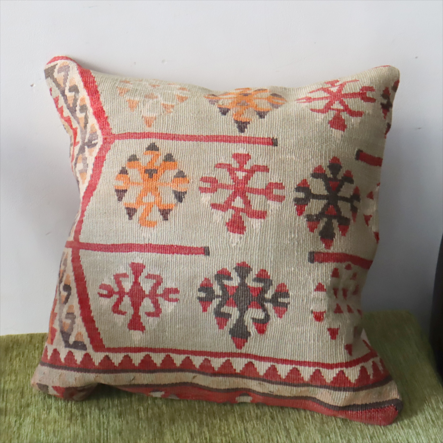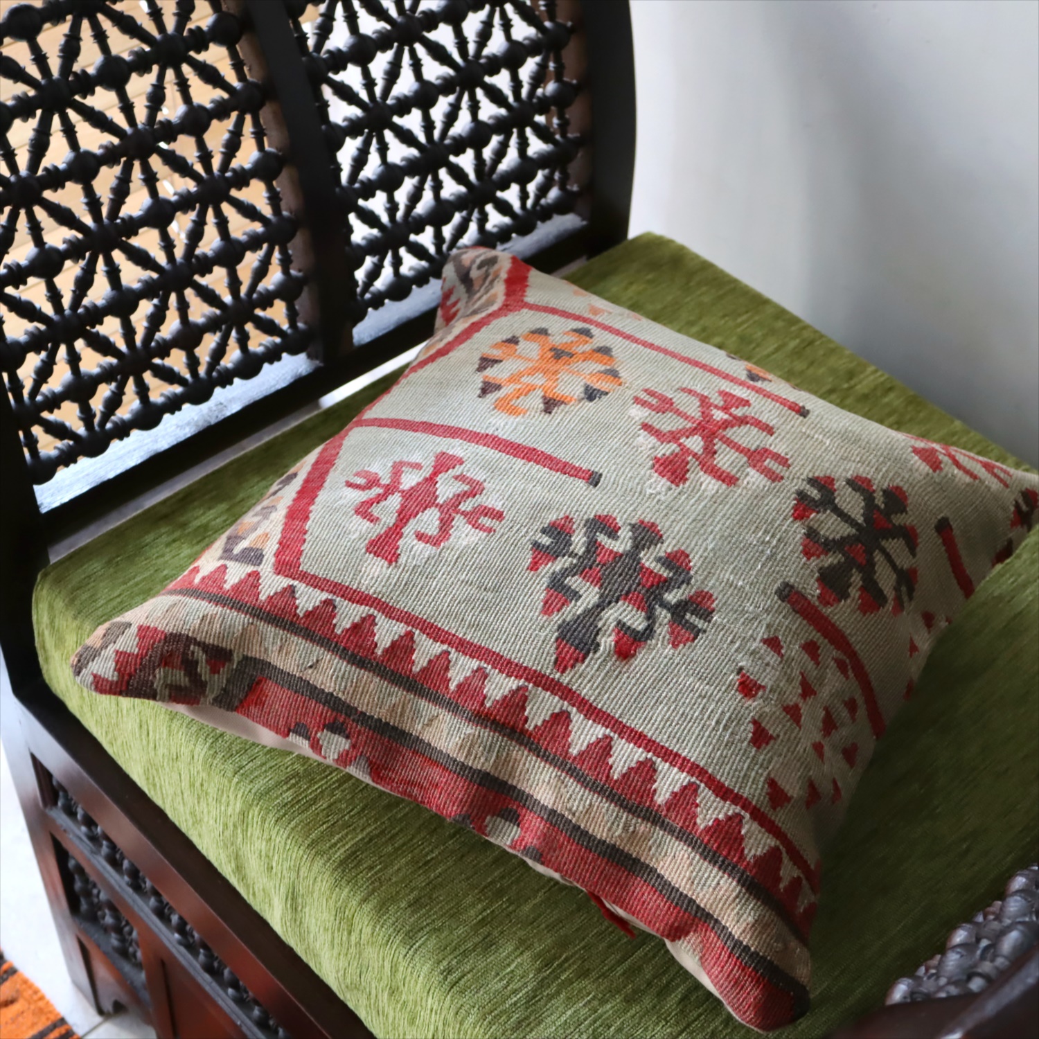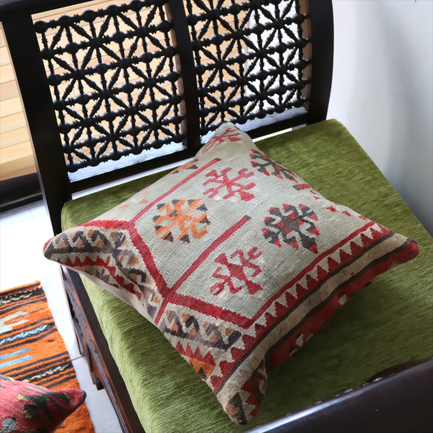 細い糸を使って織られた大型の平織りキリムをカットして作ったクッションカバーです。表面はウールのヴィンテージキリム、裏面は無地のコットン地です。