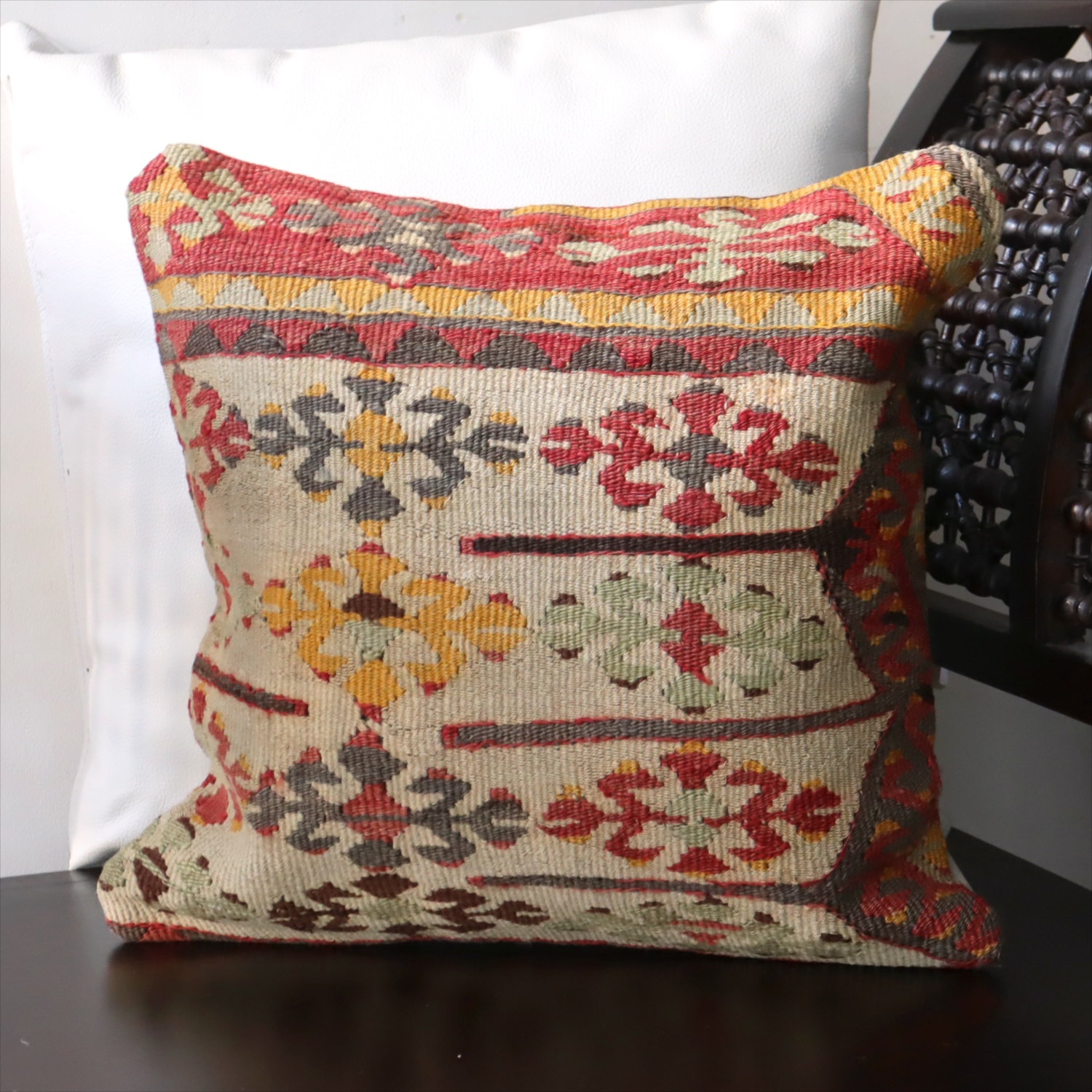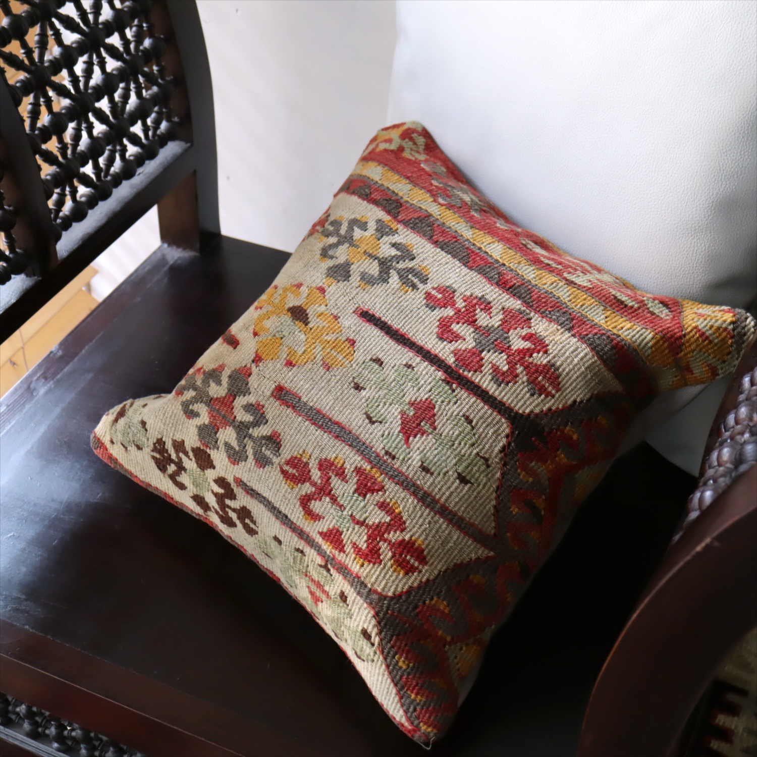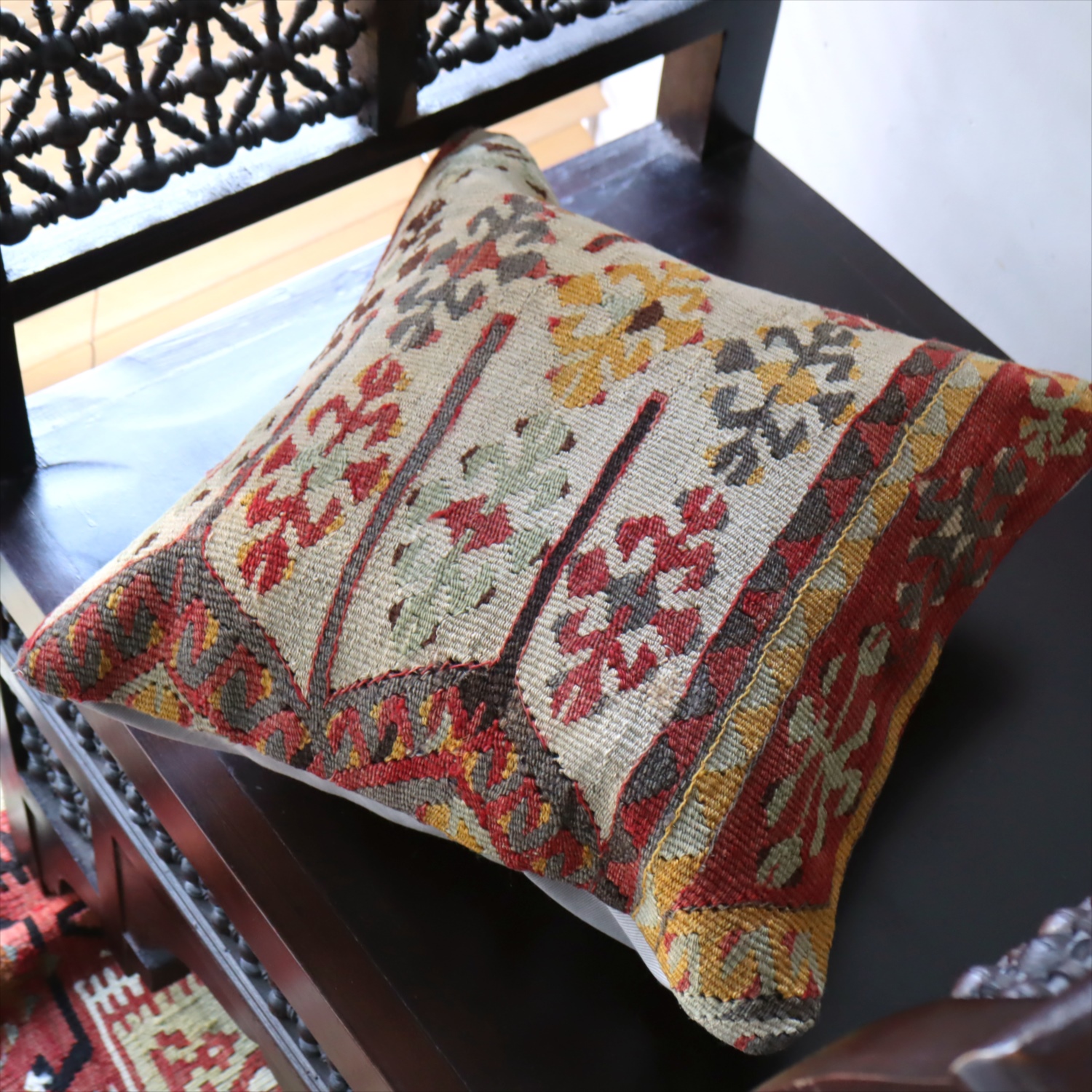 細い糸を使って織られた大型の平織りキリムをカットして作ったクッションカバーです。表面はウールのヴィンテージキリム、裏面は無地のコットン地です。