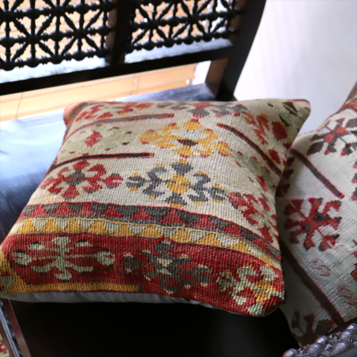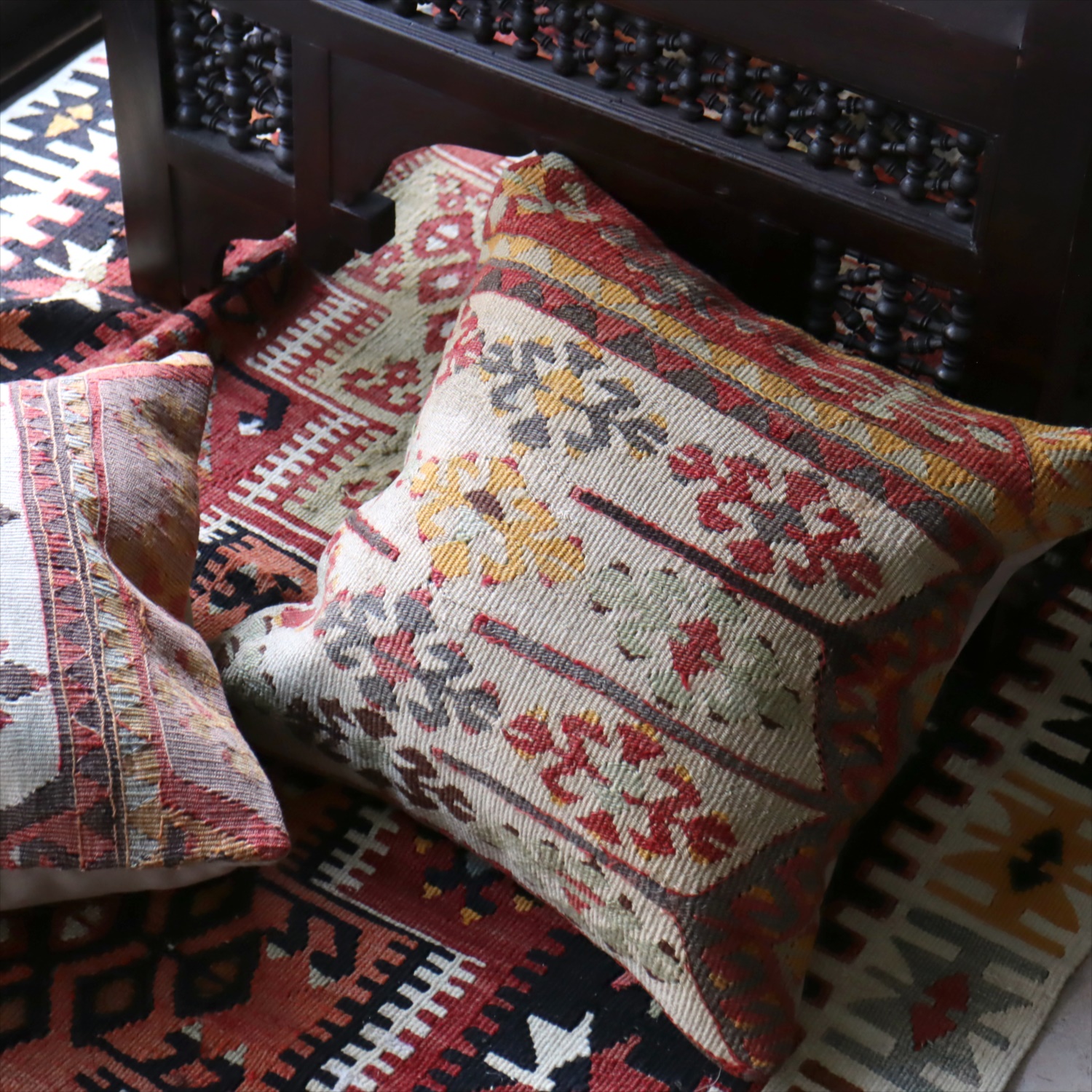 クッションカバーにすると、一枚のキリムから50枚以上に切り分けられるものもあり、配色が似ていてモチーフのバランスが違うクッションができあがります。