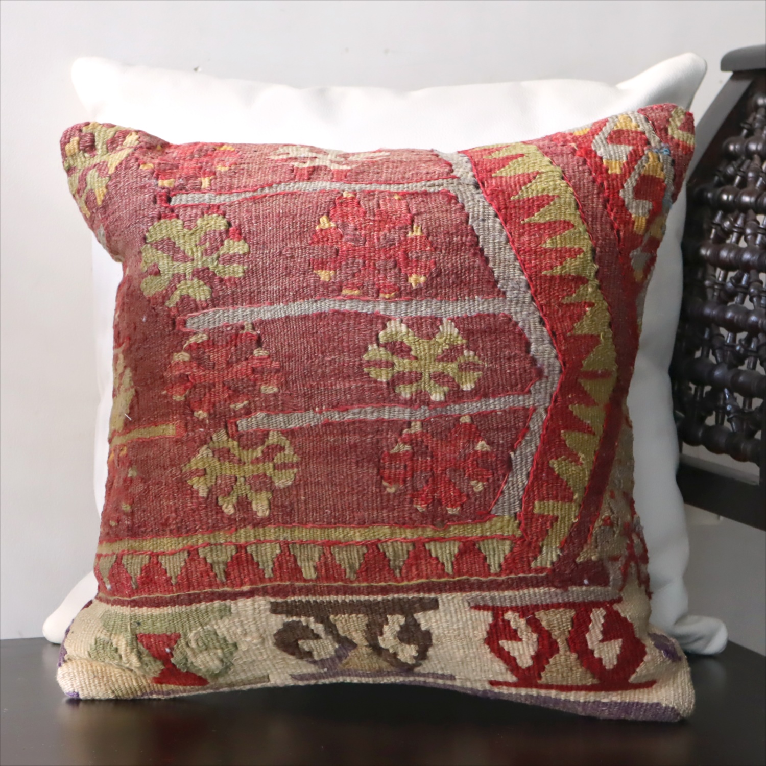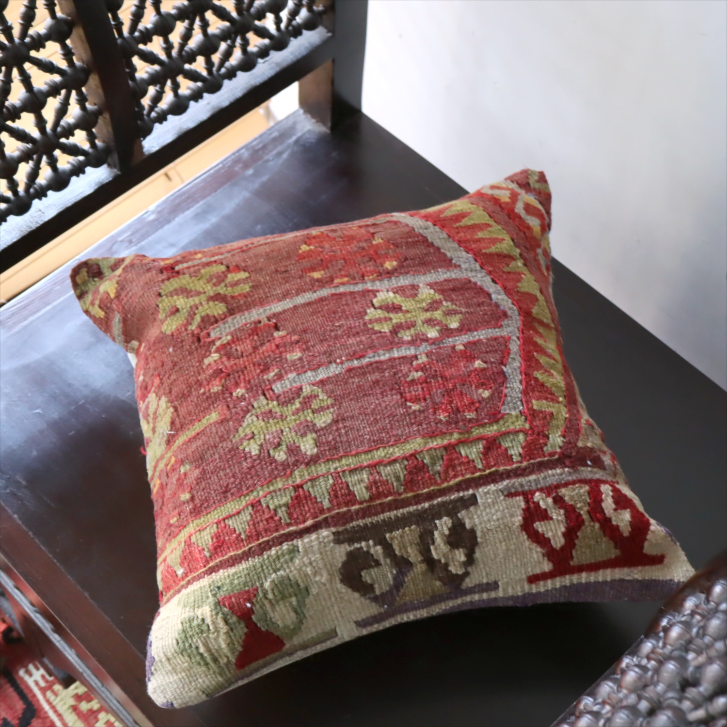 細い糸を使って織られた大型の平織りキリムをカットして作ったクッションカバーです。表面はウールのヴィンテージキリム、裏面は無地のコットン地です。