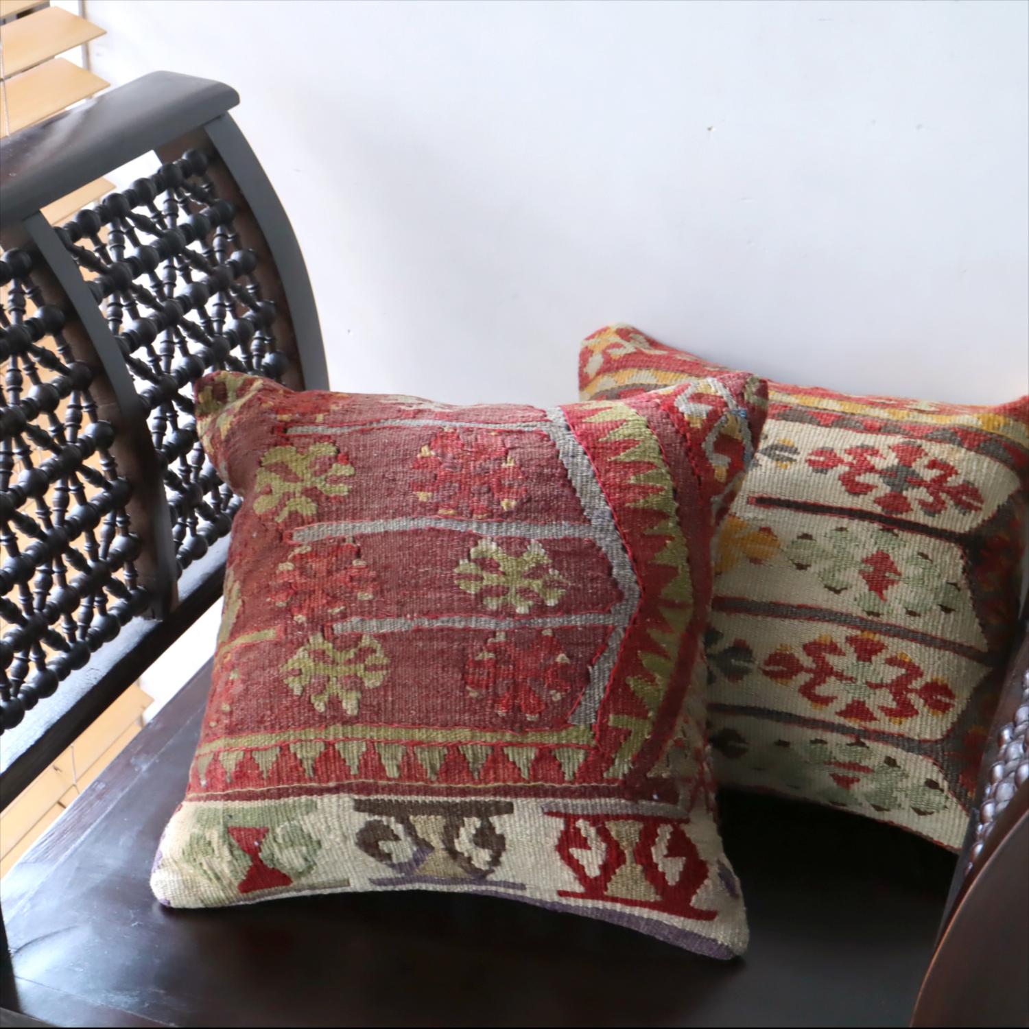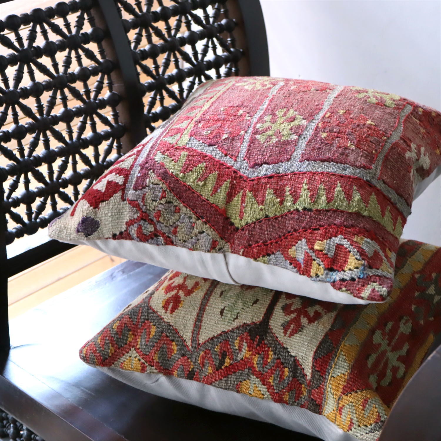 クッションカバーにすると、一枚のキリムから50枚以上に切り分けられるものもあり、配色が似ていてモチーフのバランスが違うクッションができあがります。