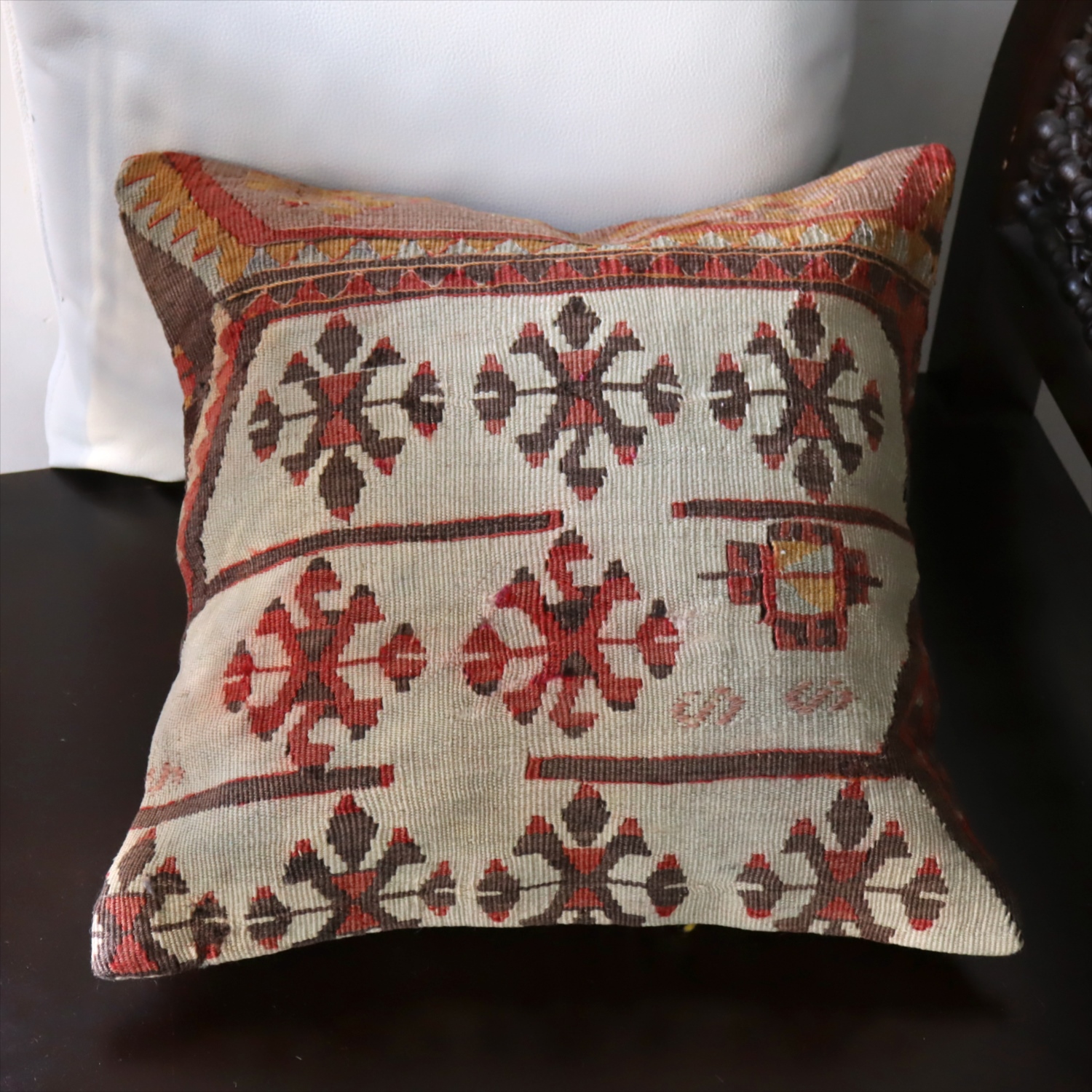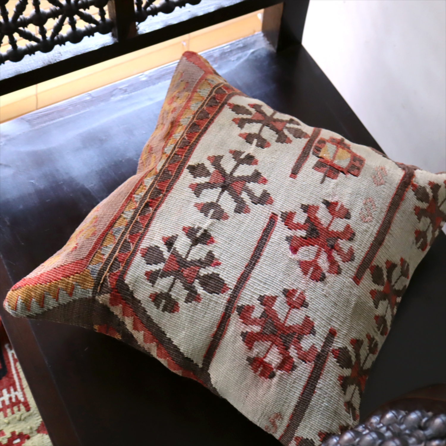 細い糸を使って織られた大型の平織りキリムをカットして作ったクッションカバーです。表面はウールのヴィンテージキリム、裏面は無地のコットン地です。